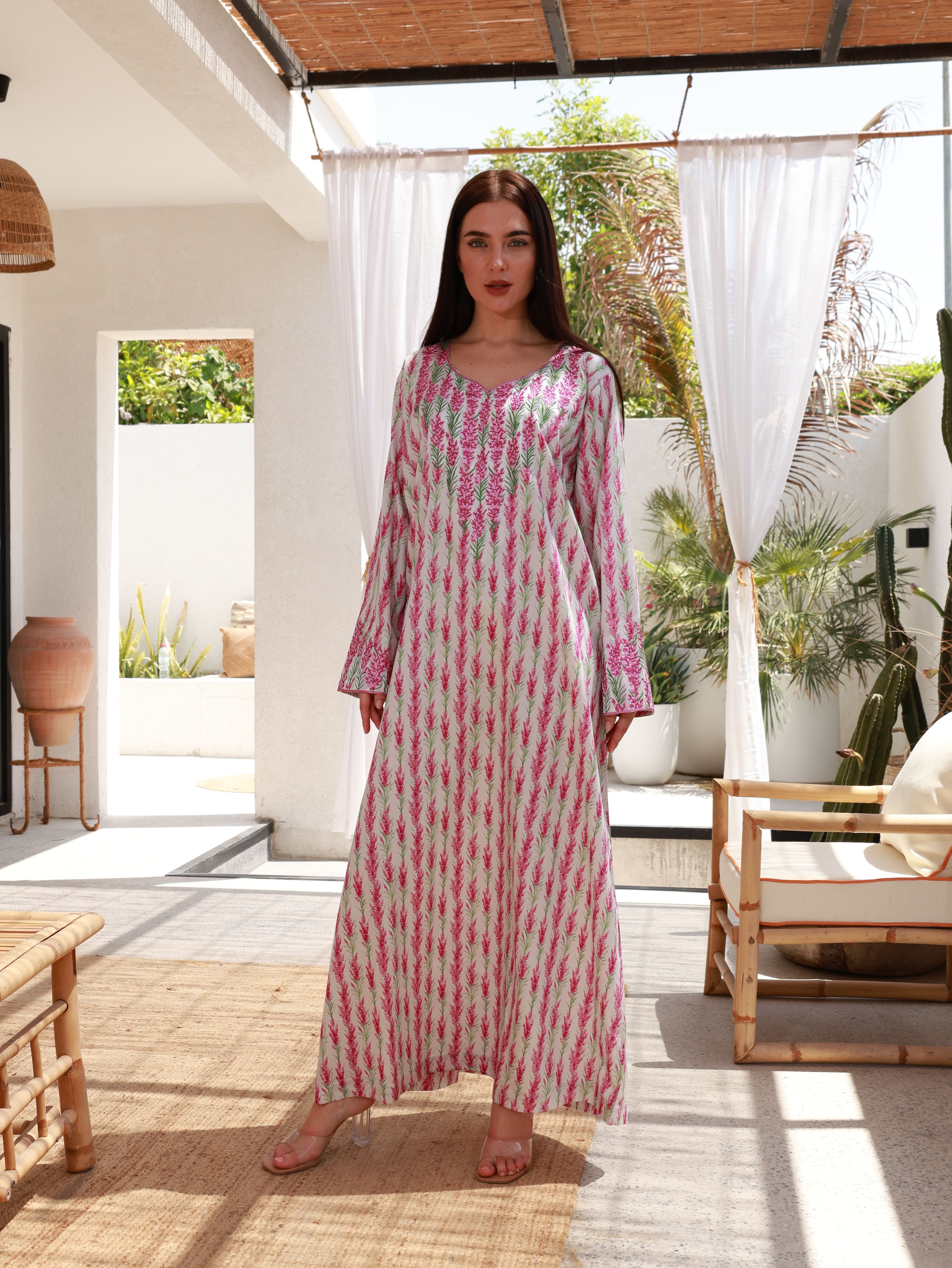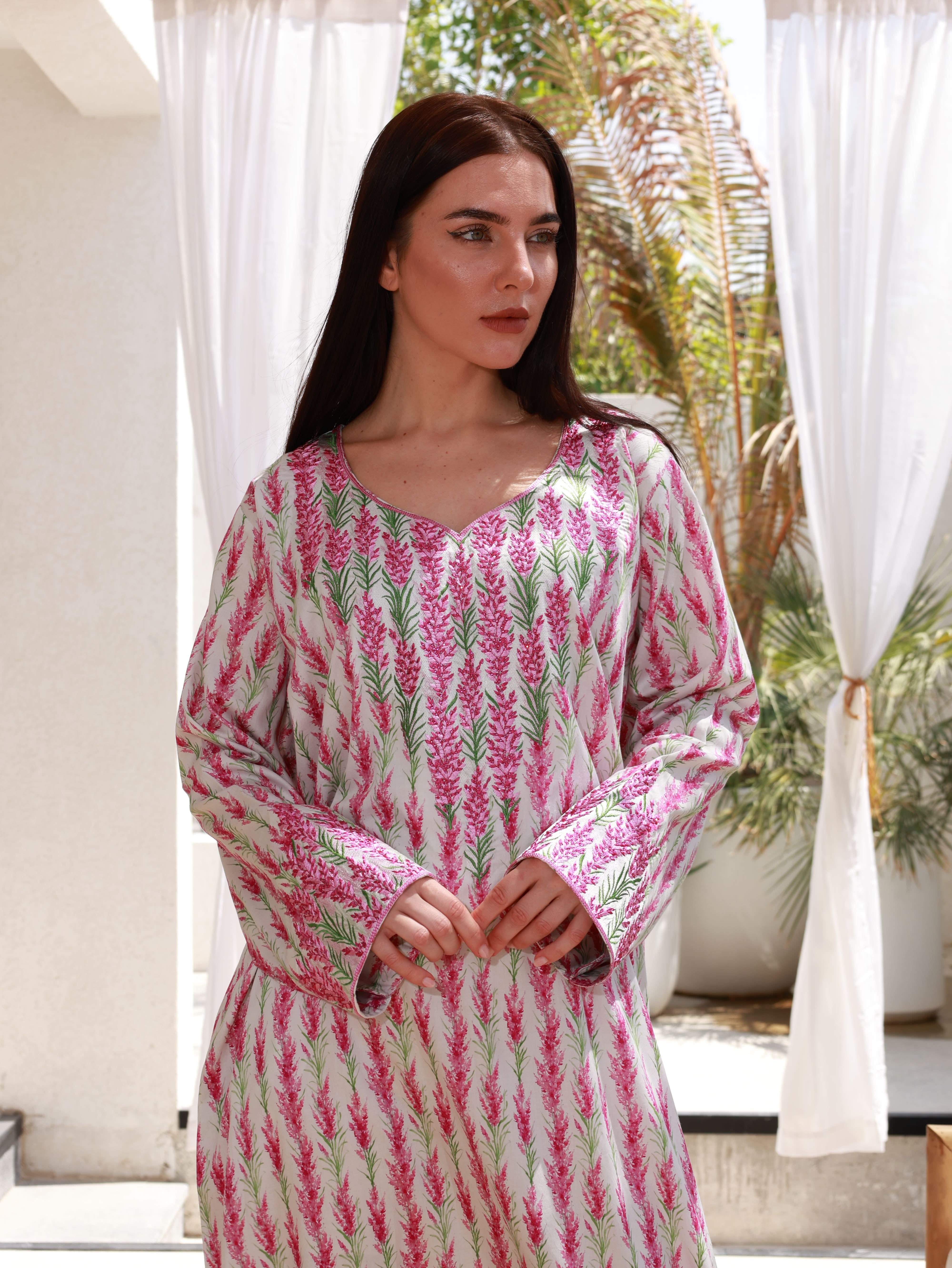 A white cotton mukhawara adorned with soft pink and green floral prints, featuring delicate machine embroidery on the neckline and sleeves, enhanced with sparkling stone embellishments for a graceful, elegant finish.