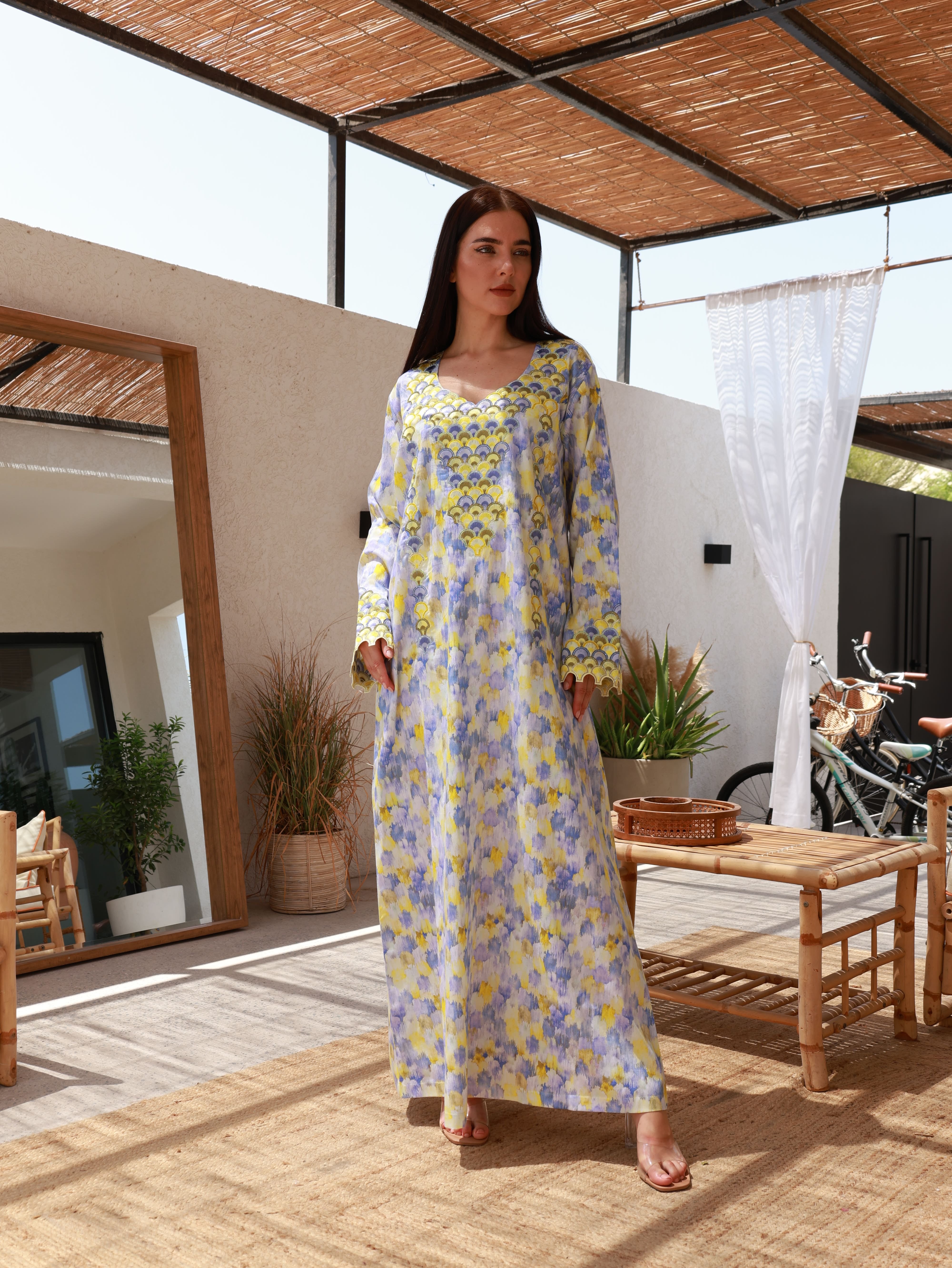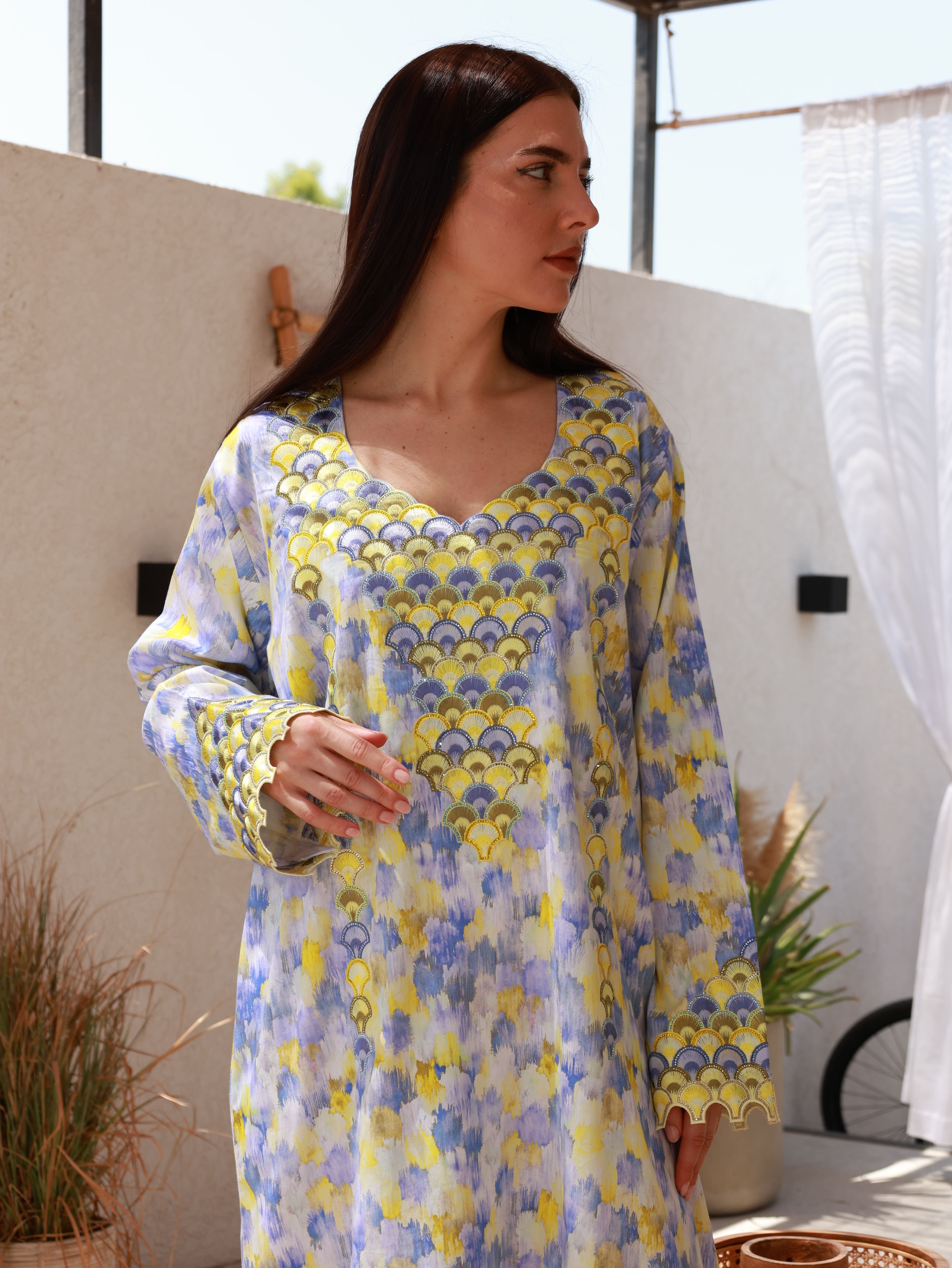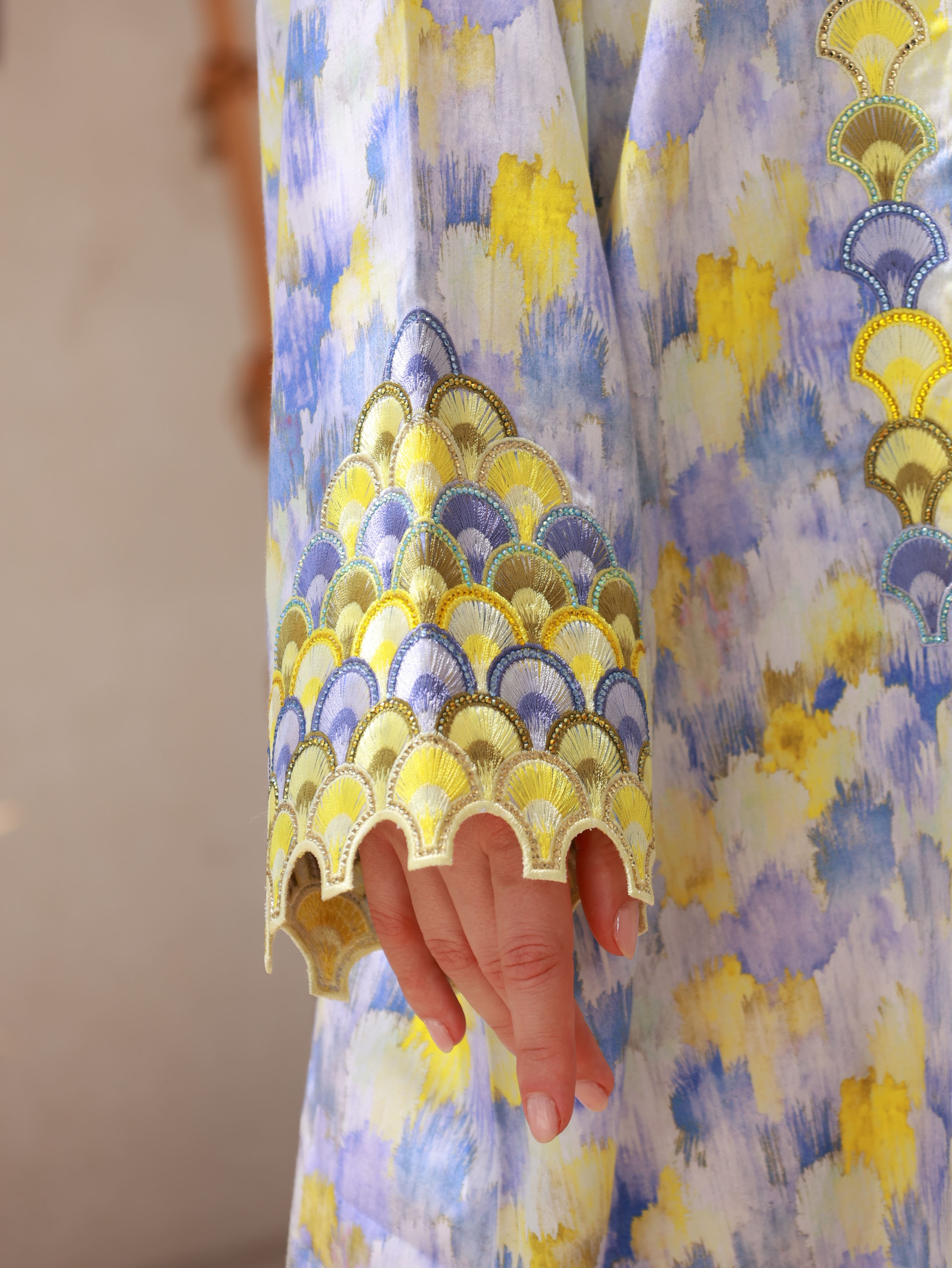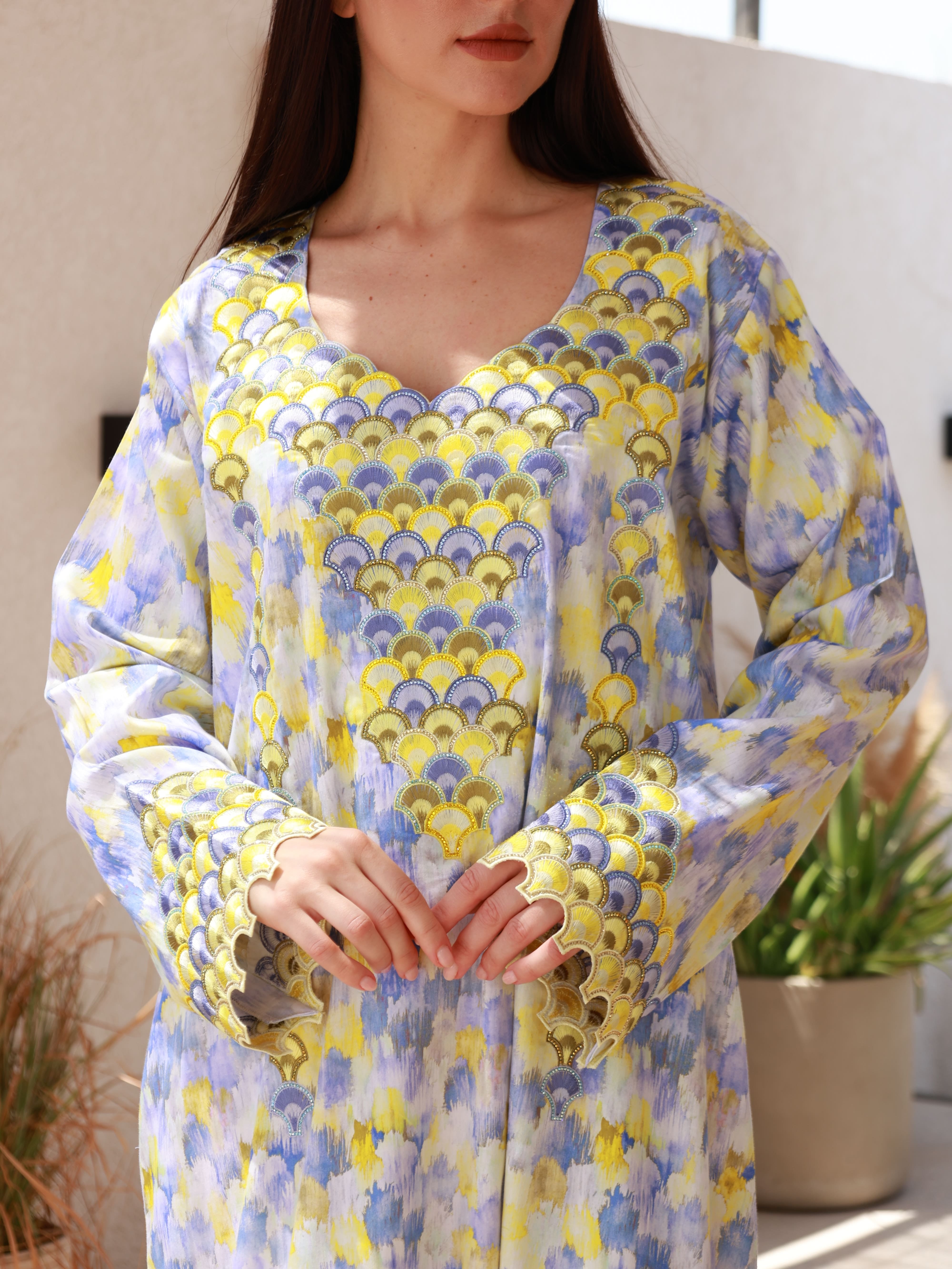 A vibrant lemon yellow cotton mukhawara in delicate printed fabric, featuring intricate machine embroidery with sparkling stones on the neckline and sleeves, complemented by elegant laser-cut detailing on the sleeves for a sophisticated and graceful finish.