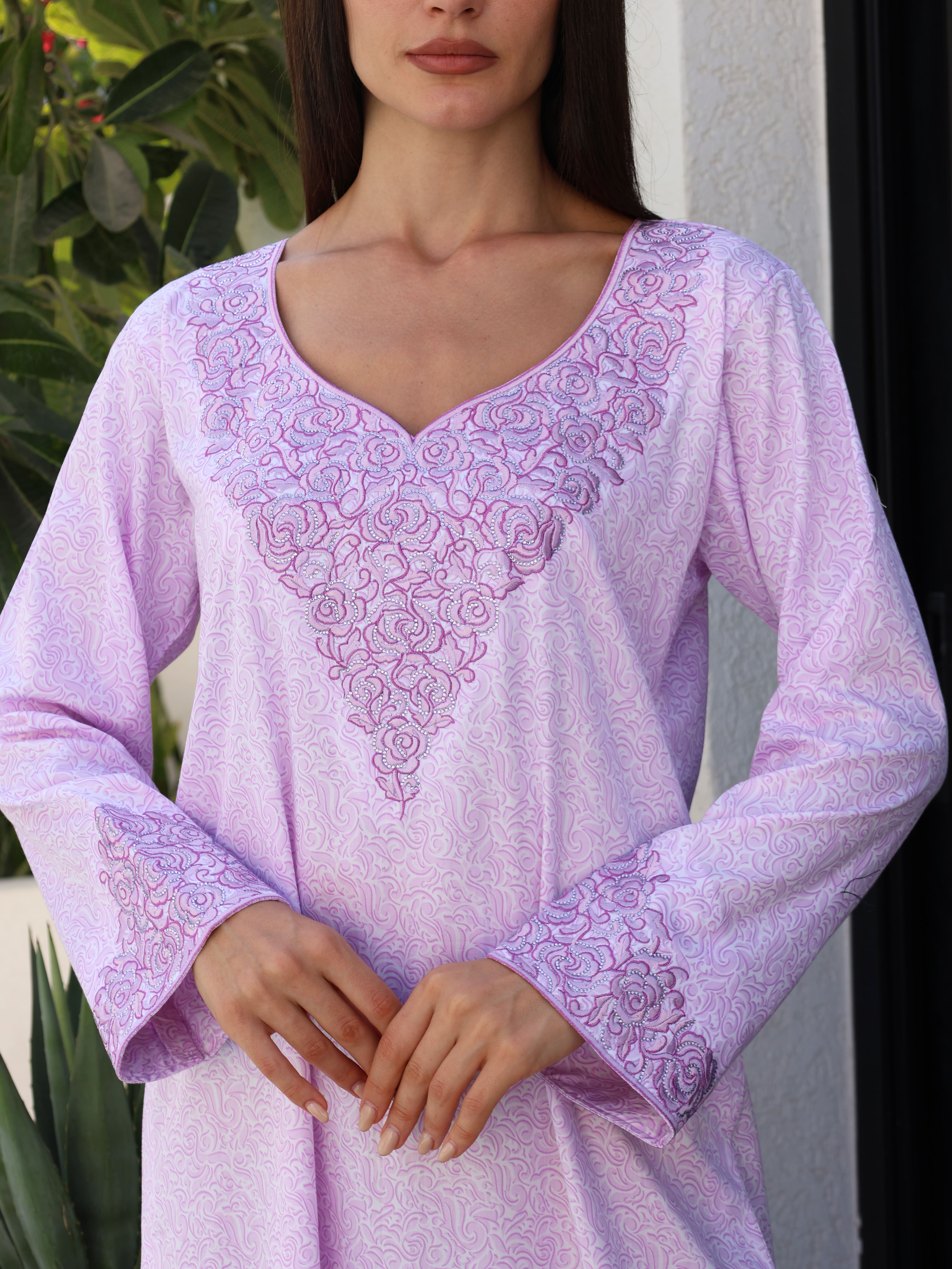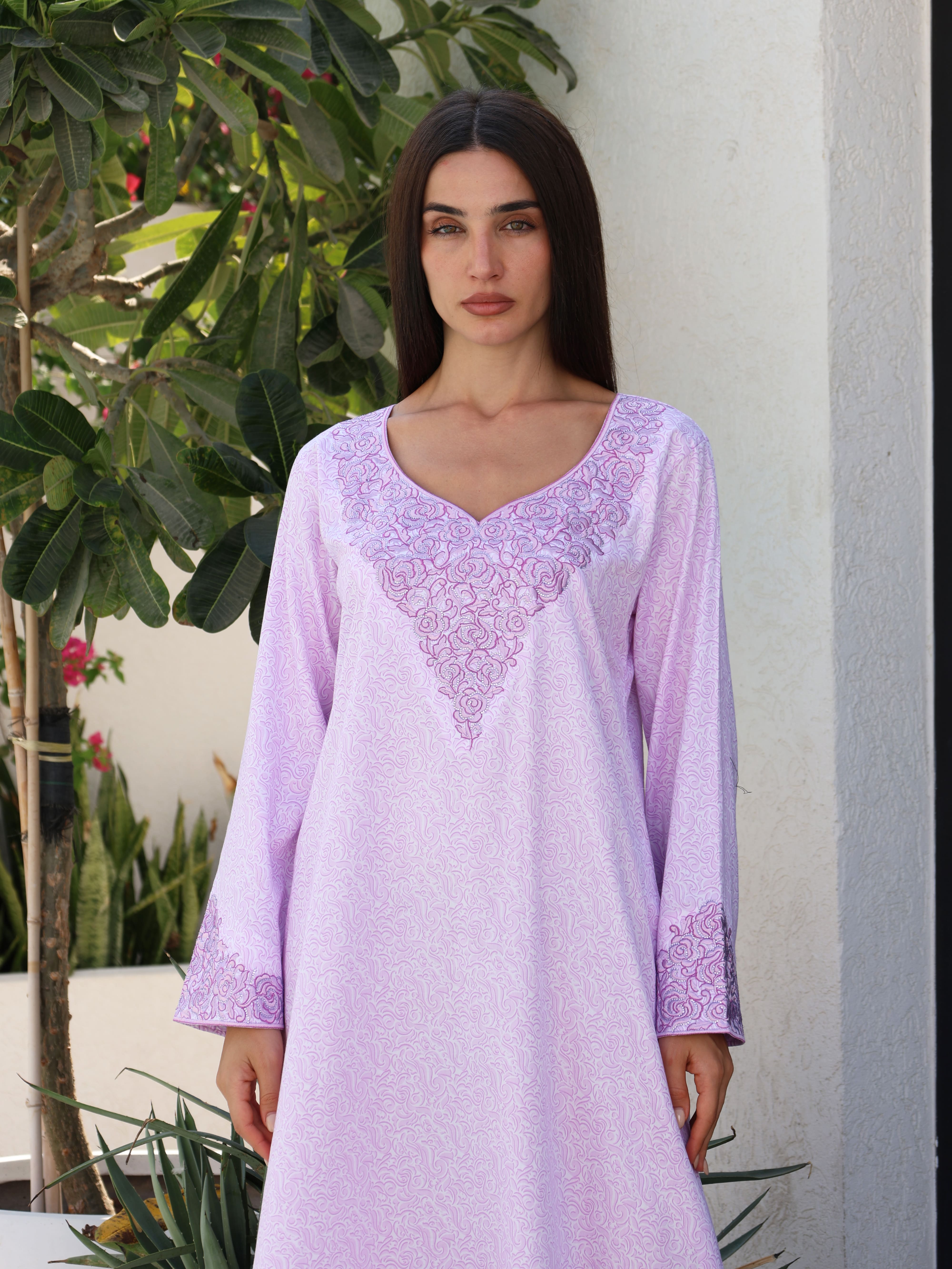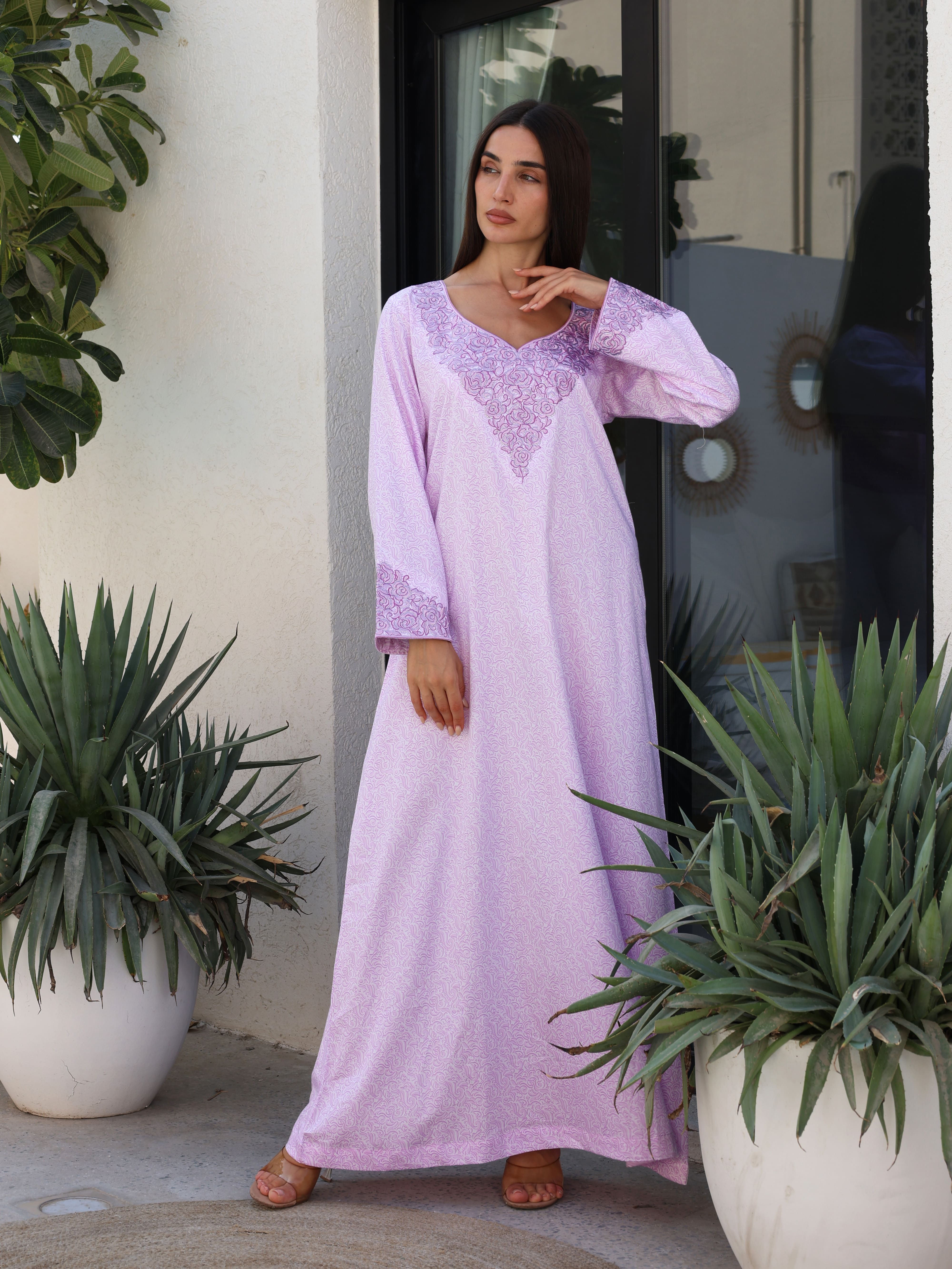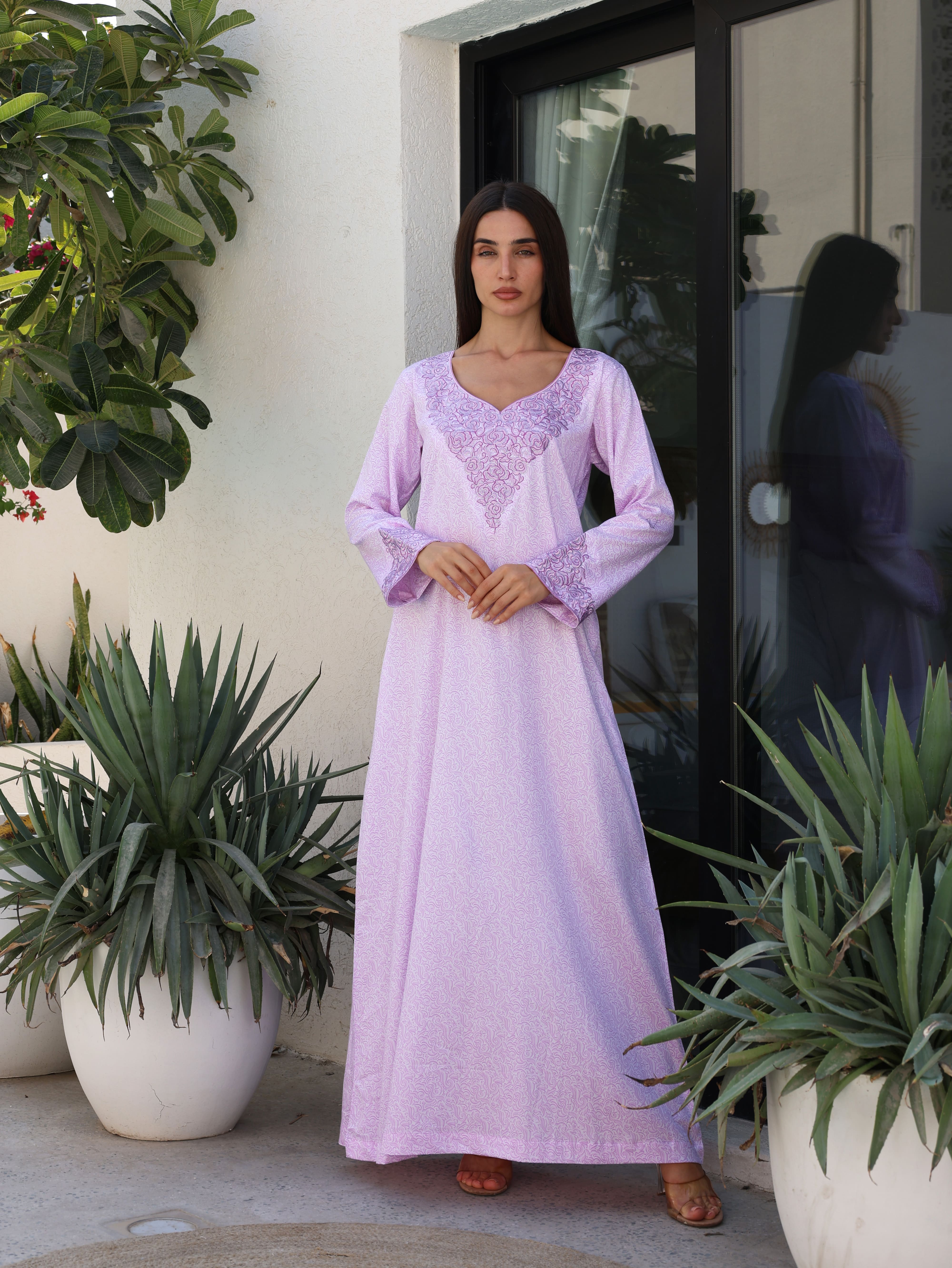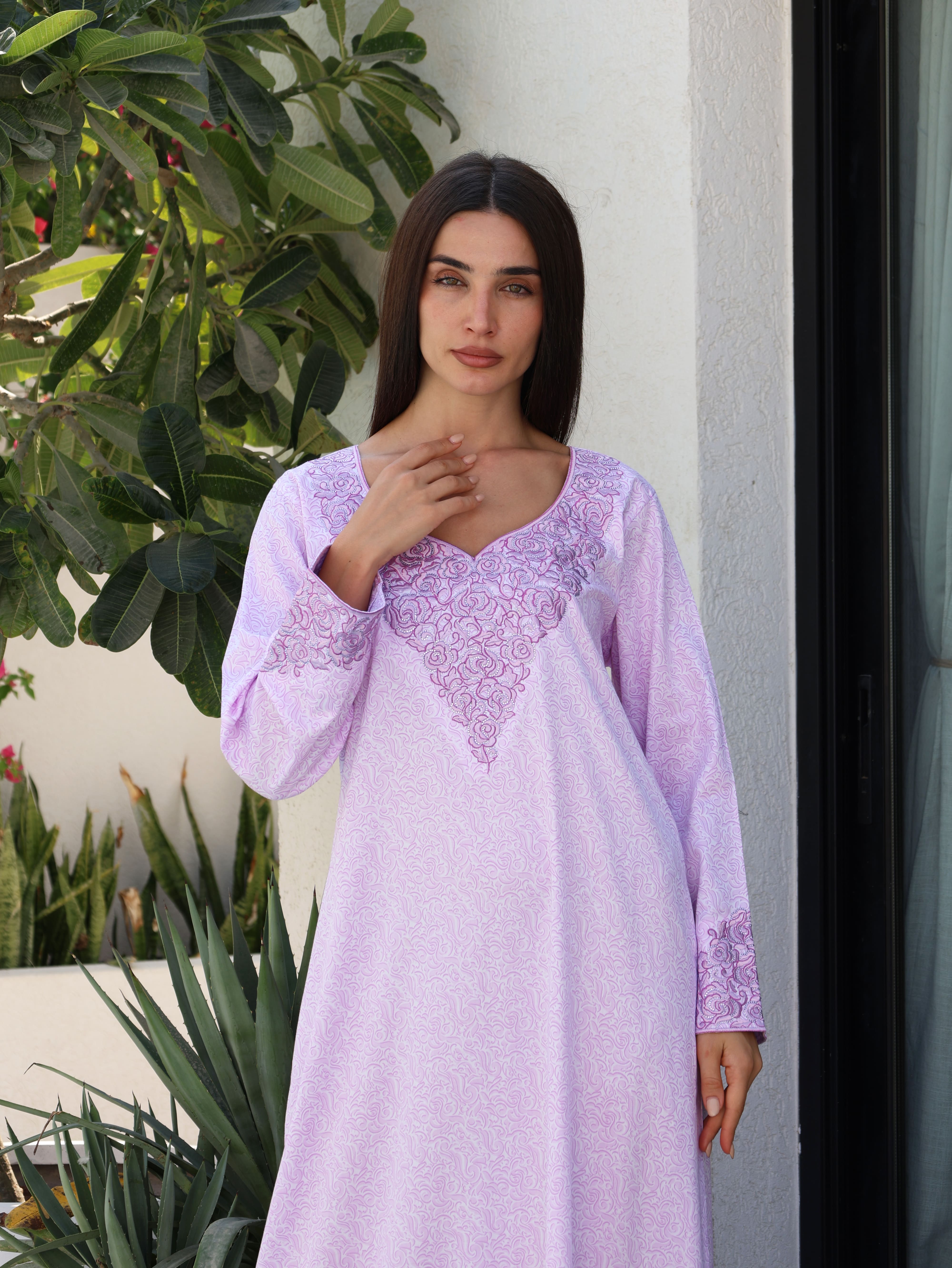 A purple cotton mukhawara adorned with soft floral prints, exuding a regal and feminine charm. The neckline and sleeves feature intricate machine embroidery with delicate stone detailing, adding a subtle sparkle to its elegant and graceful design