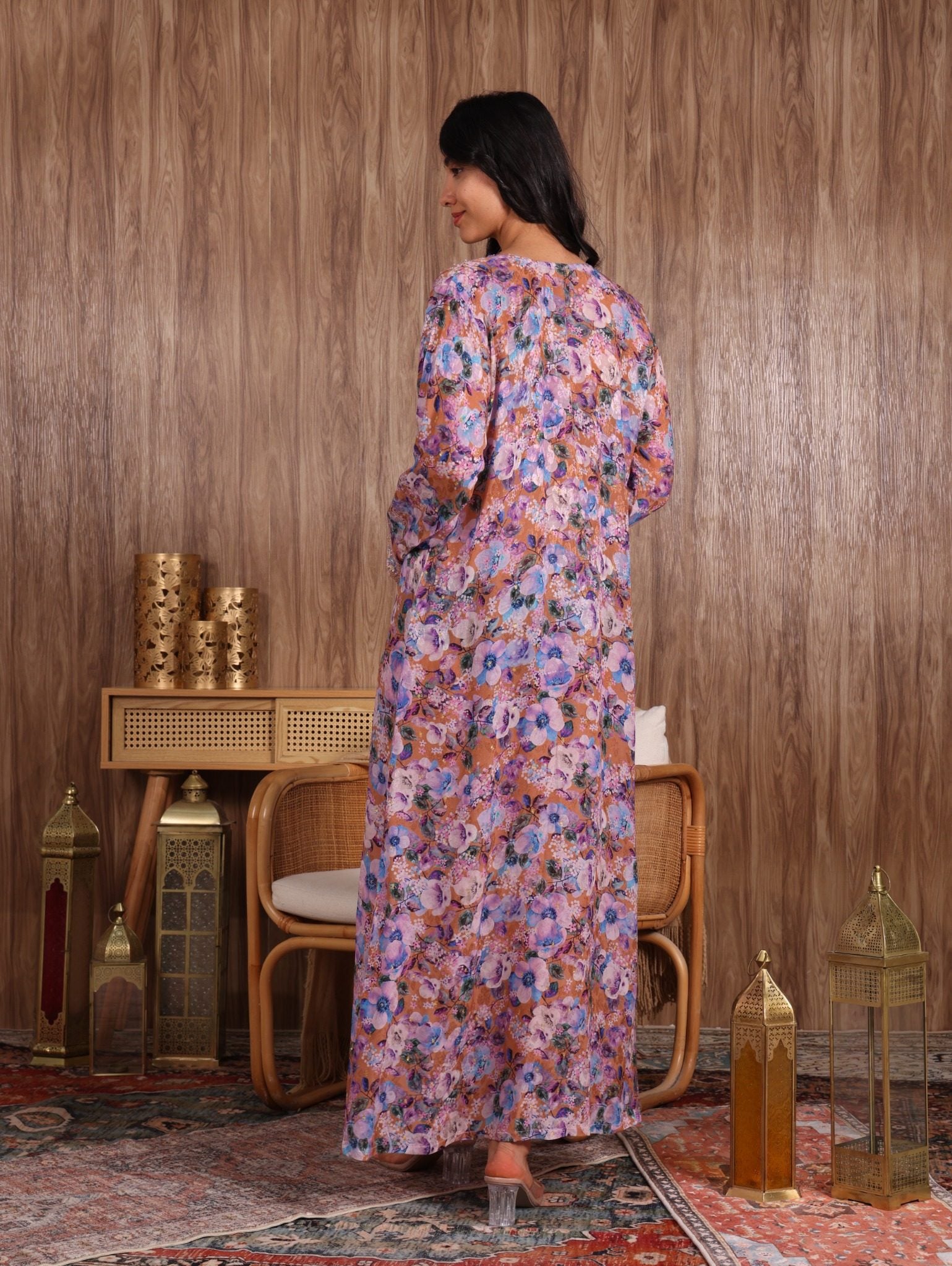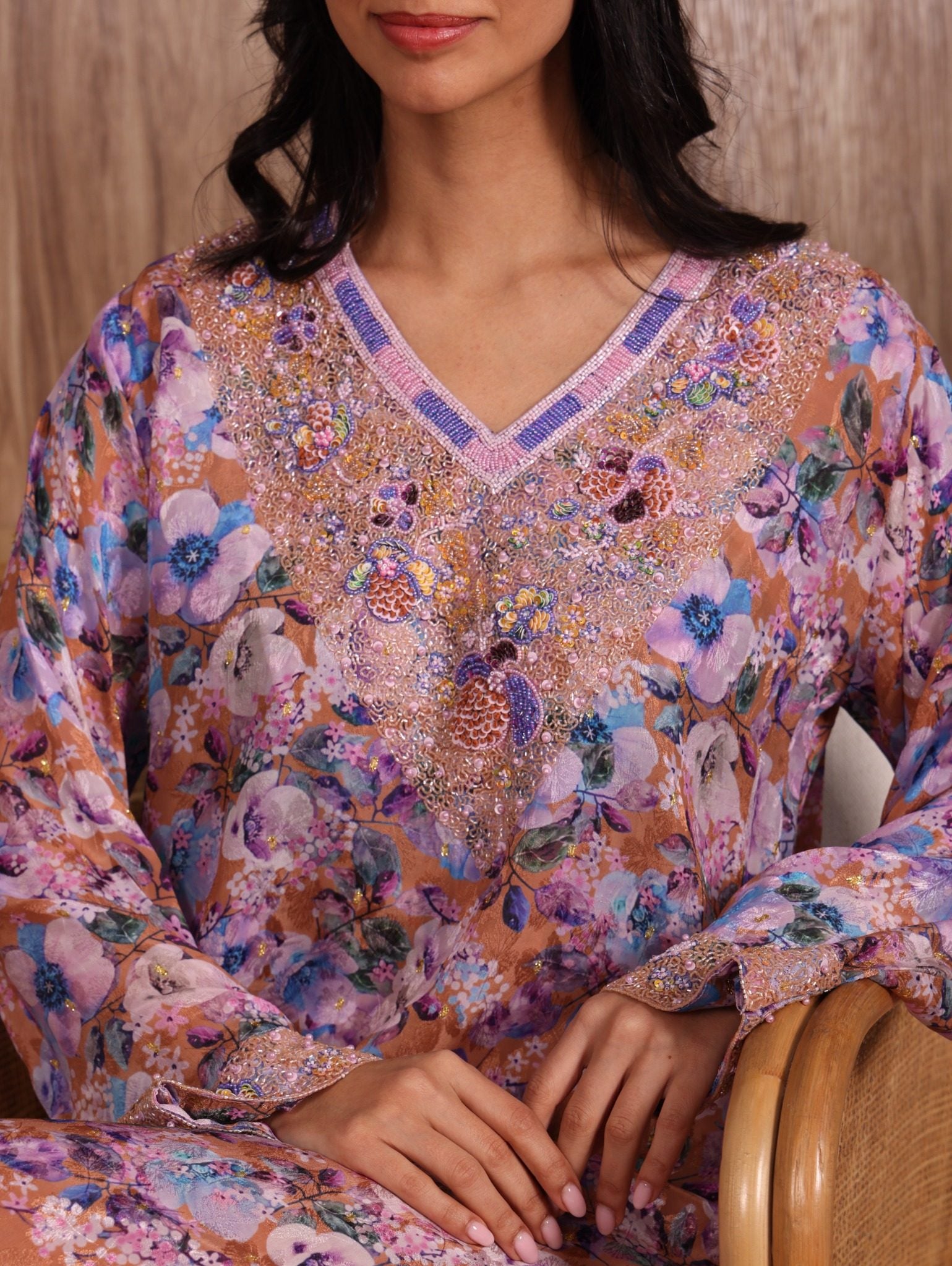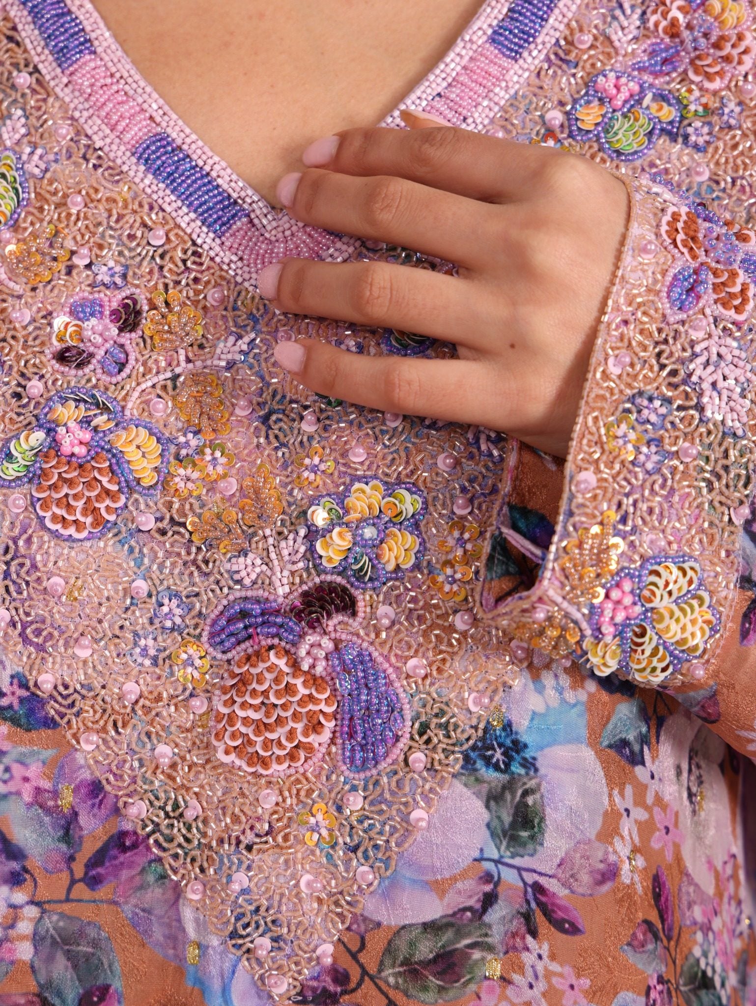 A warm amber-brown mukhwara adorned with soft watercolor florals in lilac, powder blue, blush pink, and muted ivory, creating a romantic and graceful palette. The neckline and sleeve cuffs feature intricate hand-embellished beadwork with pastel sequins and delicate zari accents in rose gold, lavender, and gold tones, adding depth and refined elegance.