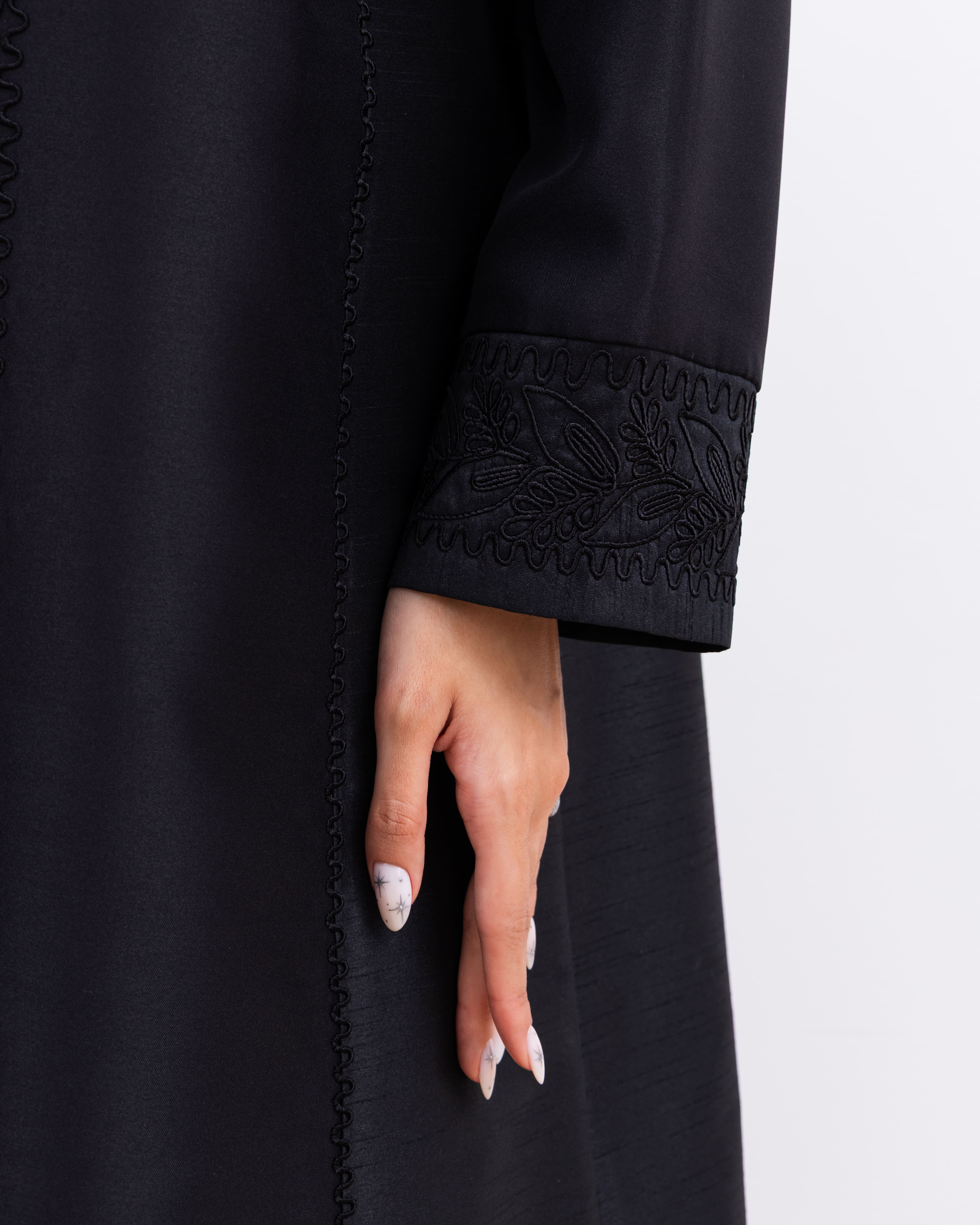 Structured yet soulful, this black abaya in taffeta fabric redefines quiet strength. The matte finish and crisp texture give it a commanding silhouette — bold, sculpted, and full of presence. Flowing with grace yet holding its form, it speaks of elegance with purpose. Intricate aari work blooms across the body and sleeves like whispers of tradition woven into a modern frame. It’s a statement of contrast — where stiffness meets softness, and simplicity wears sophistication like a crown.
