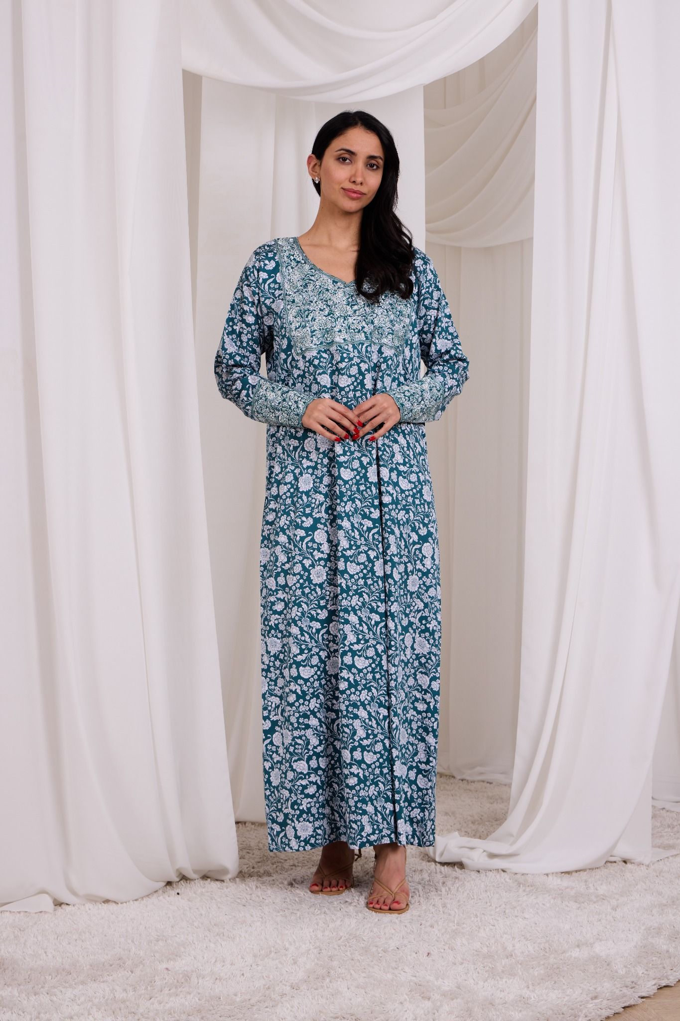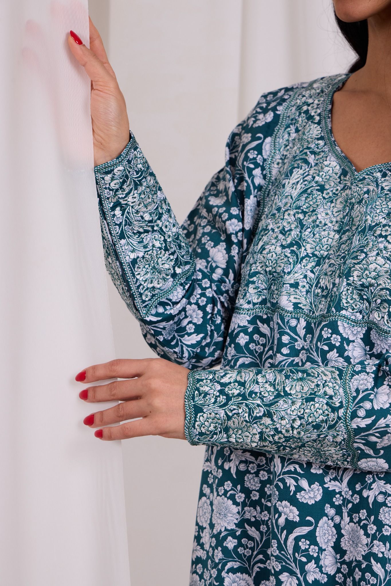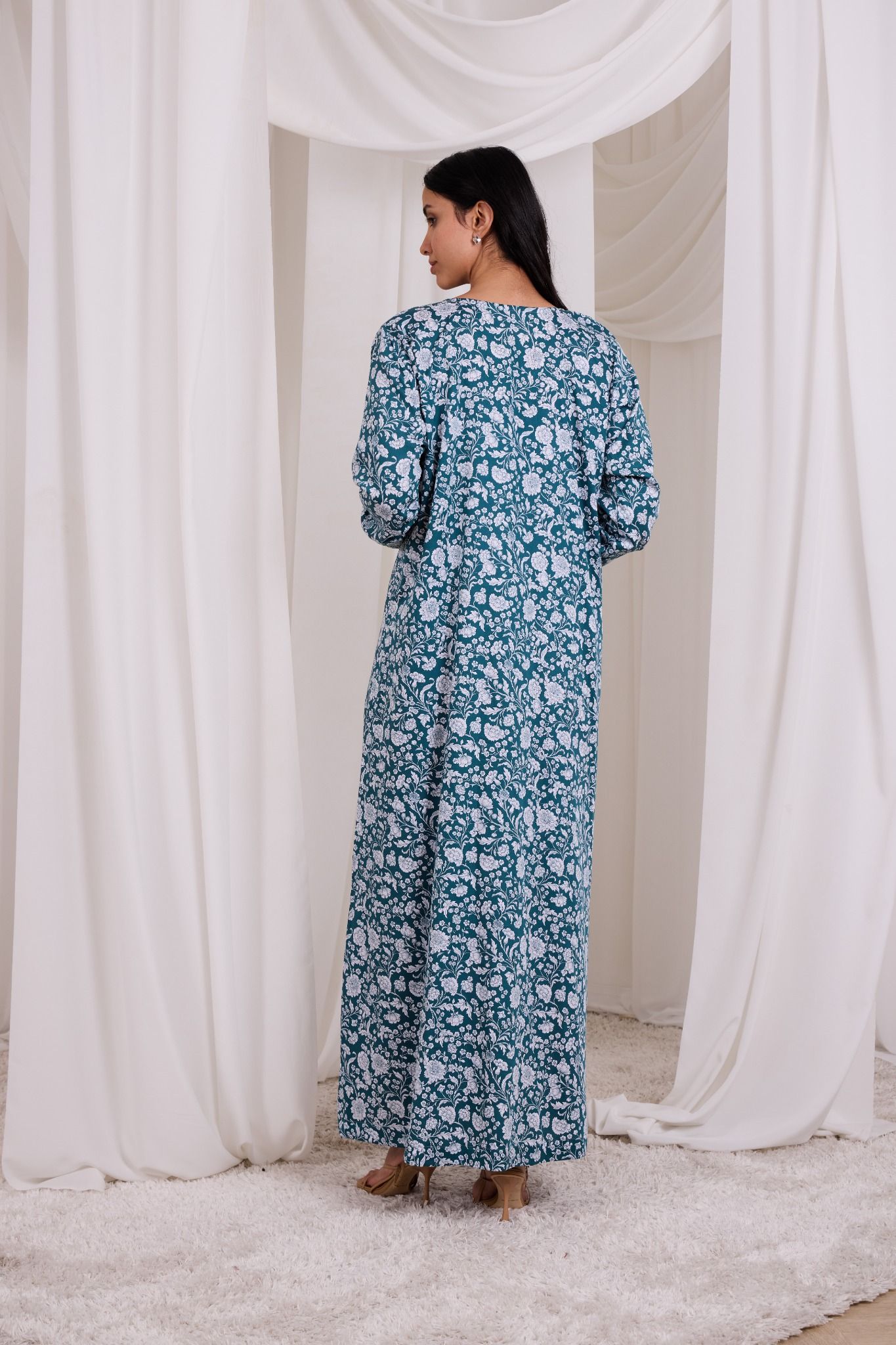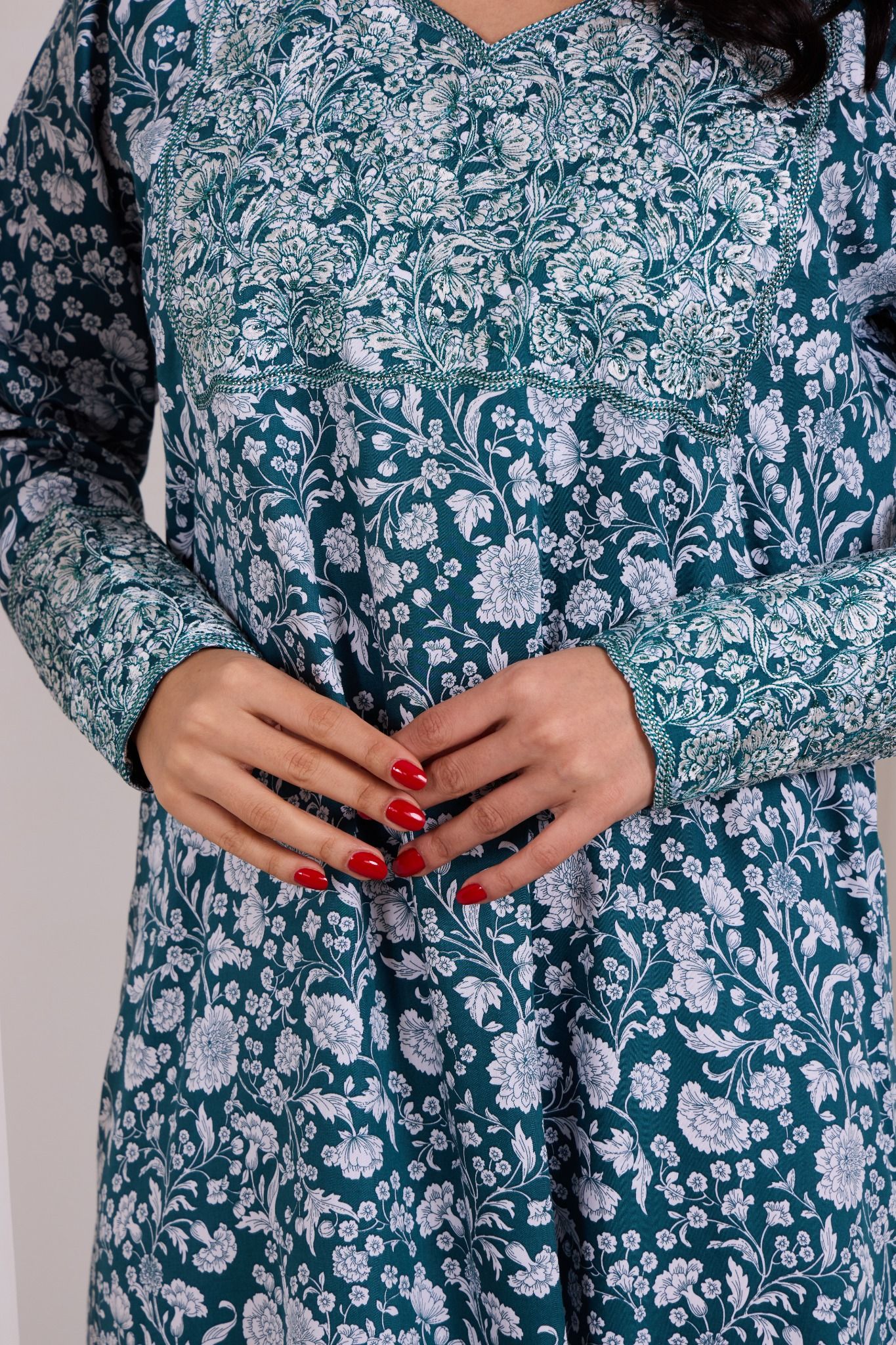 A teal mukhawara adorned with intricate all-over floral prints in soft ivory tones, creating a timeless and graceful appeal. The neckline, yoke, and sleeve cuffs are highlighted with detailed contrasting print panels, adding depth and refined elegance to the silhouette. Designed for effortless comfort with a flowing, relaxed fit.
