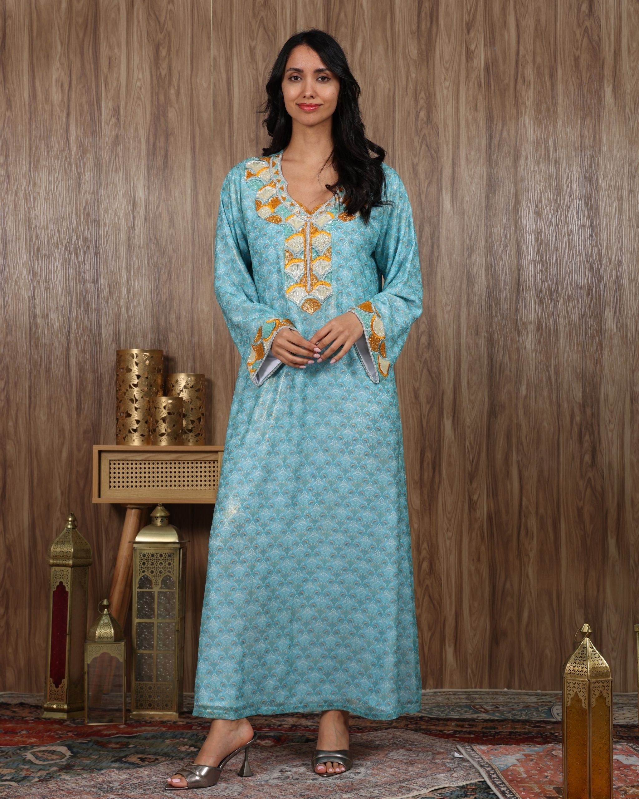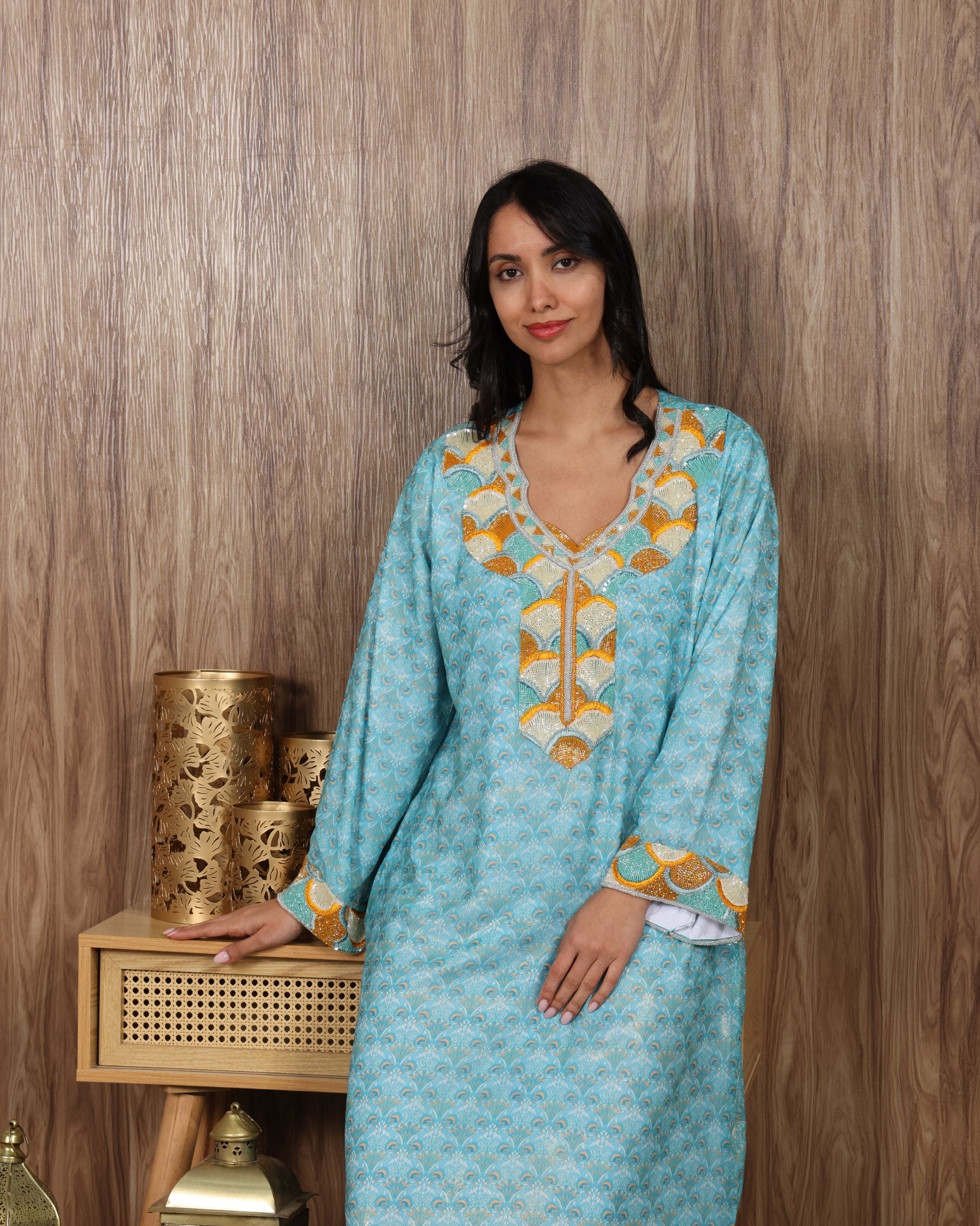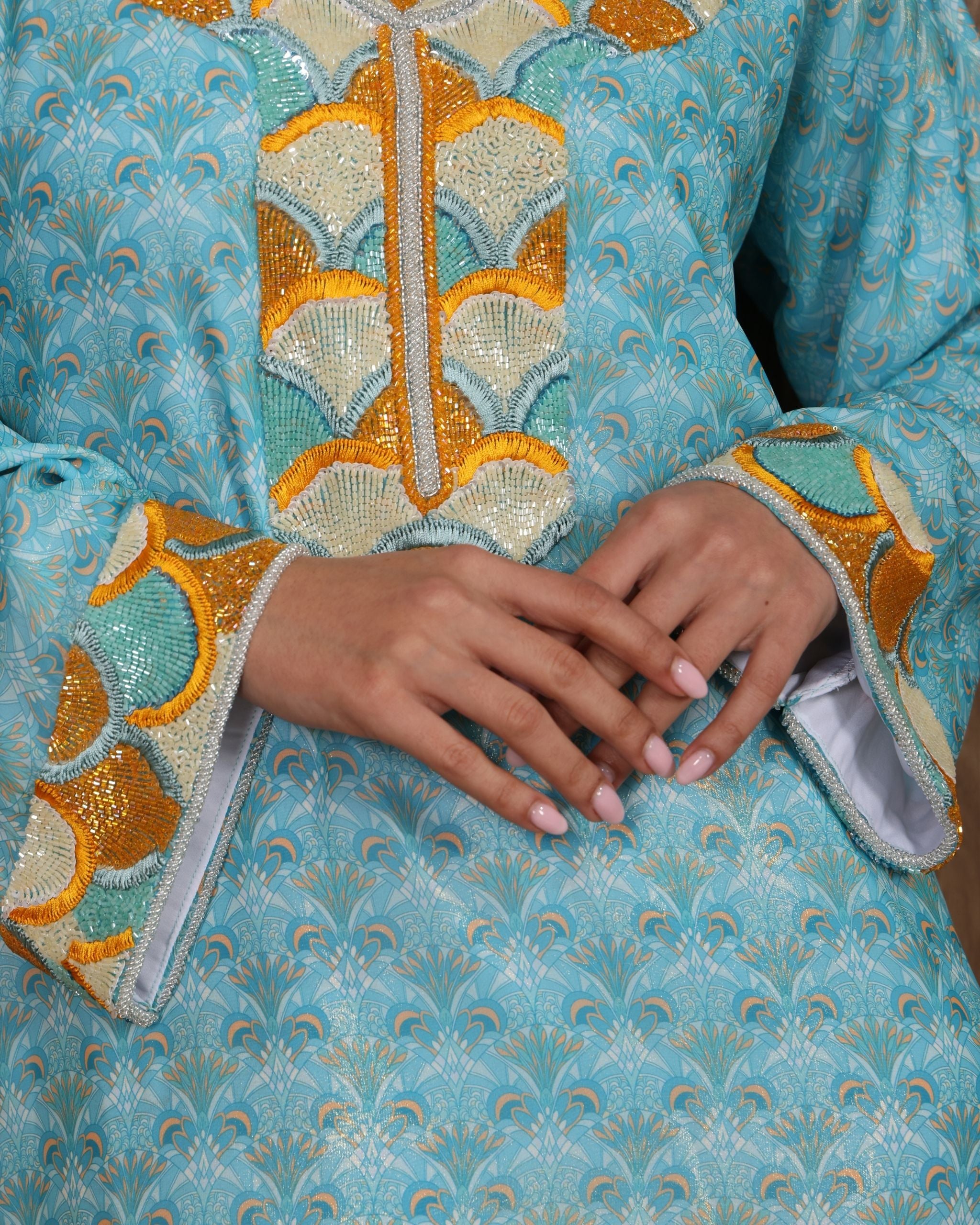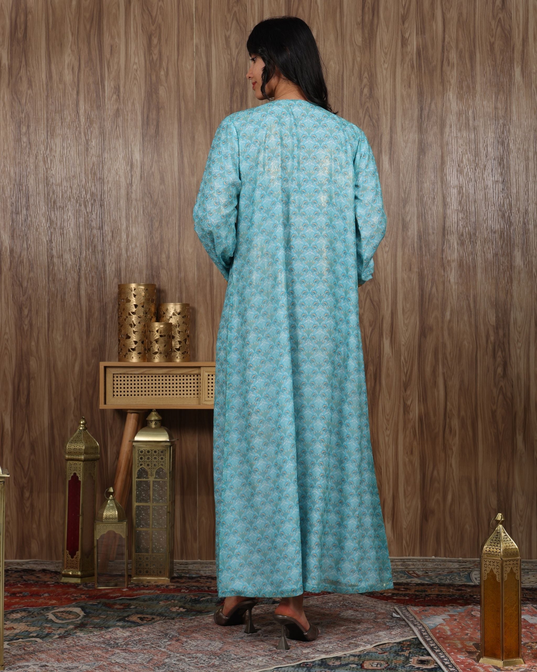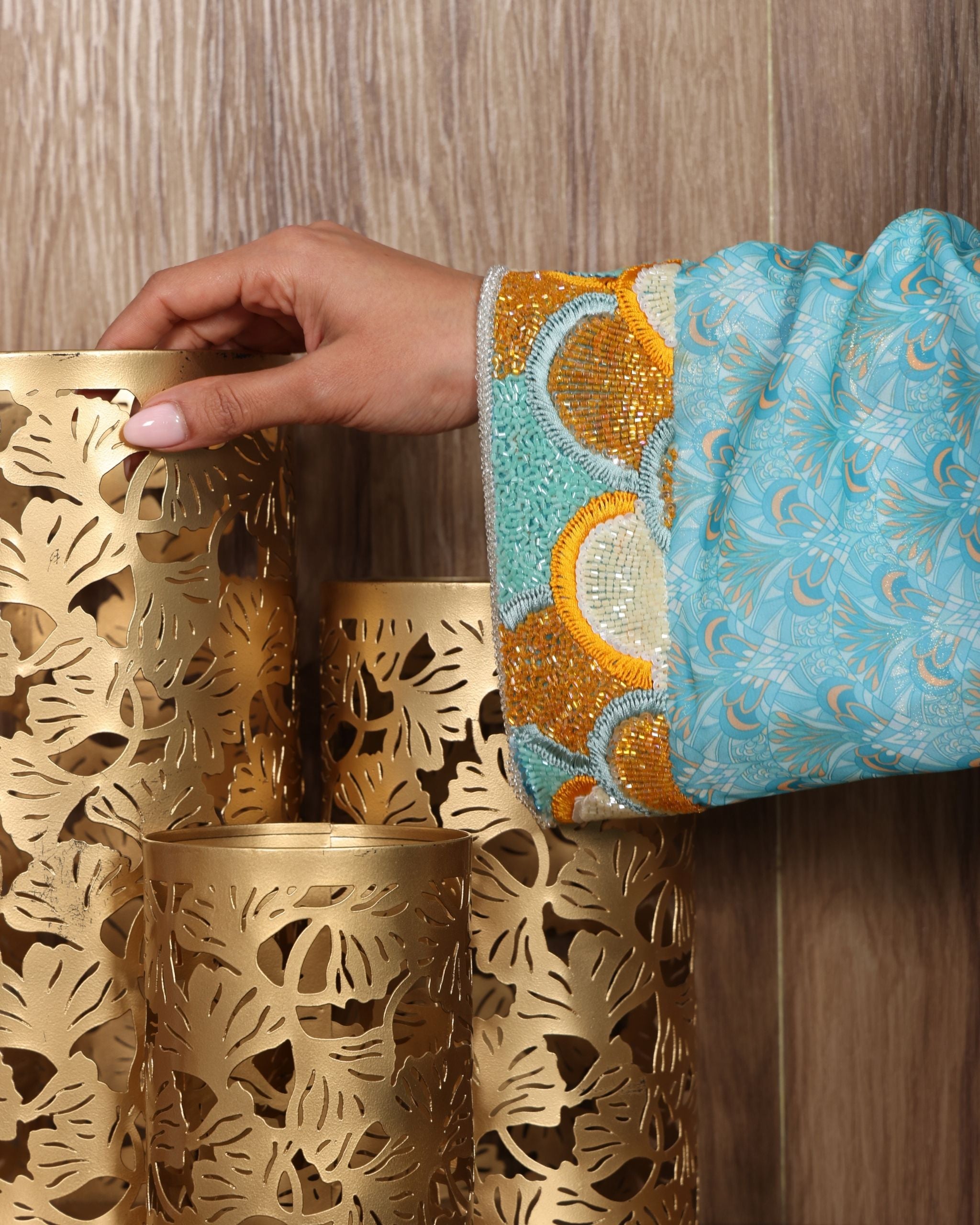 Lightweight yet regal, this luxury chiffon mukhwara is woven with fine gold thread that creates a soft, luminous shimmer, giving the piece an elegant and refined presence. The refreshing aqua blue base is enriched with delicate gold woven motifs, beautifully complemented by intricate hand-embellished detailing in soft ivory, aqua, and warm gold tones along the neckline and cuffs, adding depth and sophistication.