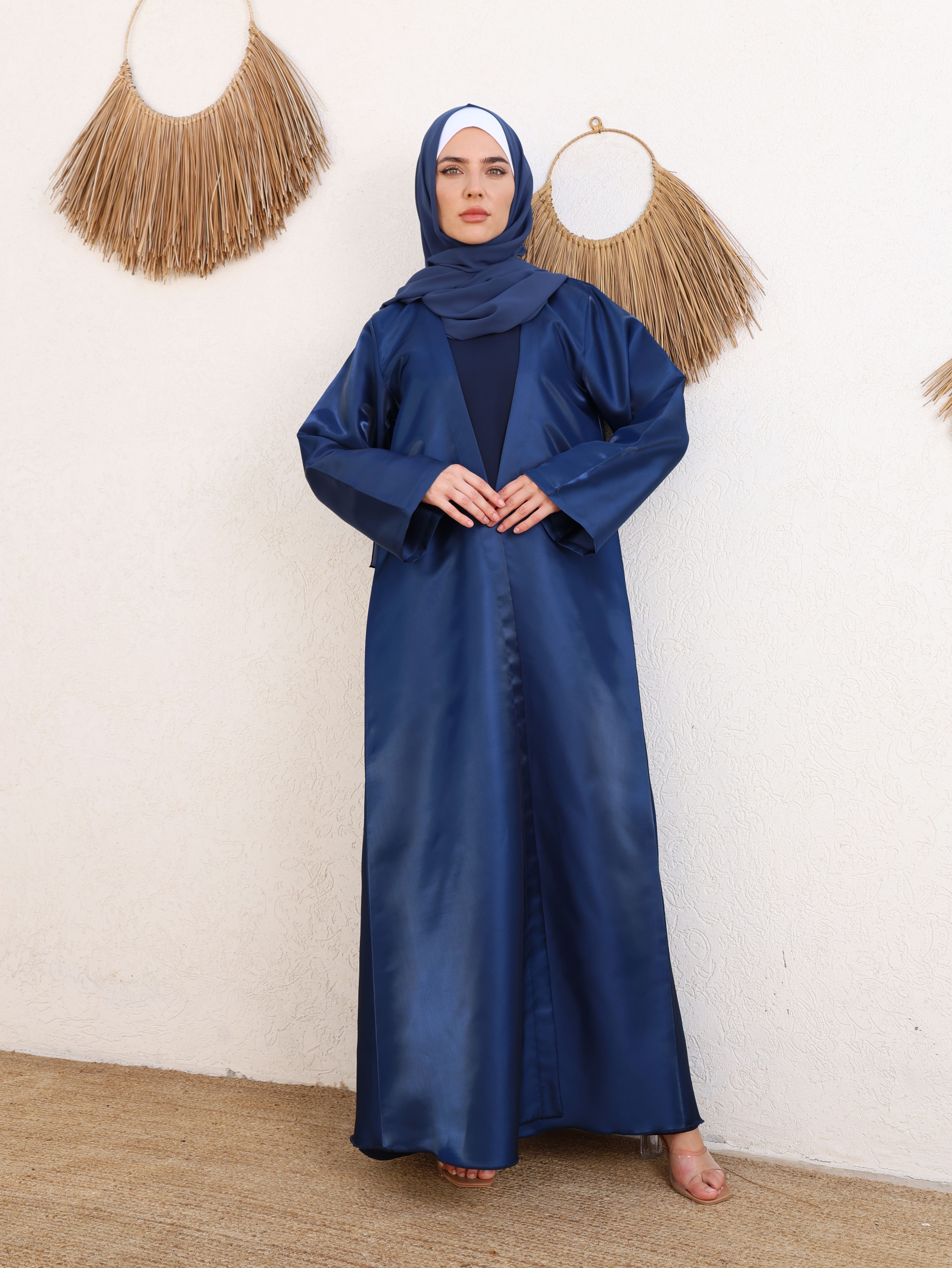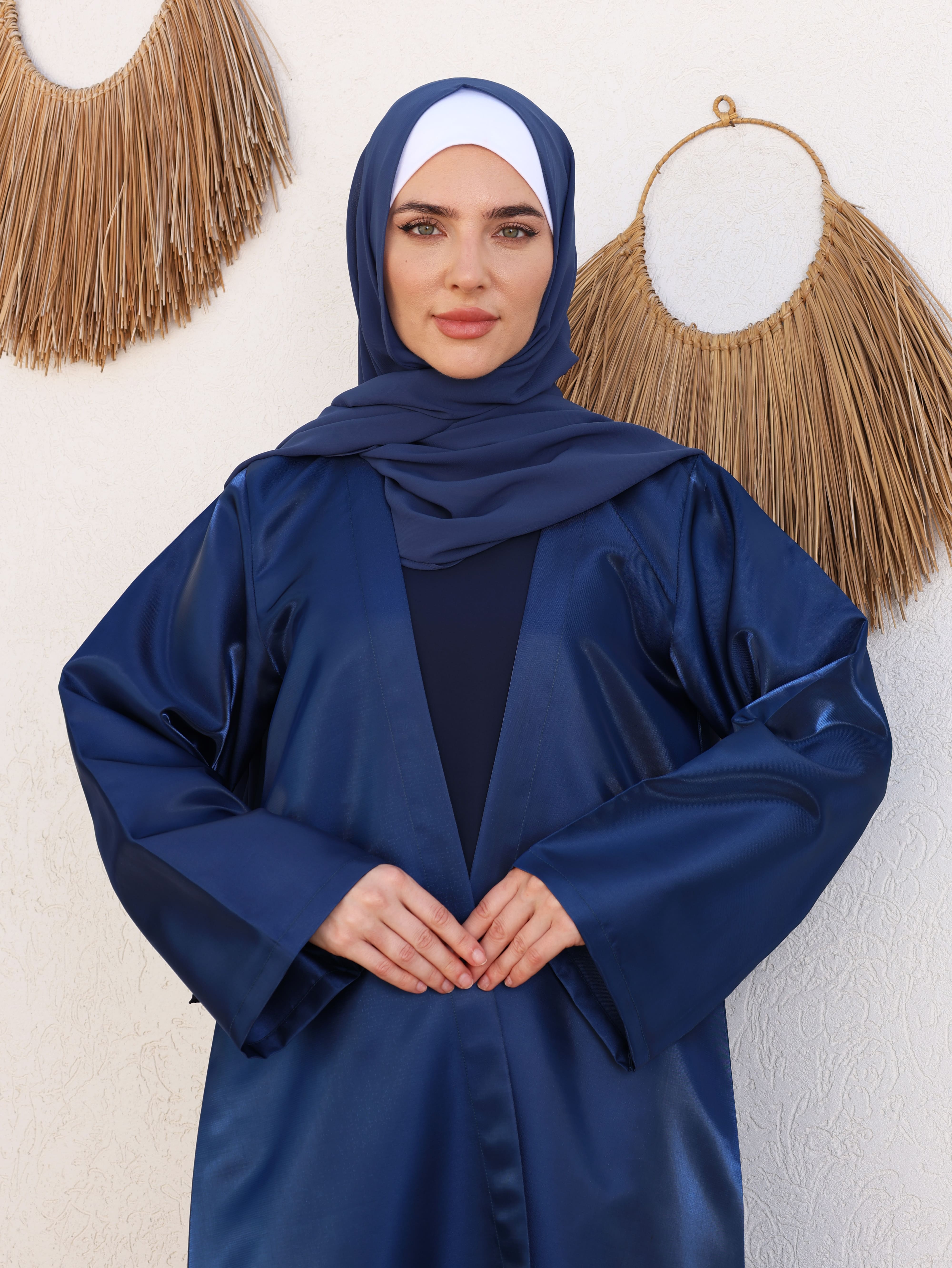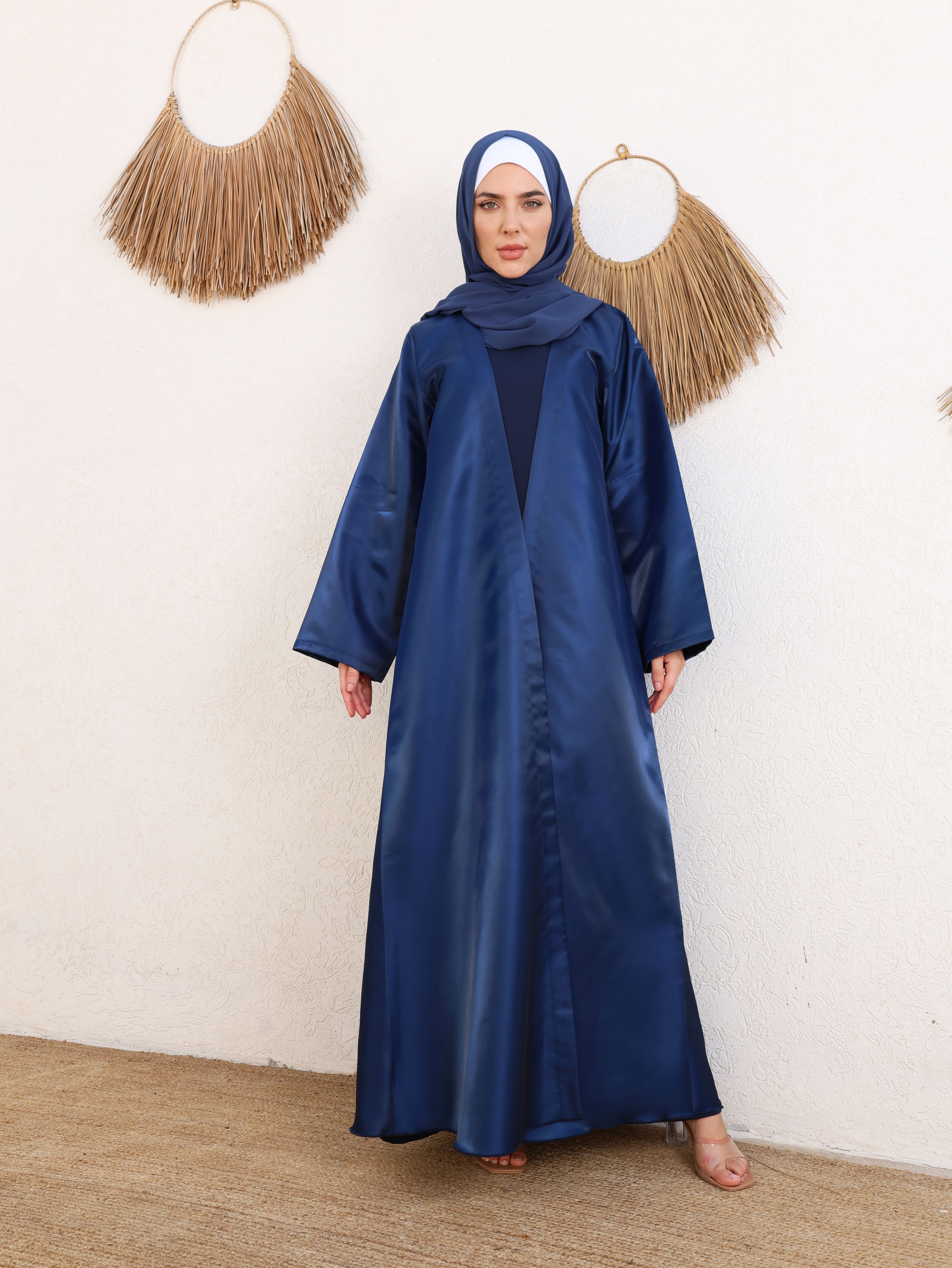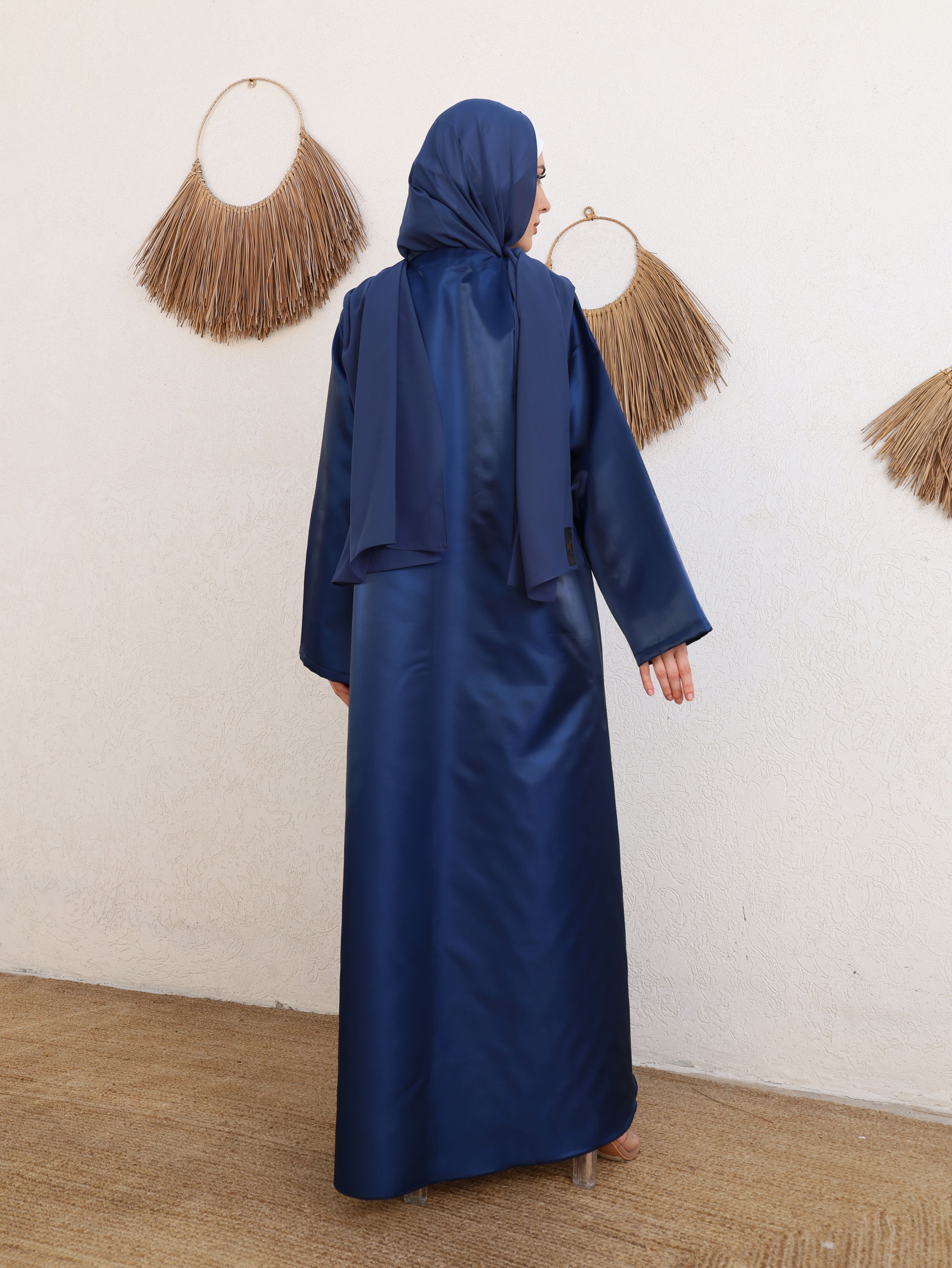 A serene blue organza abaya featuring a clean, graceful silhouette that embodies modern simplicity. Styled as an open abaya with a matching organza sheila and inner dress, it reflects effortless elegance and refined sophistication.