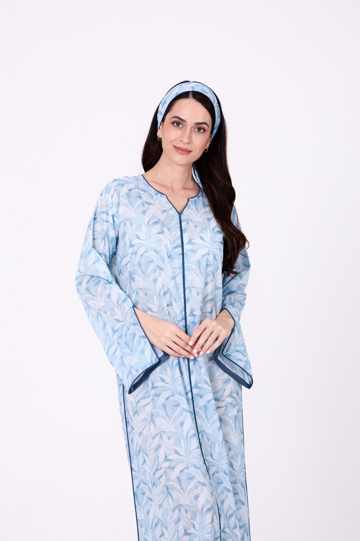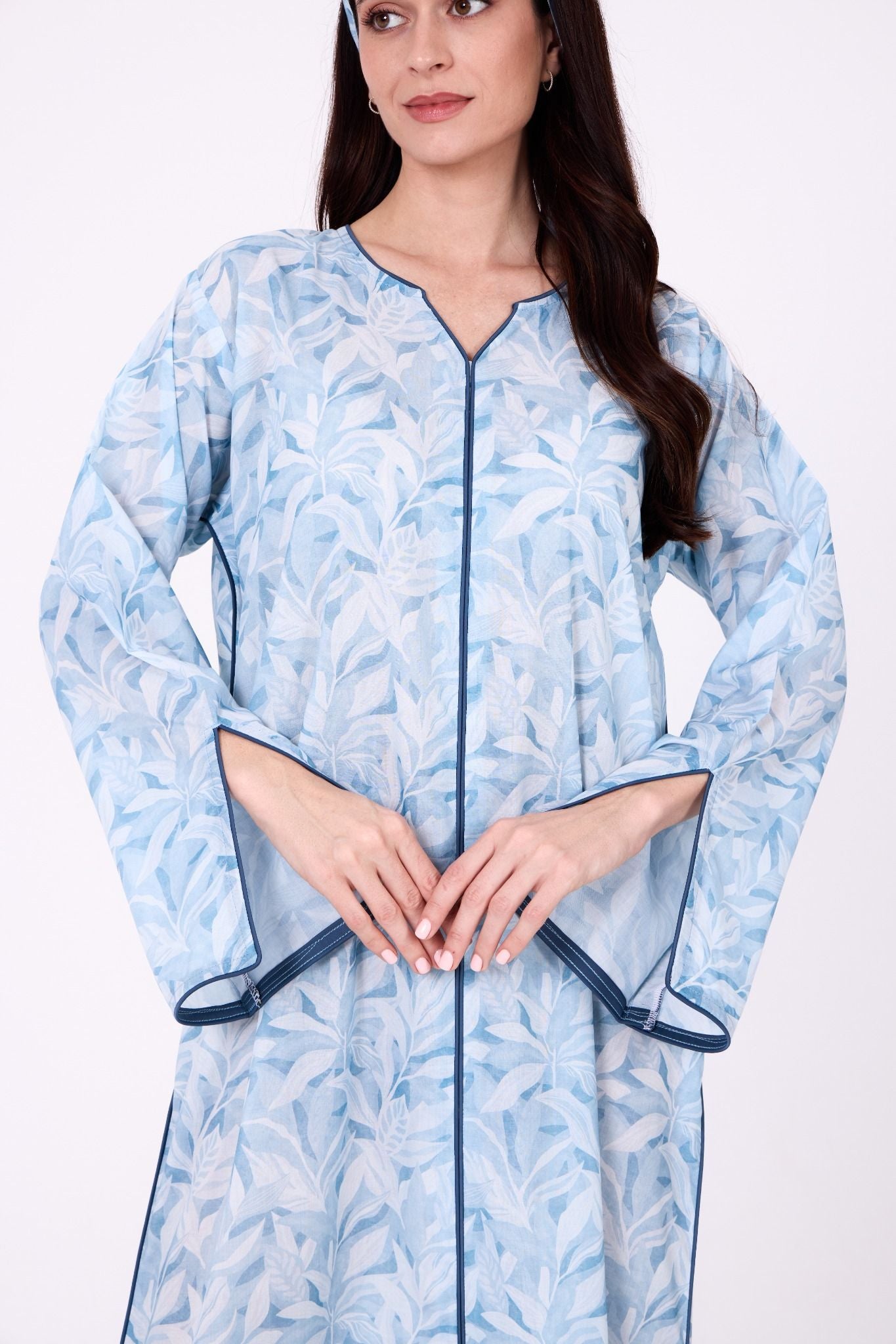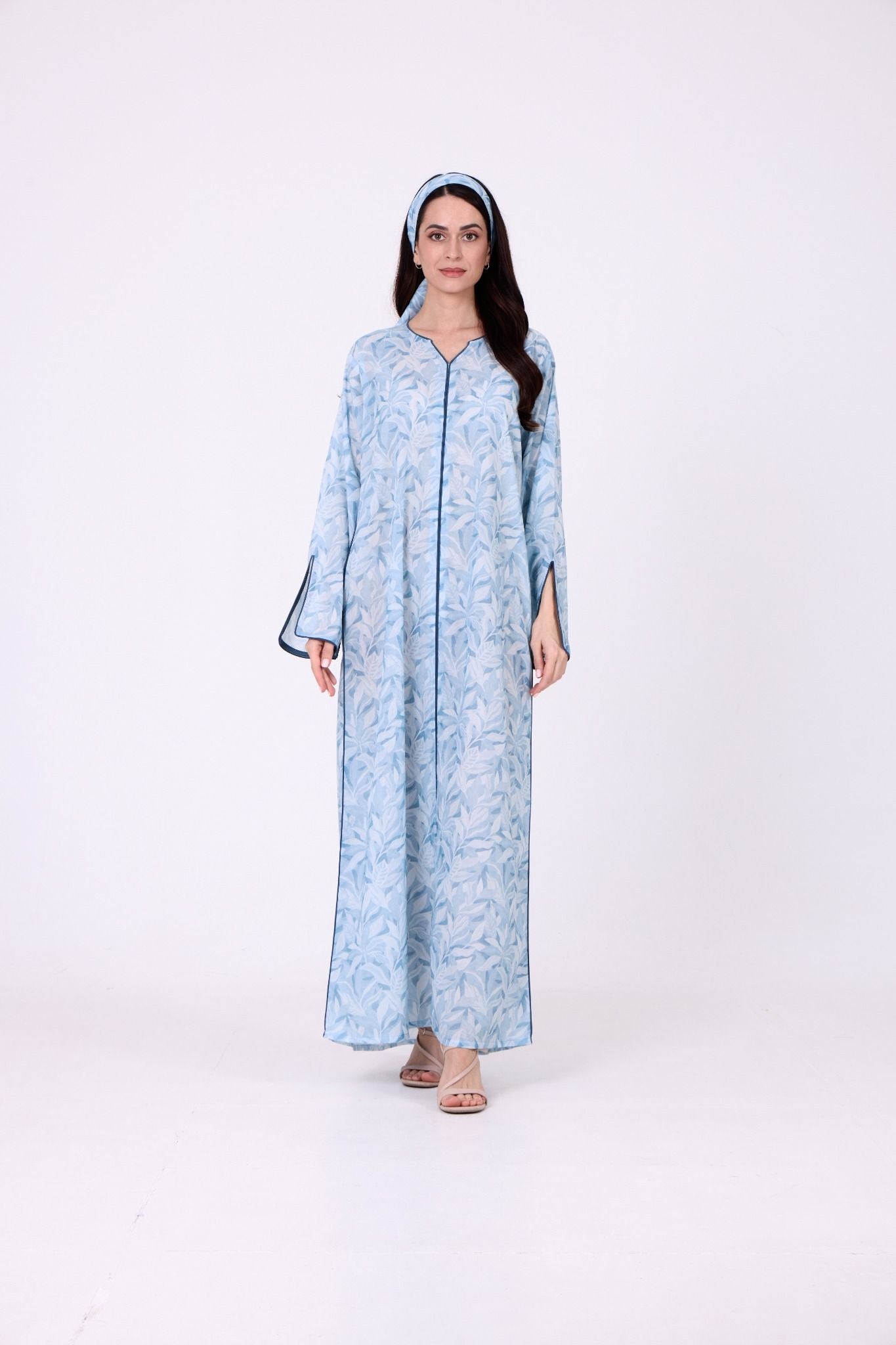 A soft blue jalabiya crafted in lightweight printed fabric, featuring delicate leaf-inspired prints for a fresh and elegant appeal. Finished with contrast blue piping along the neckline, sleeves, and sides of the bodice, creating a clean and refined outline. The wide sleeves are designed with subtle slit detailing, adding comfort and graceful movement to the silhouette. Comes with a matching headband to complete the look.