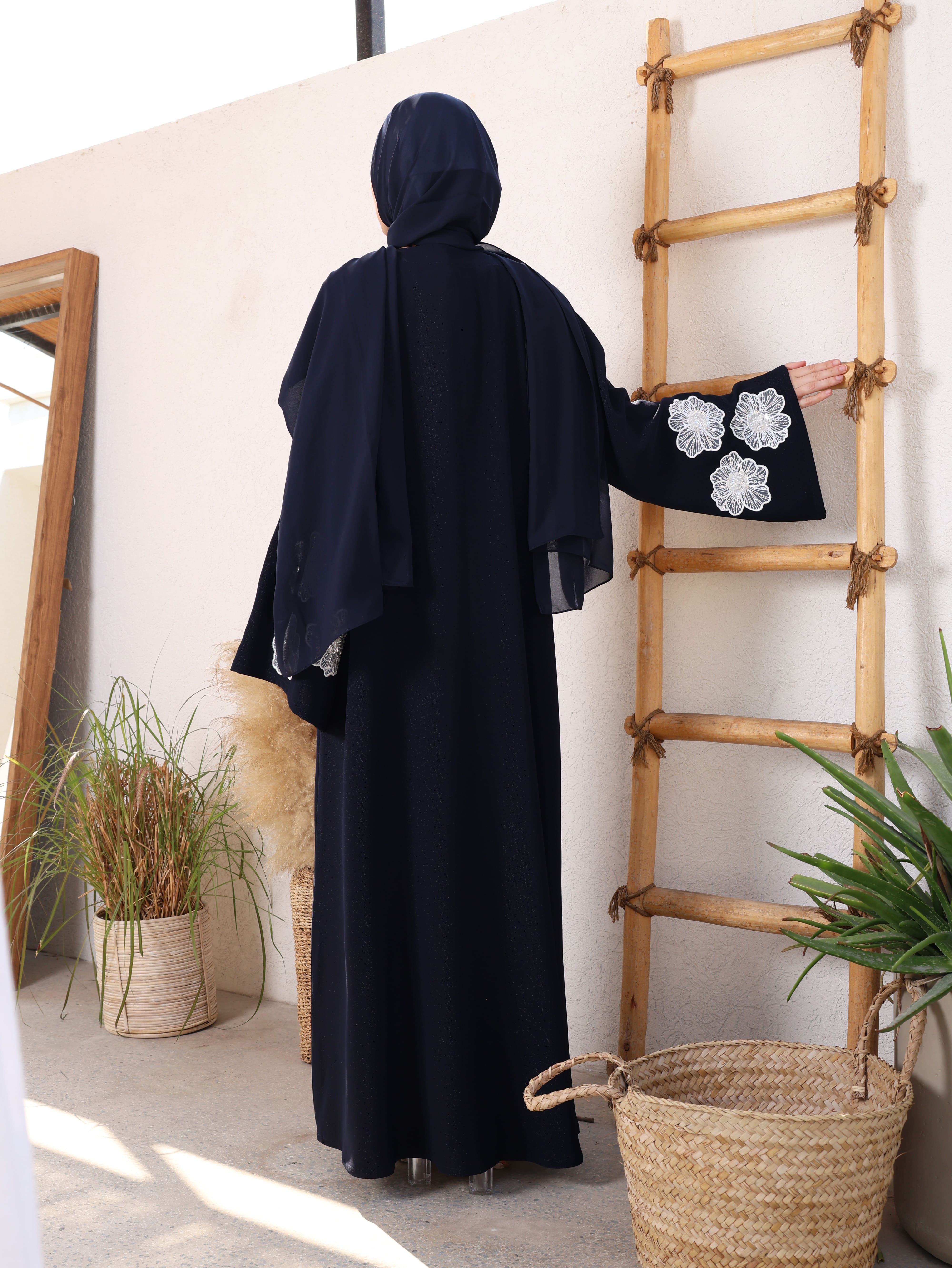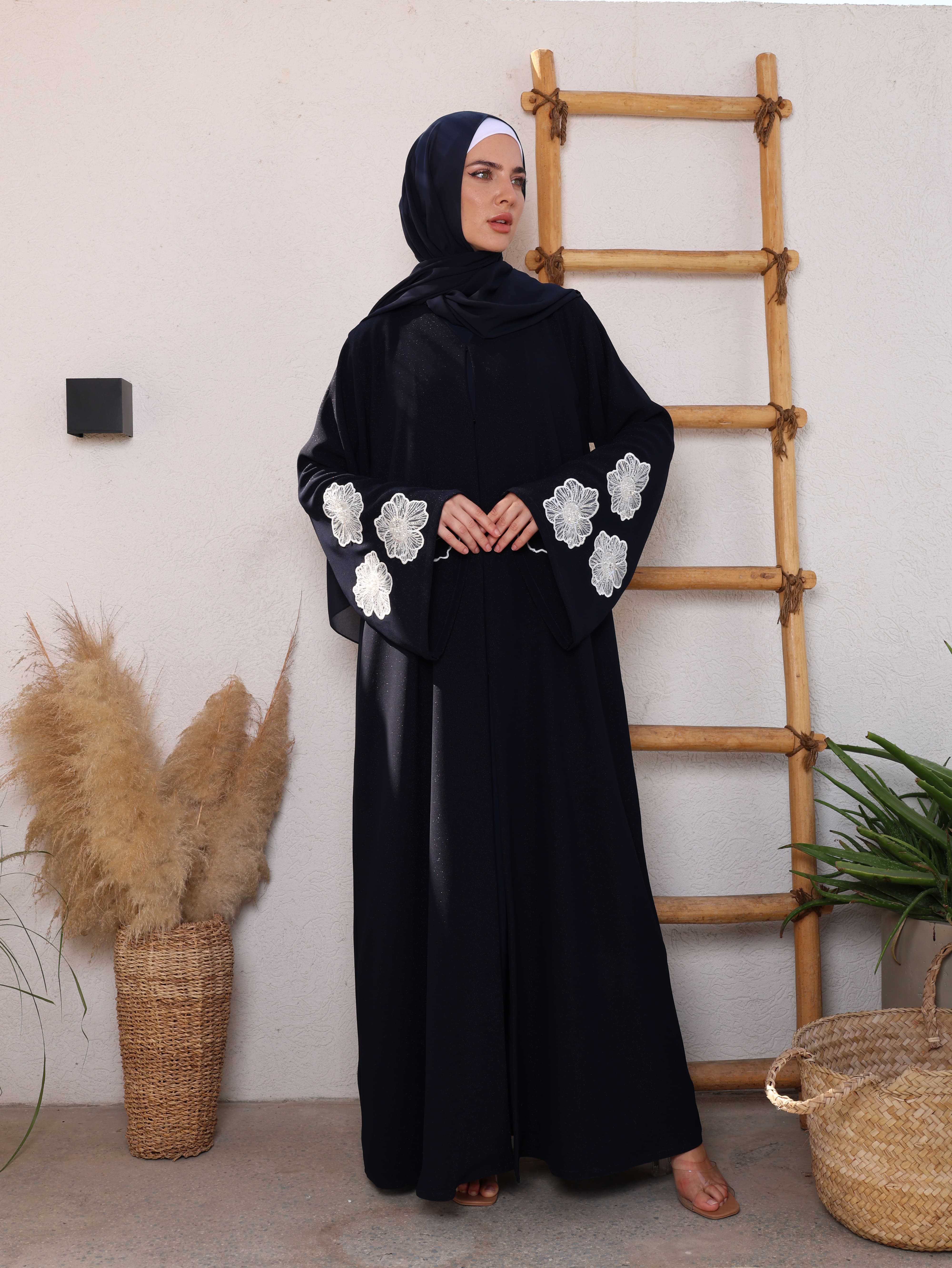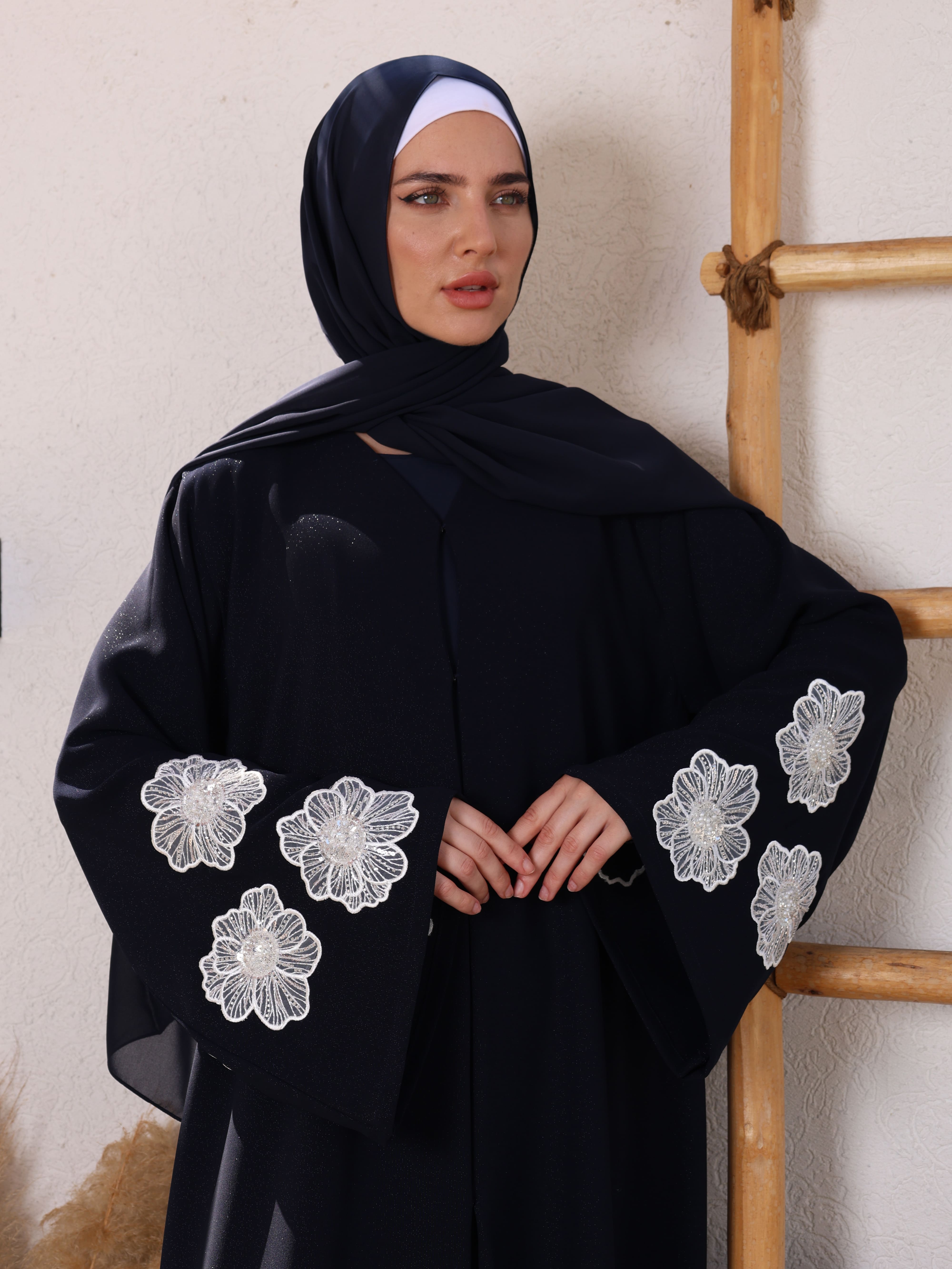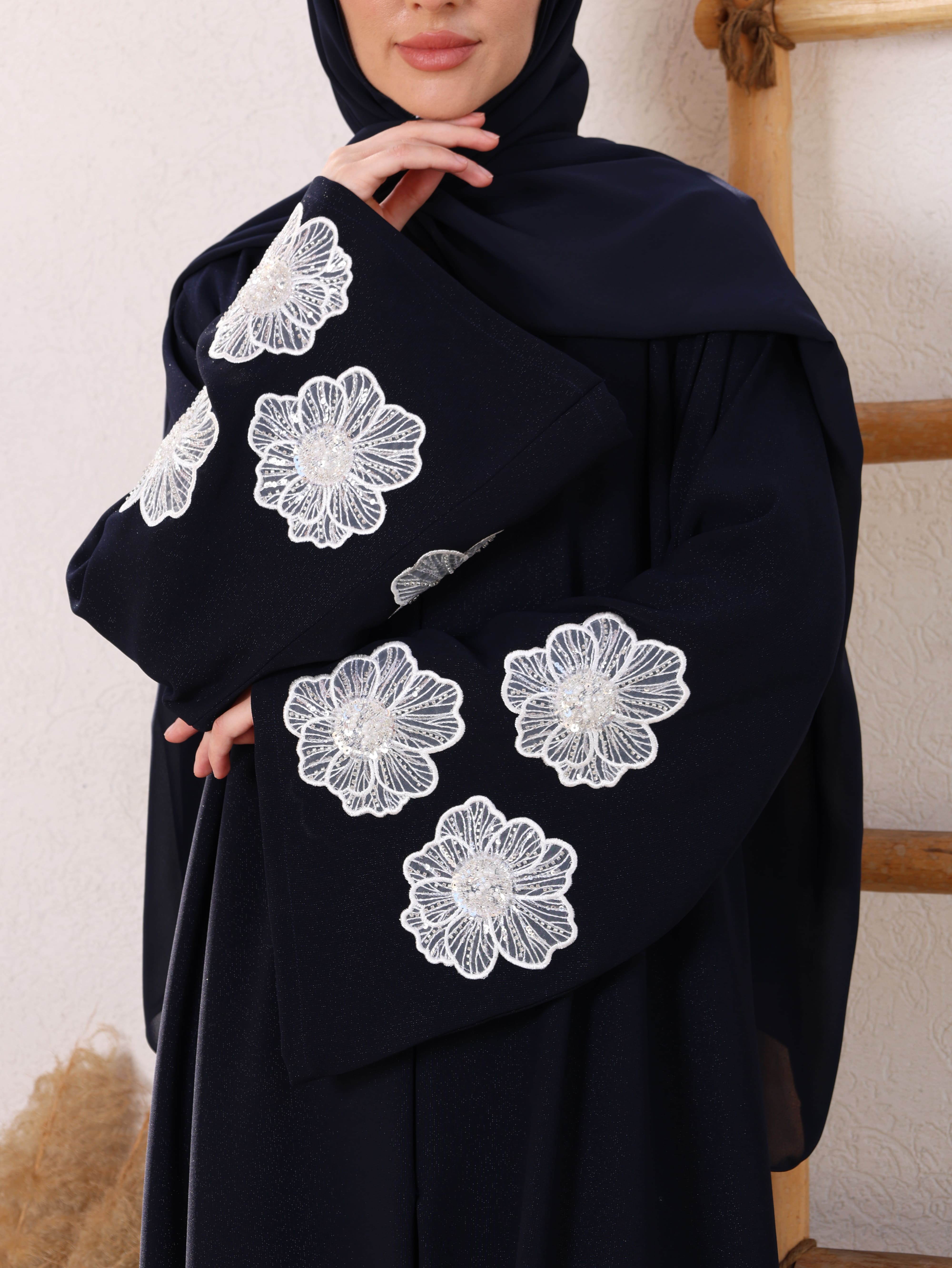 A blue shimmer crepe abaya with a sleek, front-open design featuring button-down closure. The sleeves are adorned with intricate floral motif handwork, adding a delicate artisanal touch. Paired with a matching sheila, it radiates elegance and refined sophistication.
