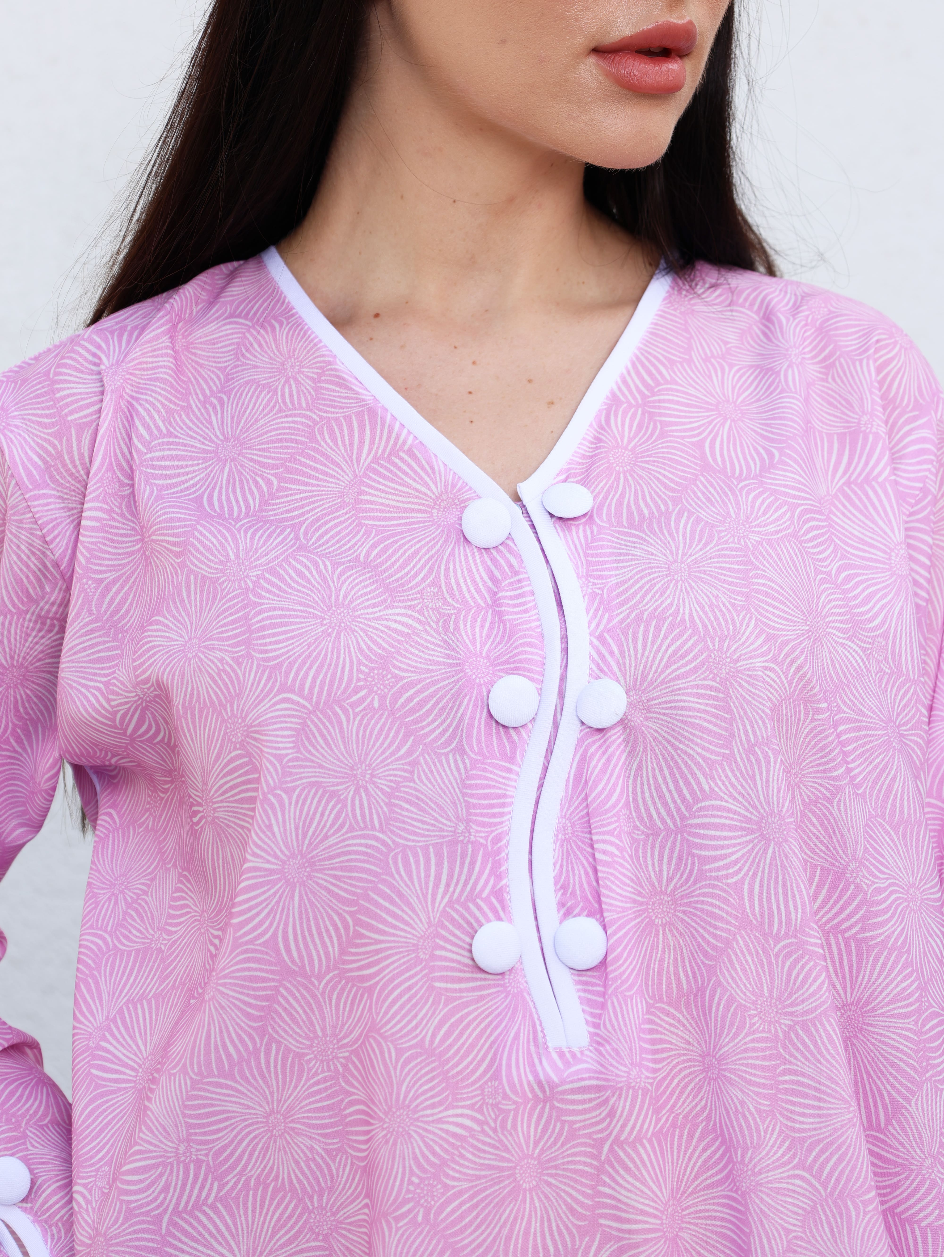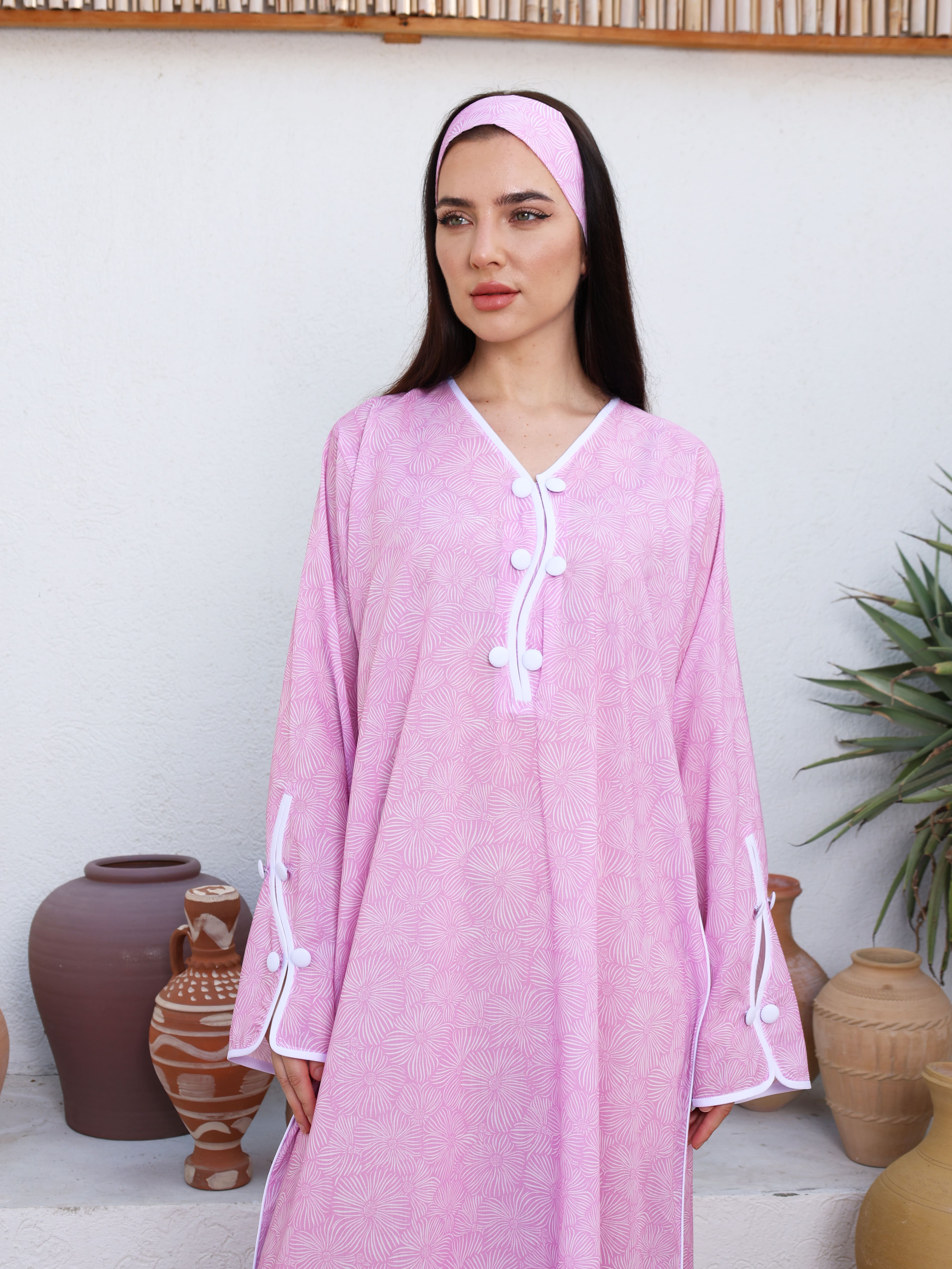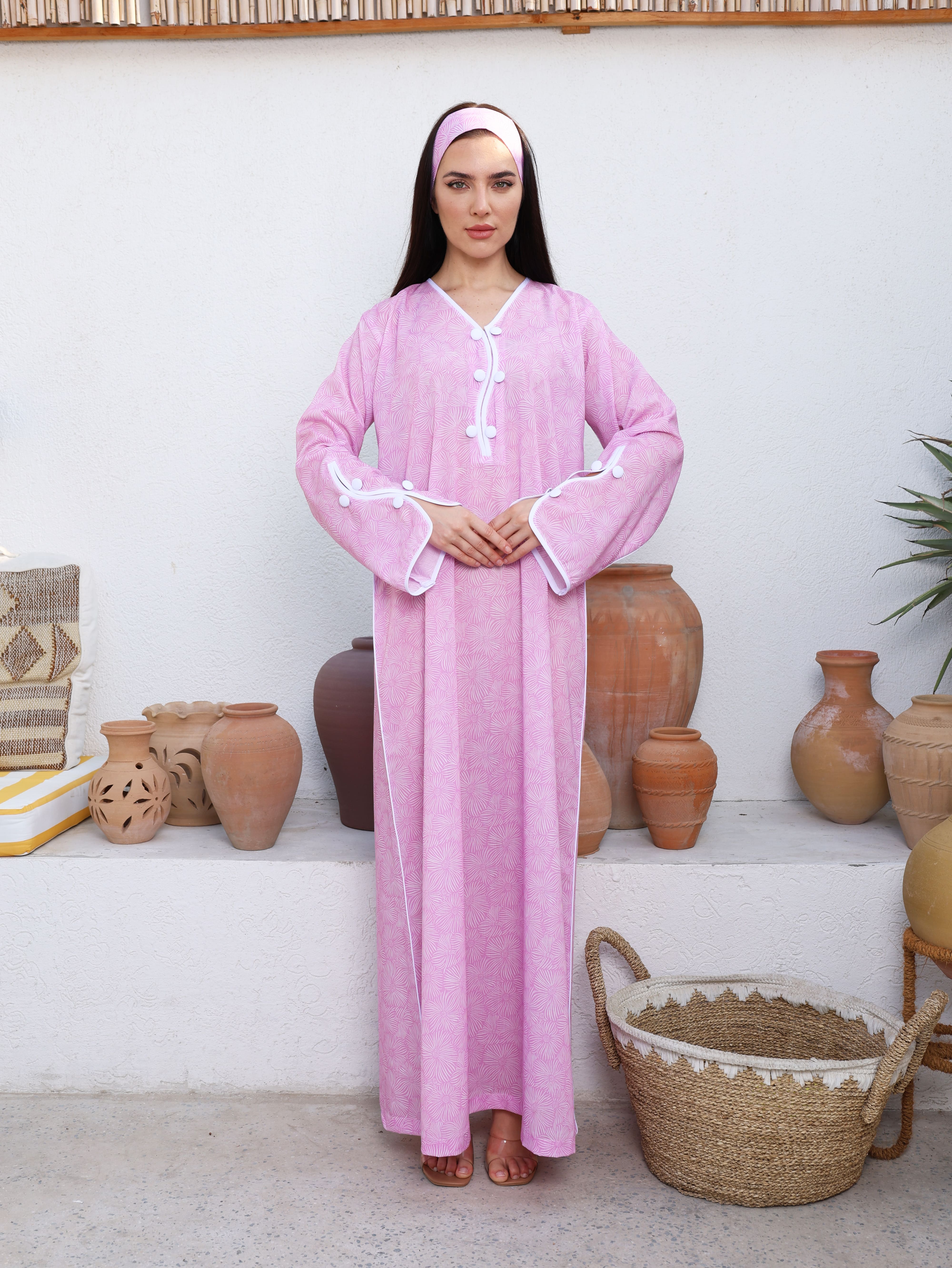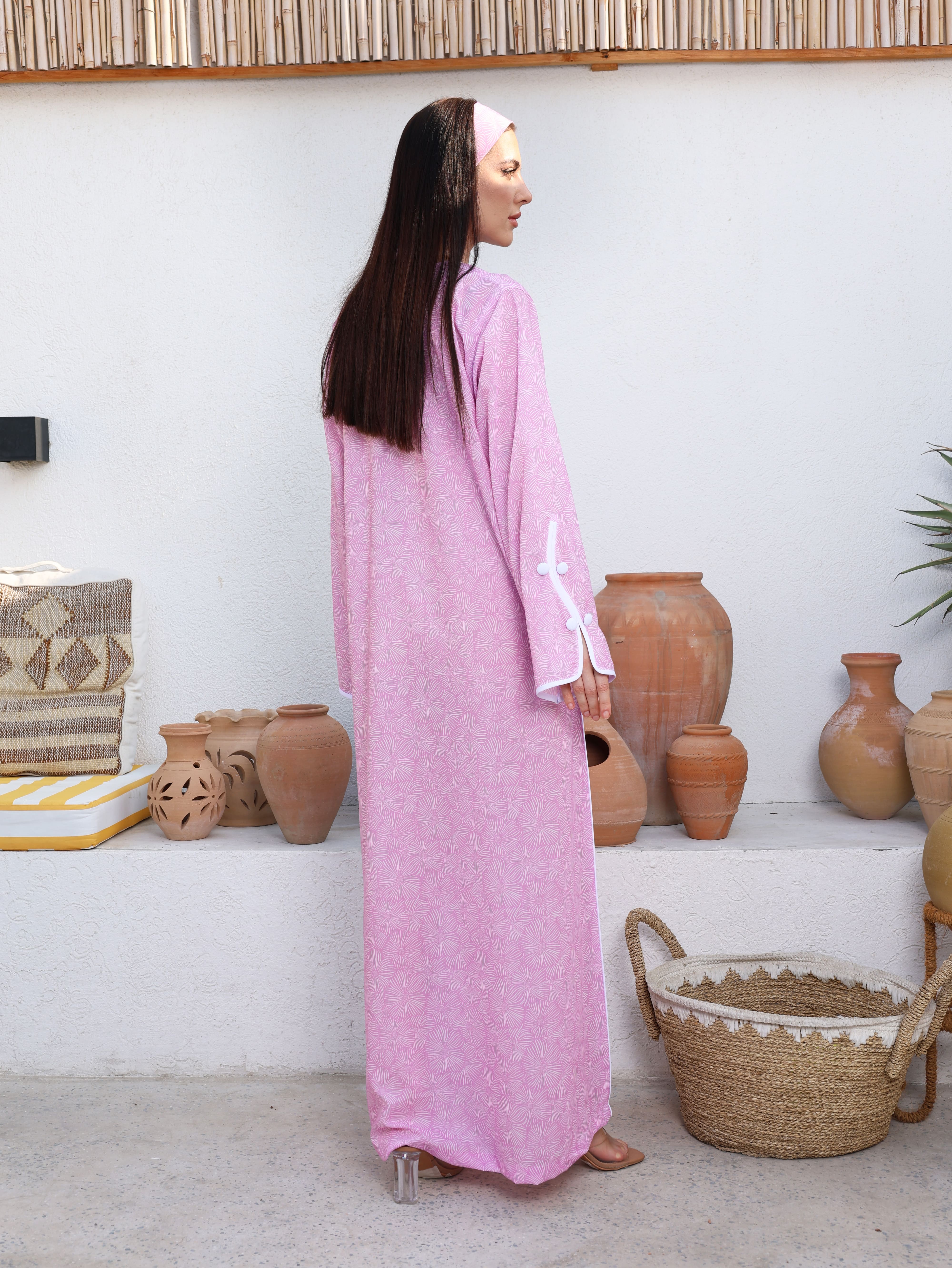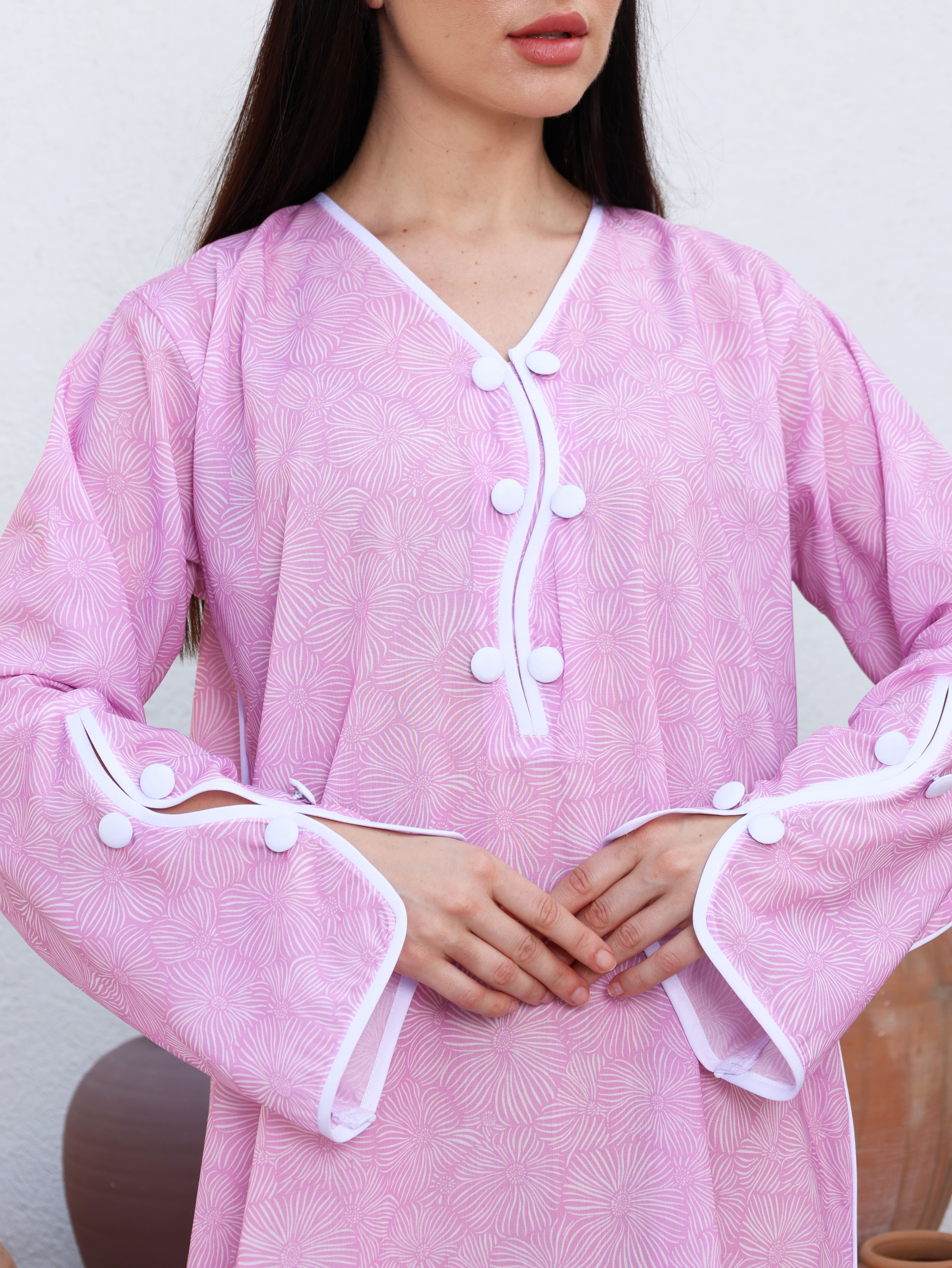 A soft pink cotton jalabiya adorned with delicate floral prints, exuding gentle femininity. The neckline and sleeves are highlighted with white piping and button detailing, adding a refined and charming touch to its elegant, garden-inspired design.