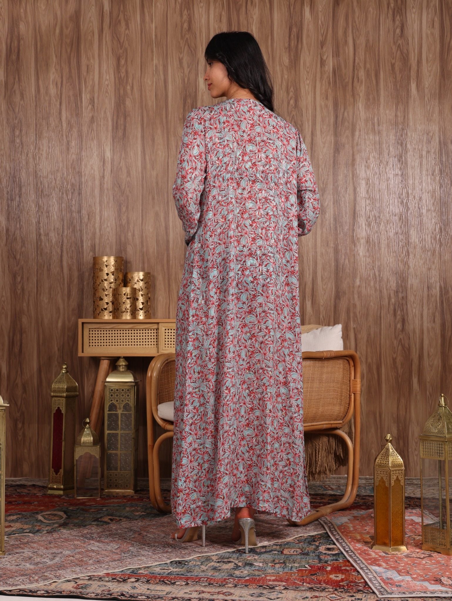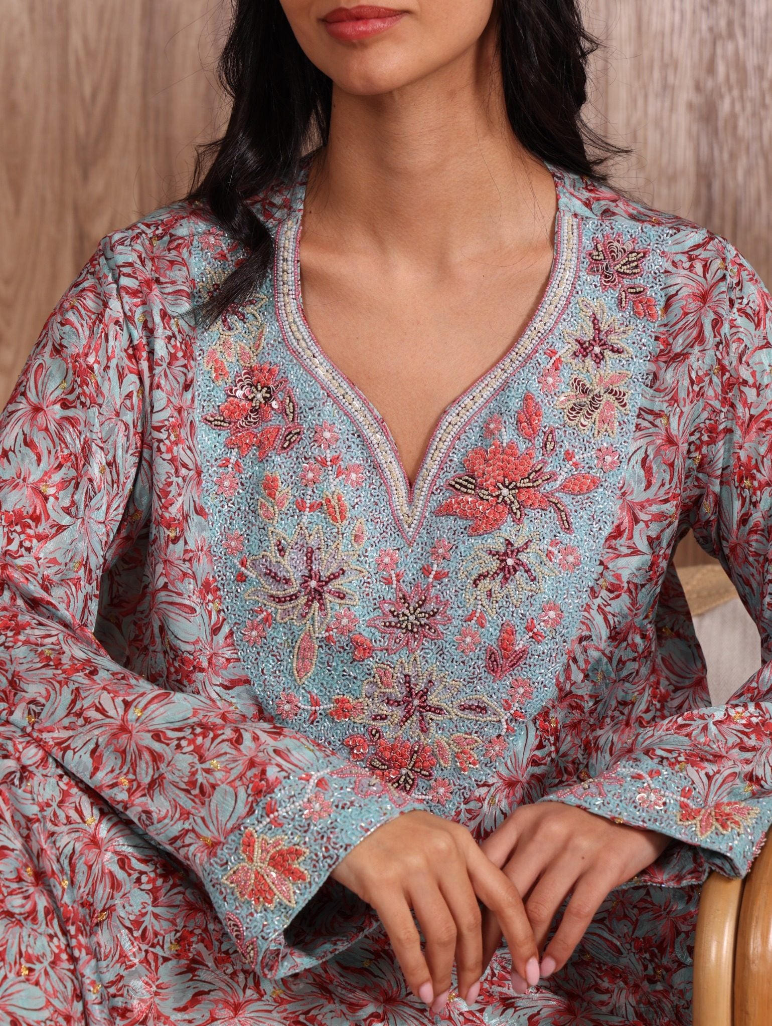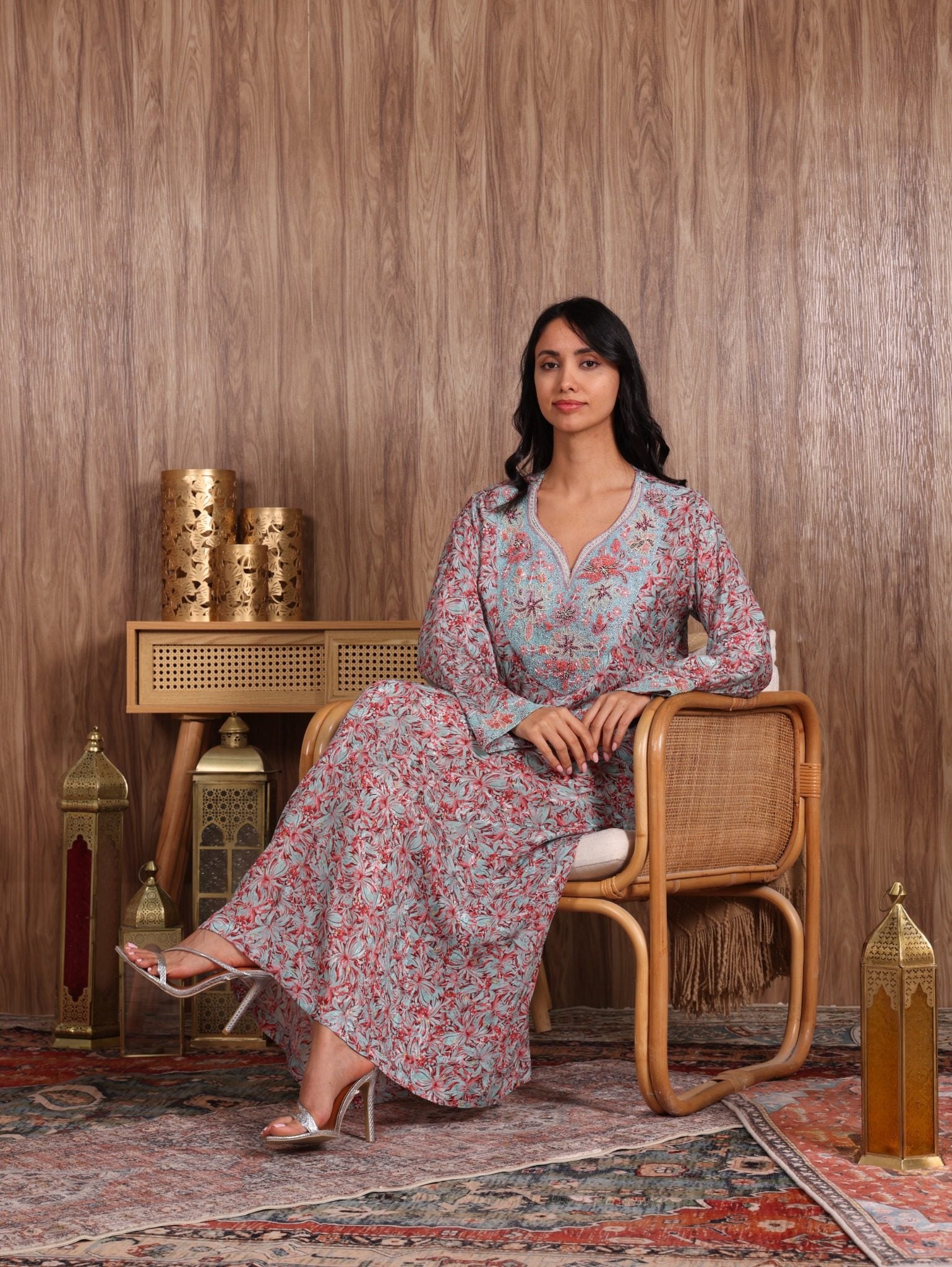 A graceful mukhwara in a refreshing powder blue base, adorned with intricate coral red floral motifs that create a striking yet elegant contrast. The neckline and sleeve cuffs are richly embellished with delicate hand-beaded embroidery in shades of coral, blush pink, ivory, and soft gold, forming detailed floral patterns that add depth and sophistication. The harmonious blend of cool blue and warm coral tones evokes a timeless, refined charm, perfect for both intimate gatherings and elegant occasions.