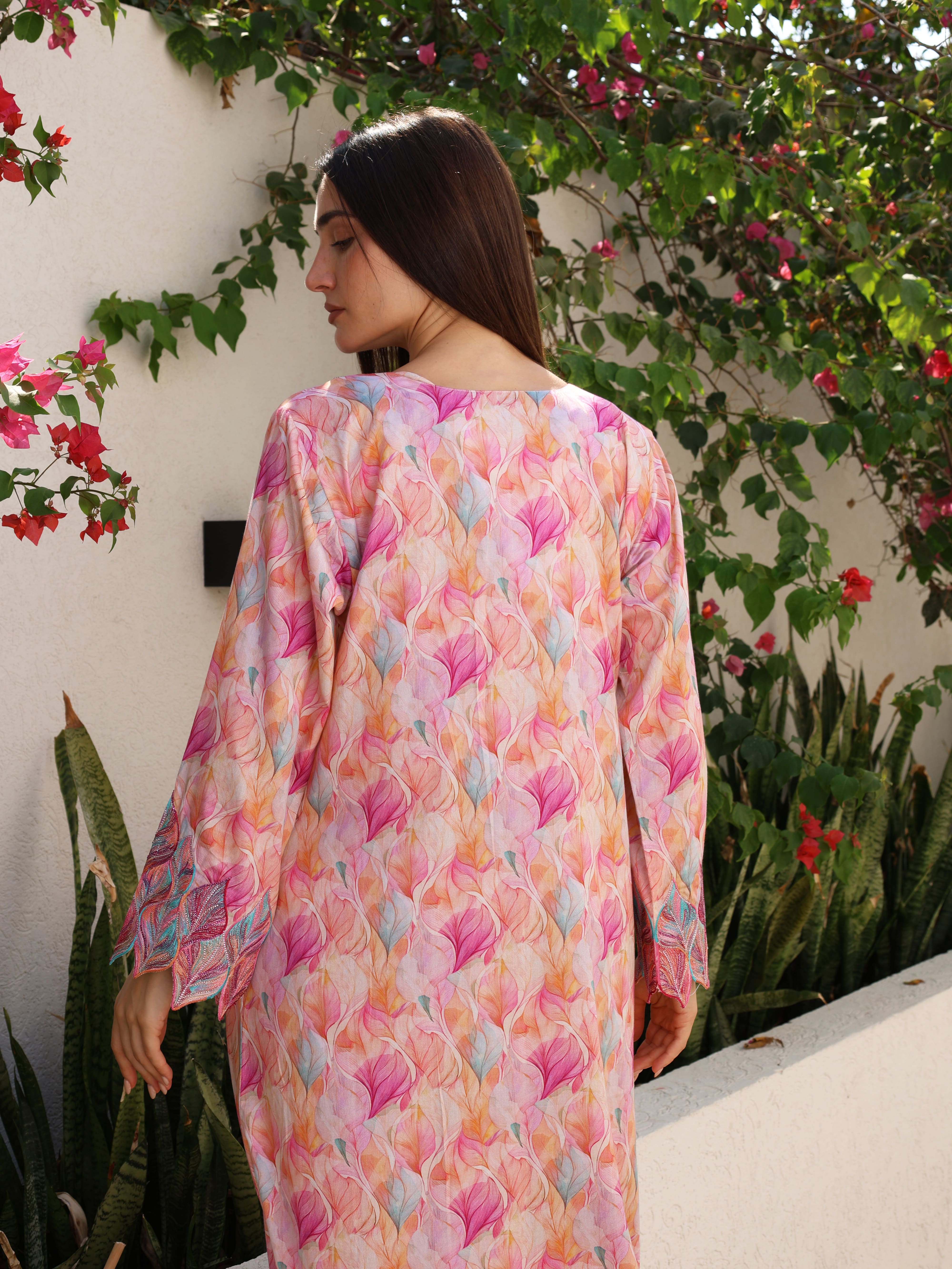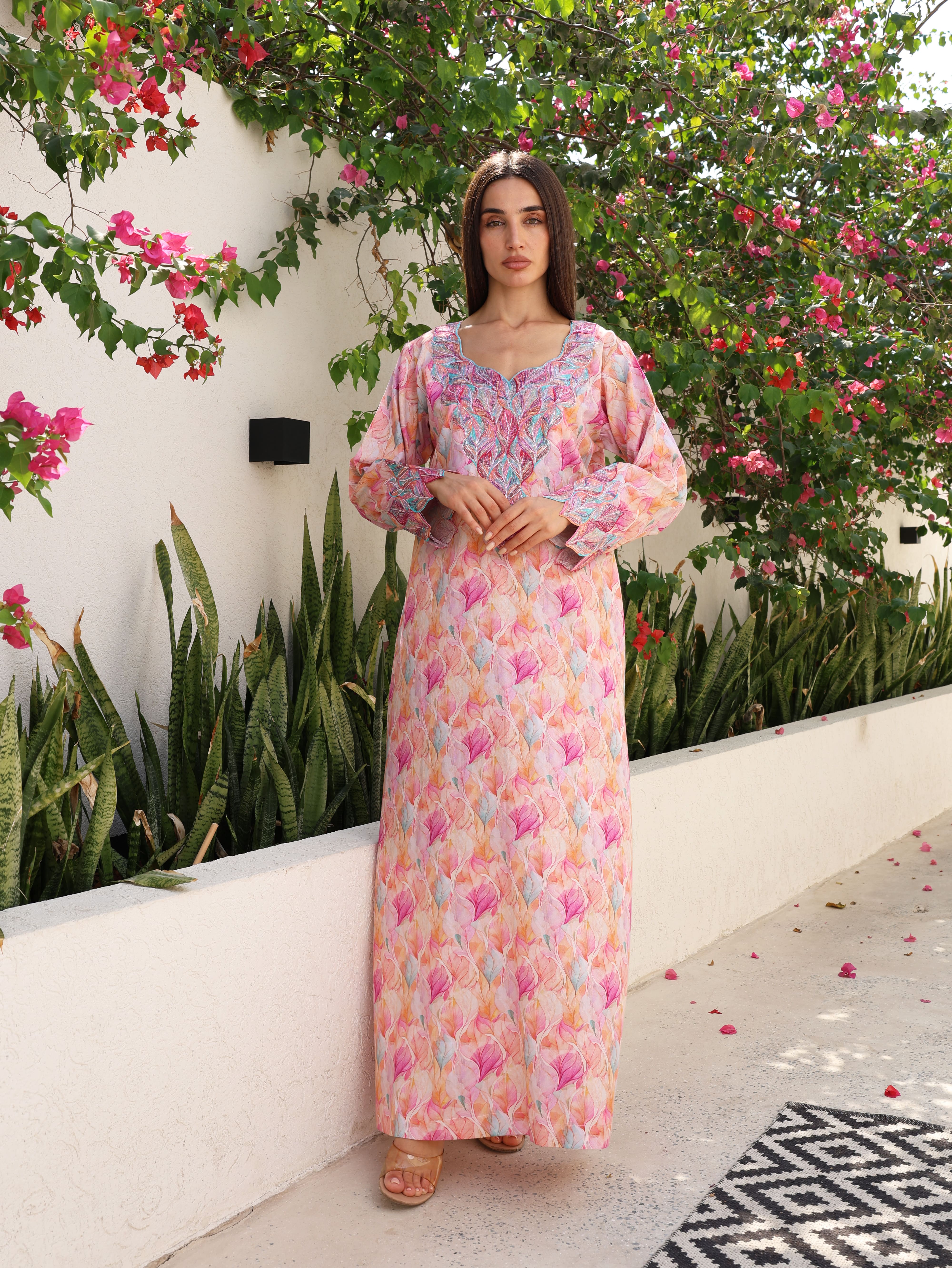 A peach color cotton mukhawara featuring delicate leaf prints in shades of pink, light blue, and orange, capturing a fresh and graceful vibe. The neckline and sleeves are elegantly finished with fine machine embroidery and shimmering stone details, blending soft hues with refined sophistication.