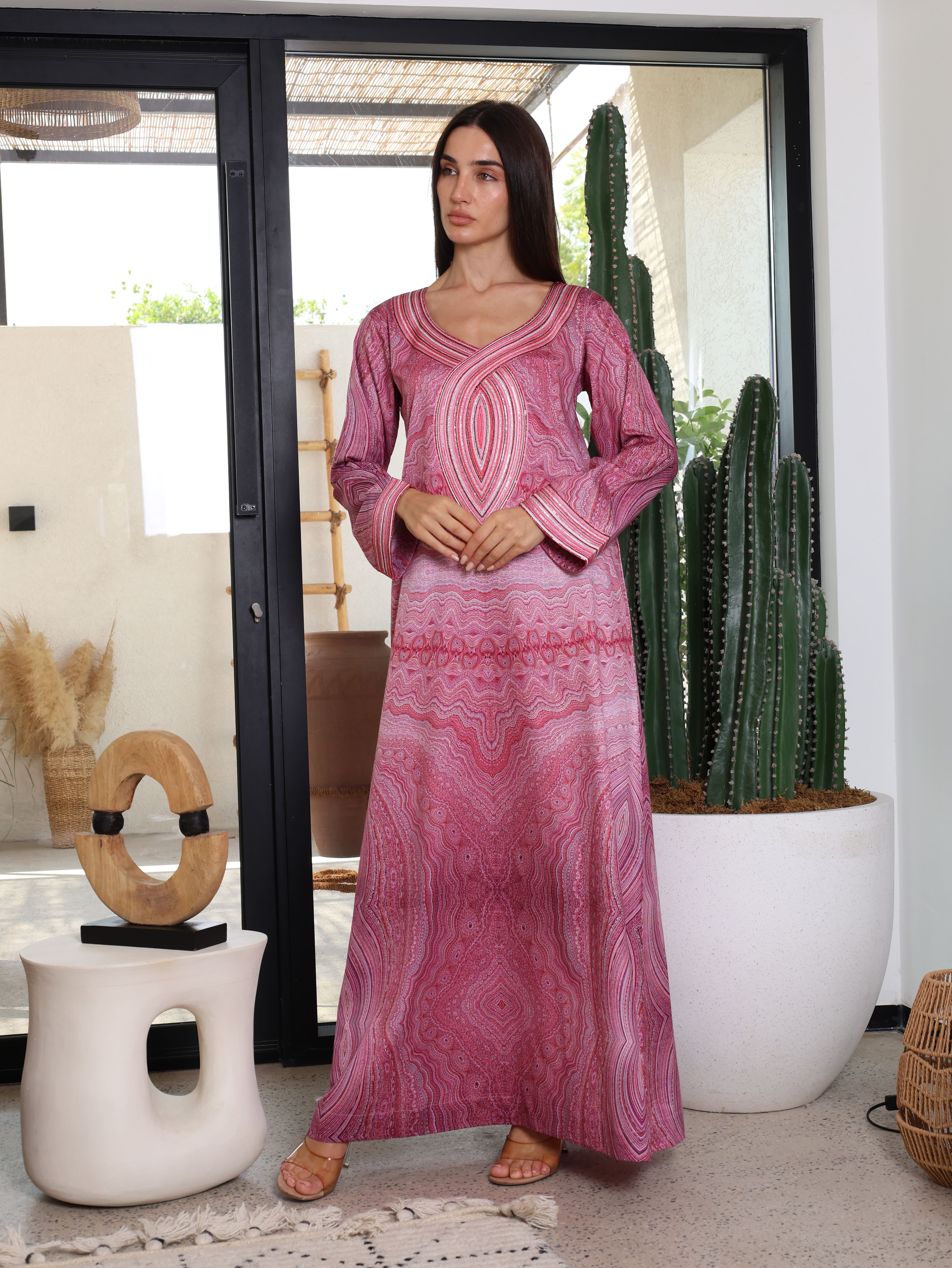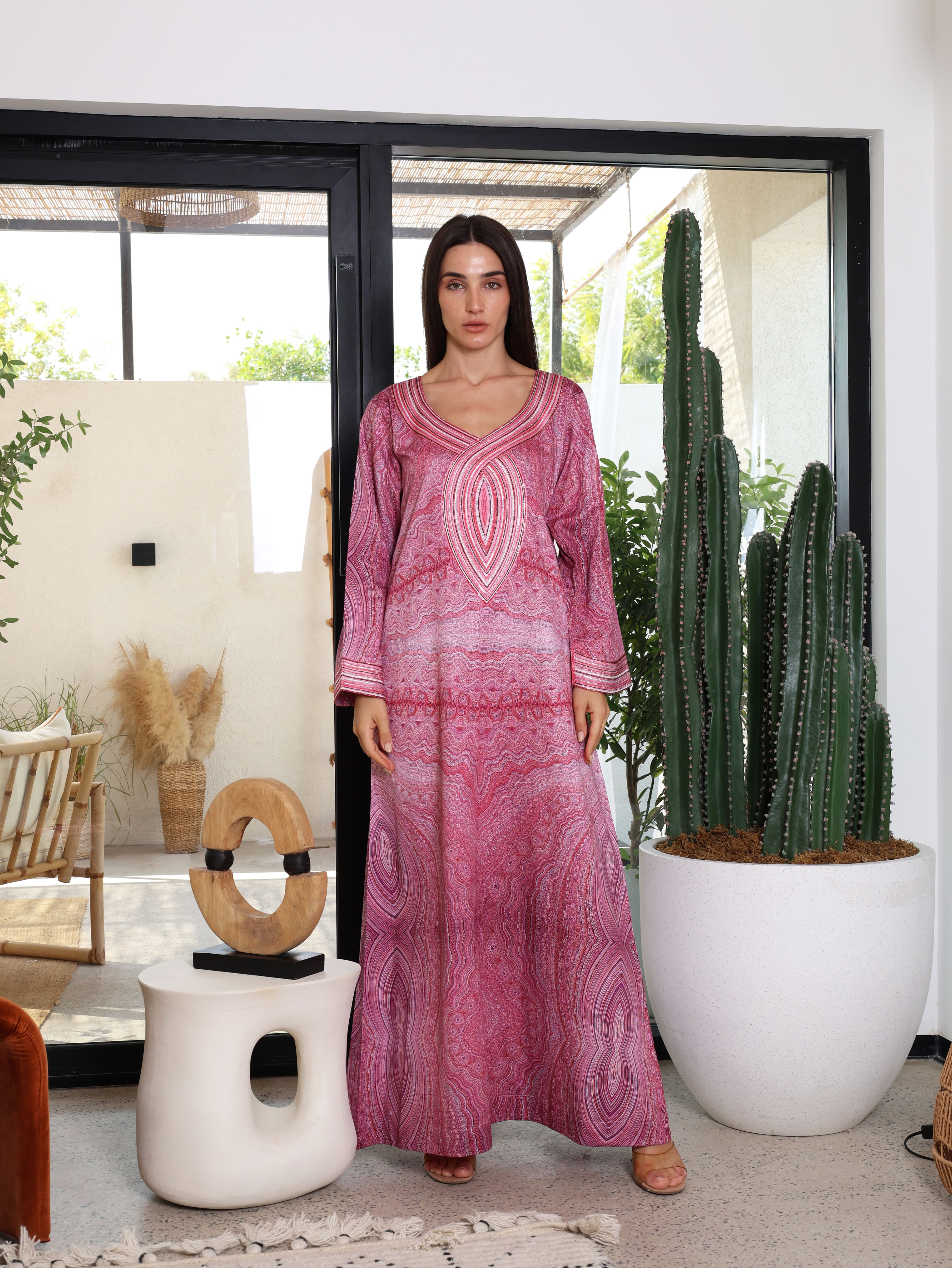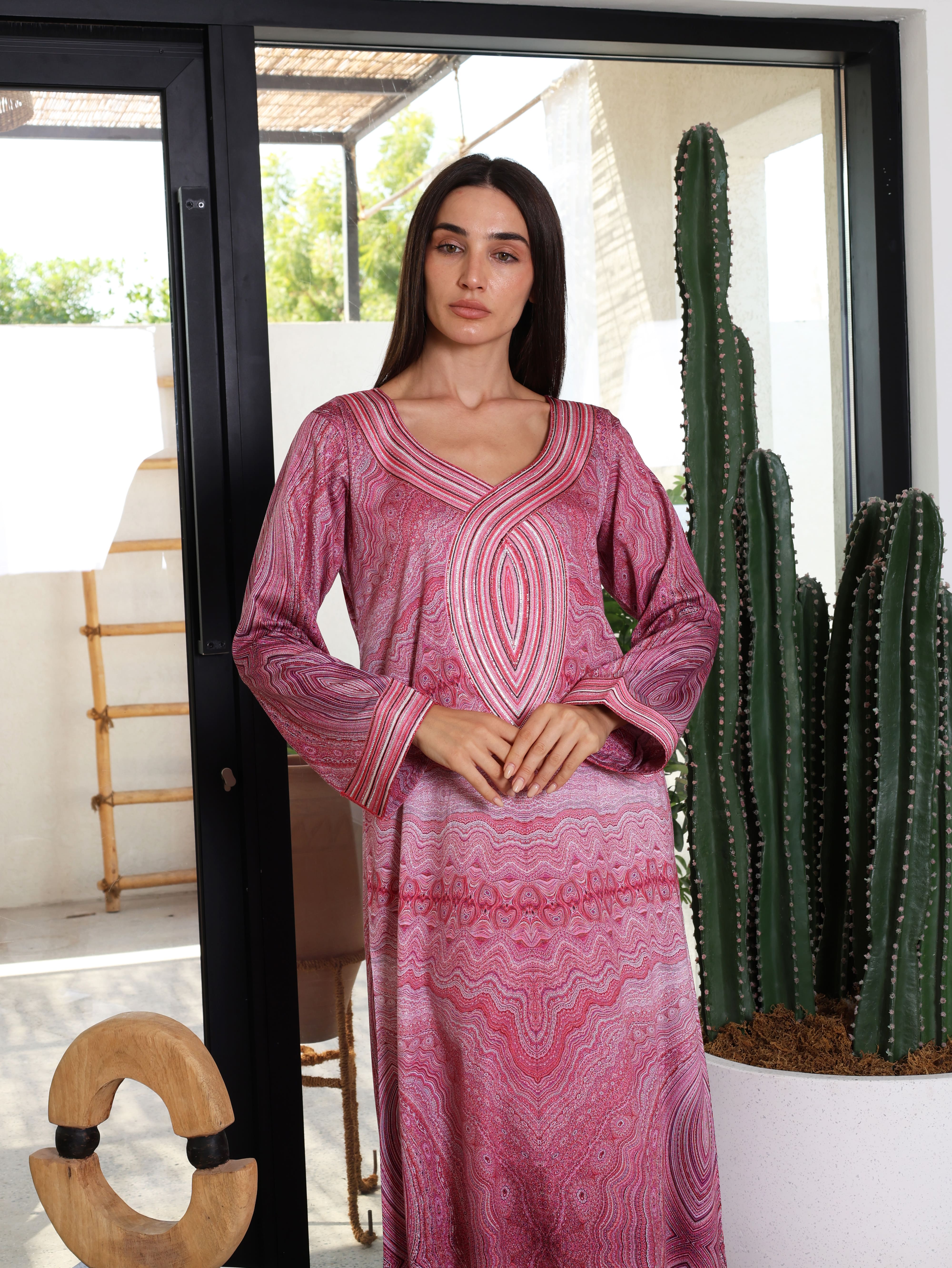 A red cotton mukhawara featuring intricate mandala-inspired prints, exuding bold elegance and cultural charm. The neckline and sleeves are detailed with delicate machine embroidery, adding a refined and sophisticated touch to its vibrant design