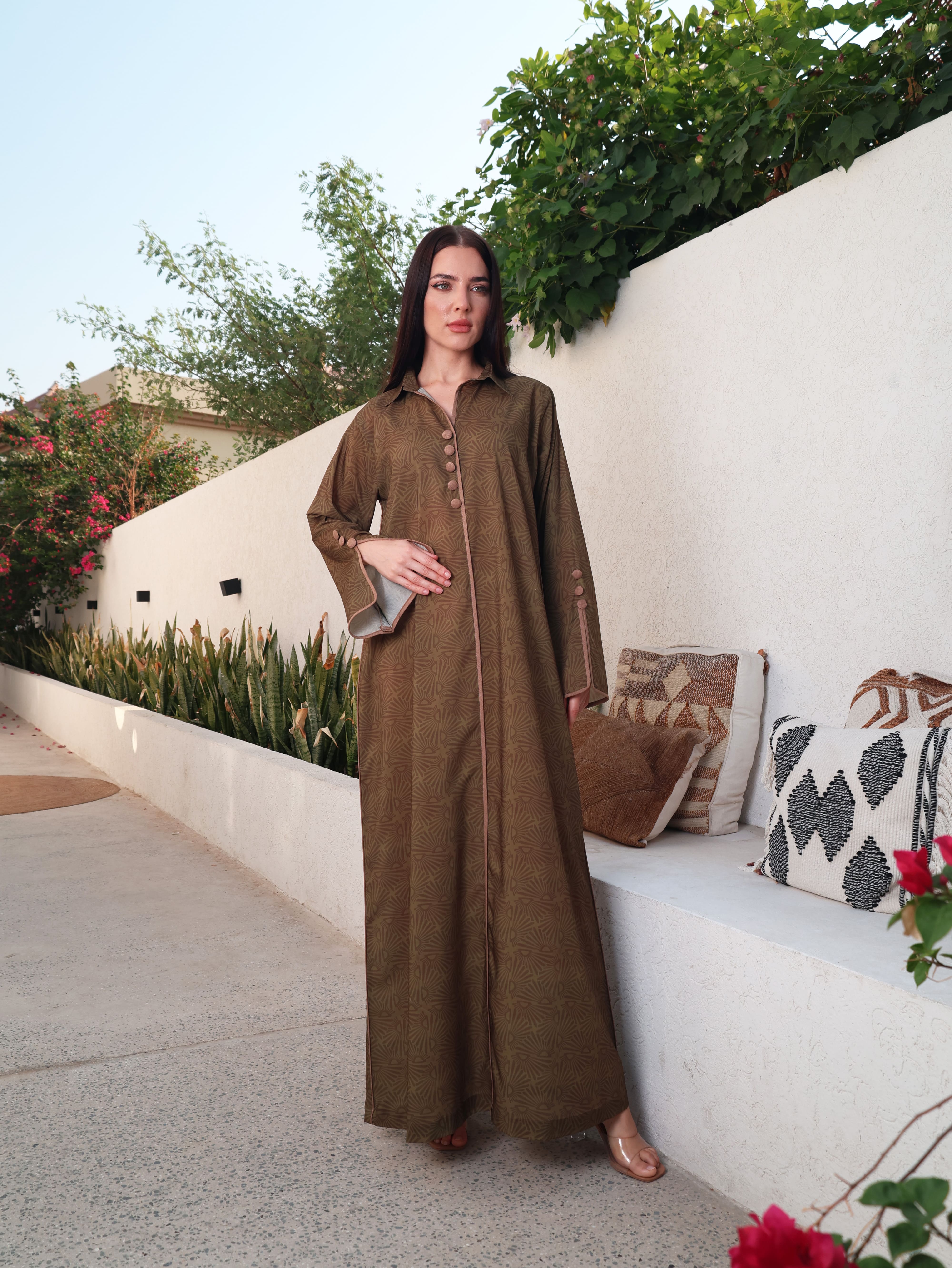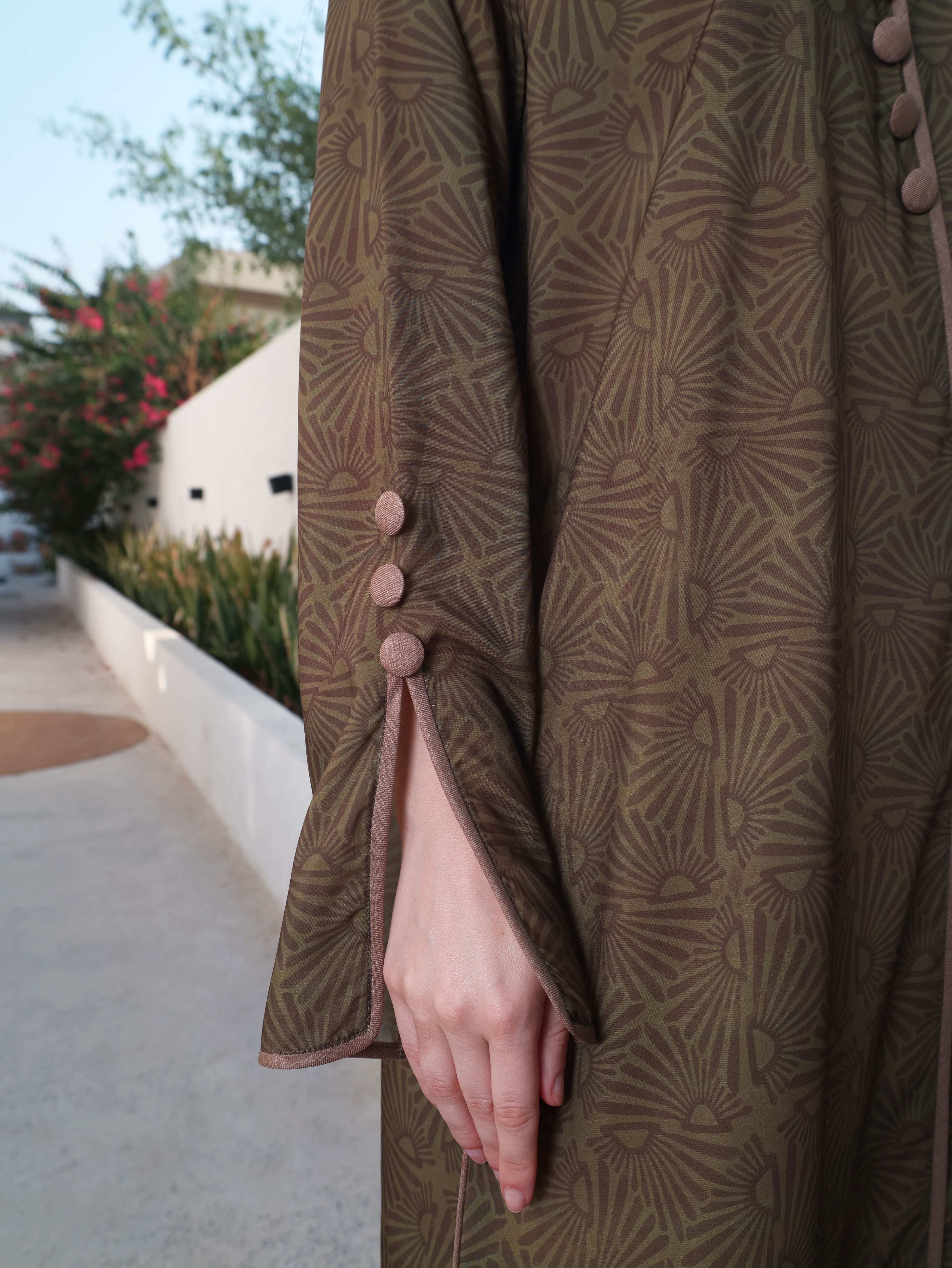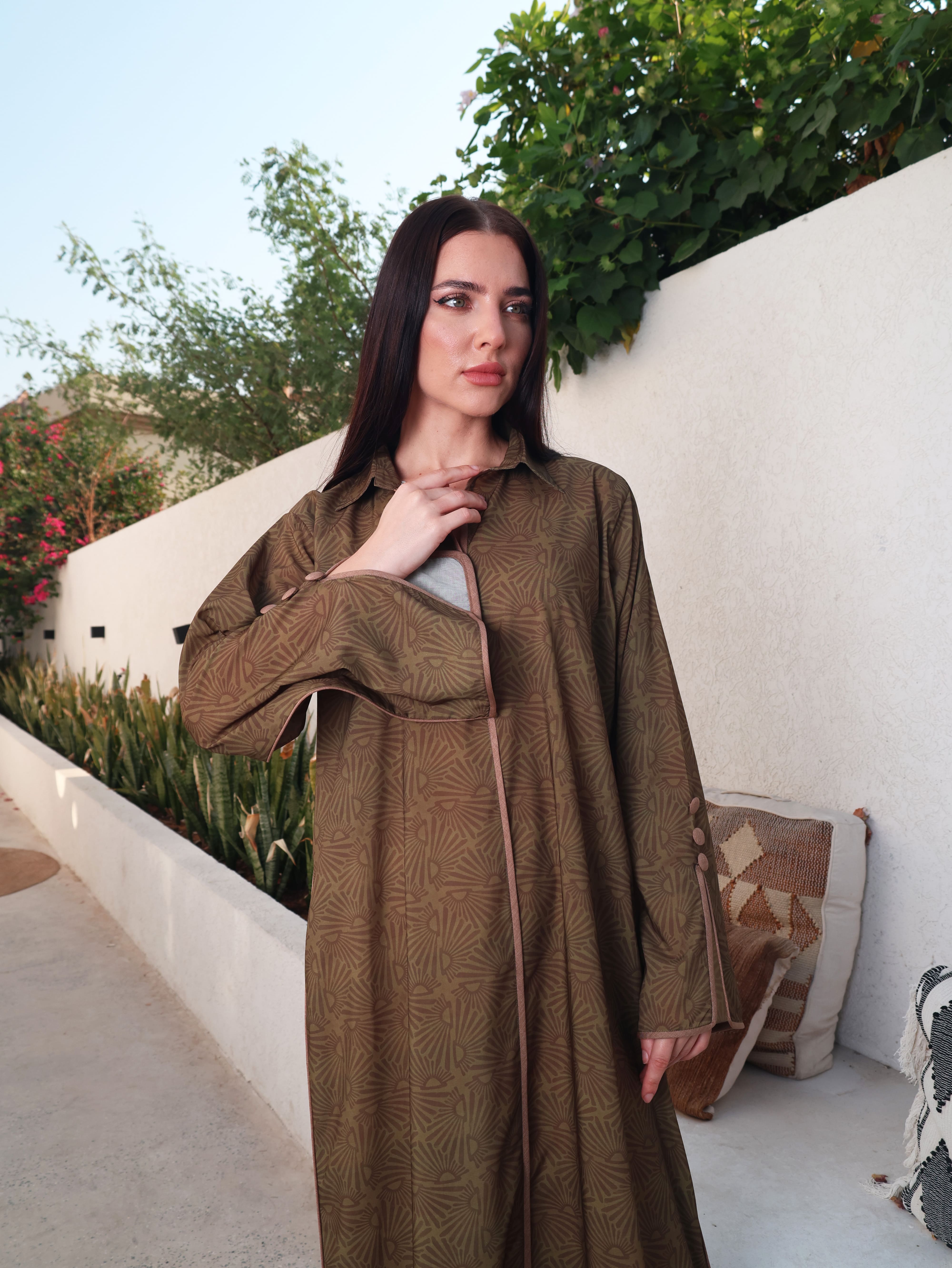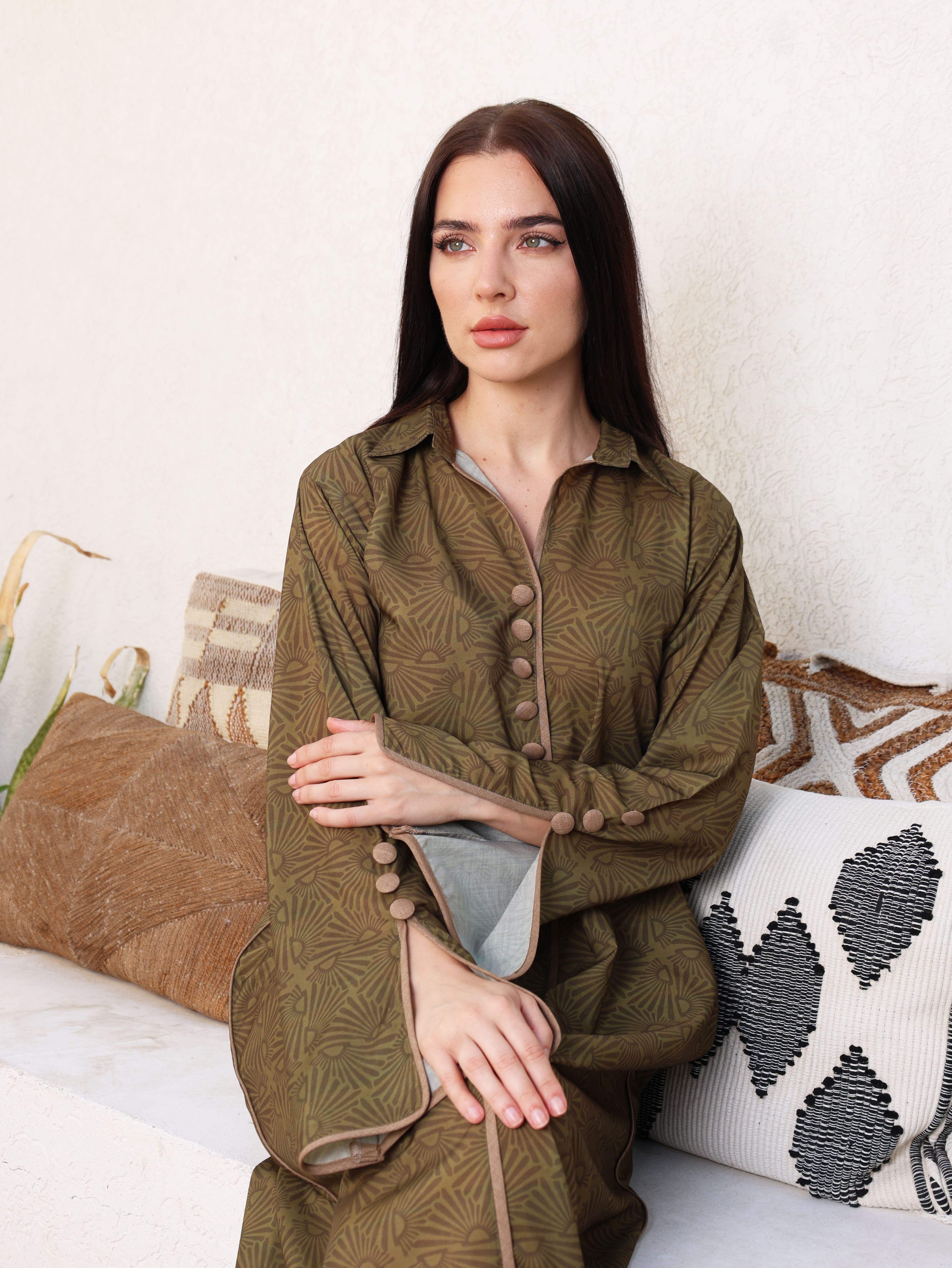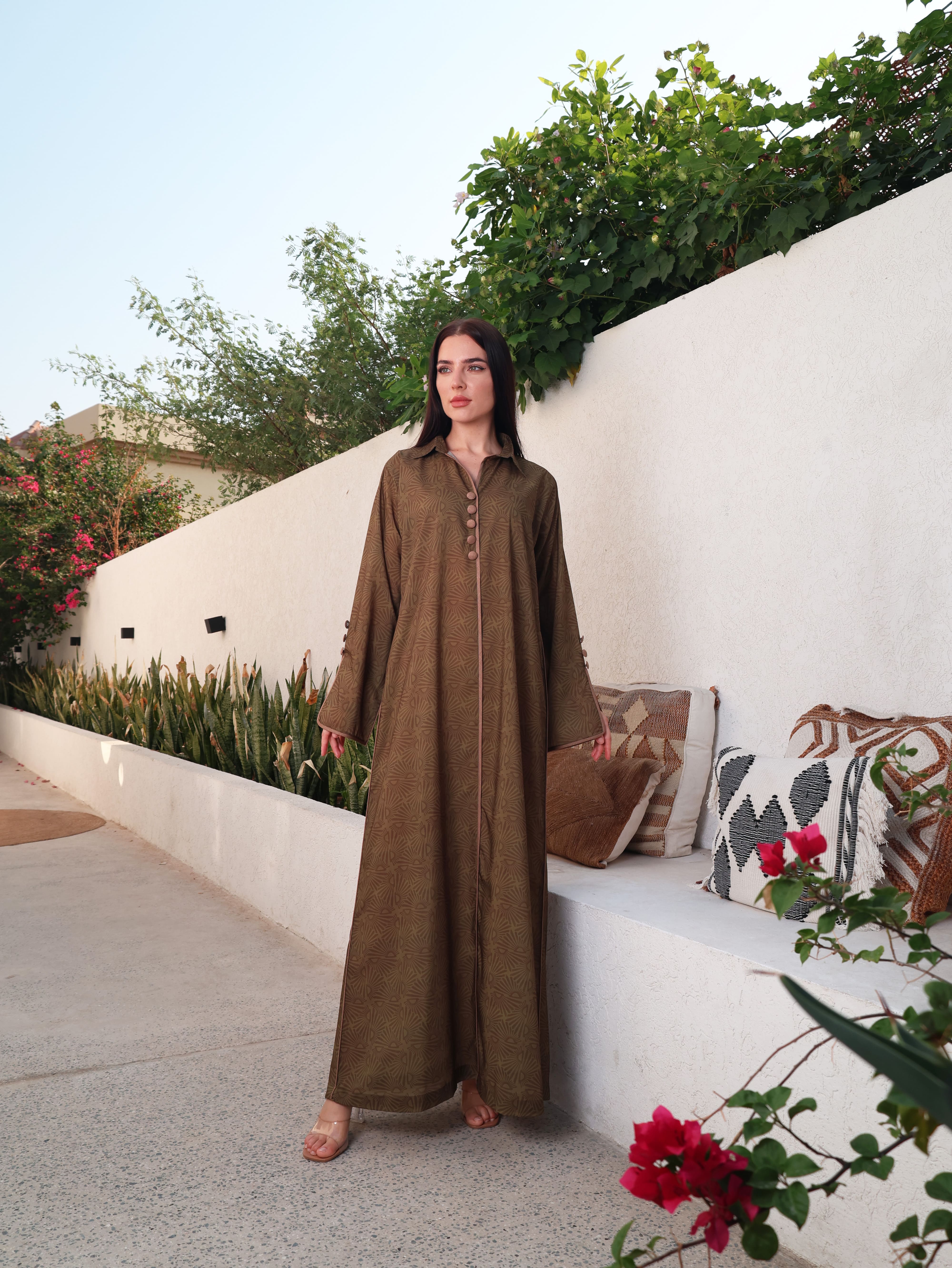A green cotton jalabiya featuring a classic shirt collar for a contemporary touch. The neckline, sleeves, and sides of the bodice are detailed with brown piping and button accents, combining structured elegance with timeless style.