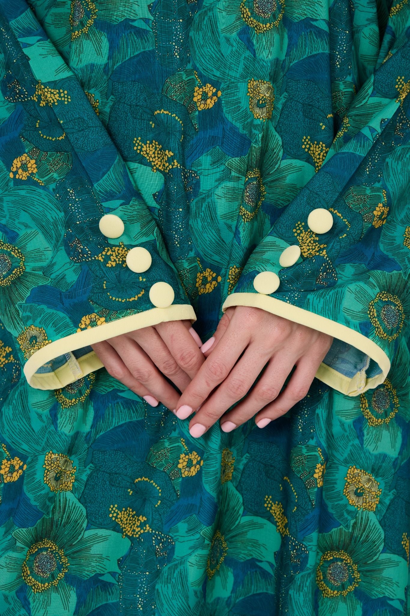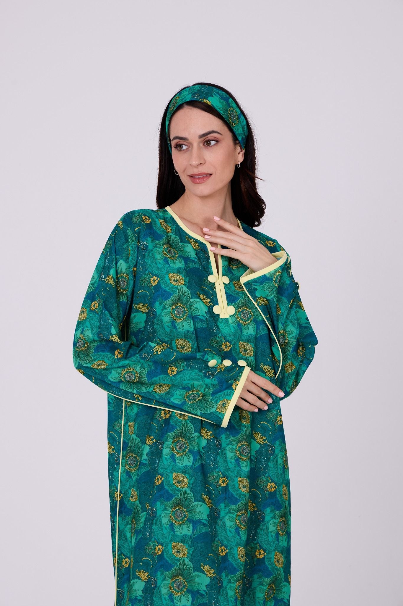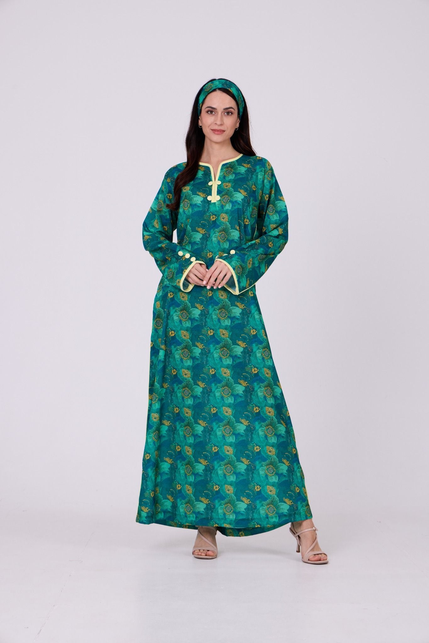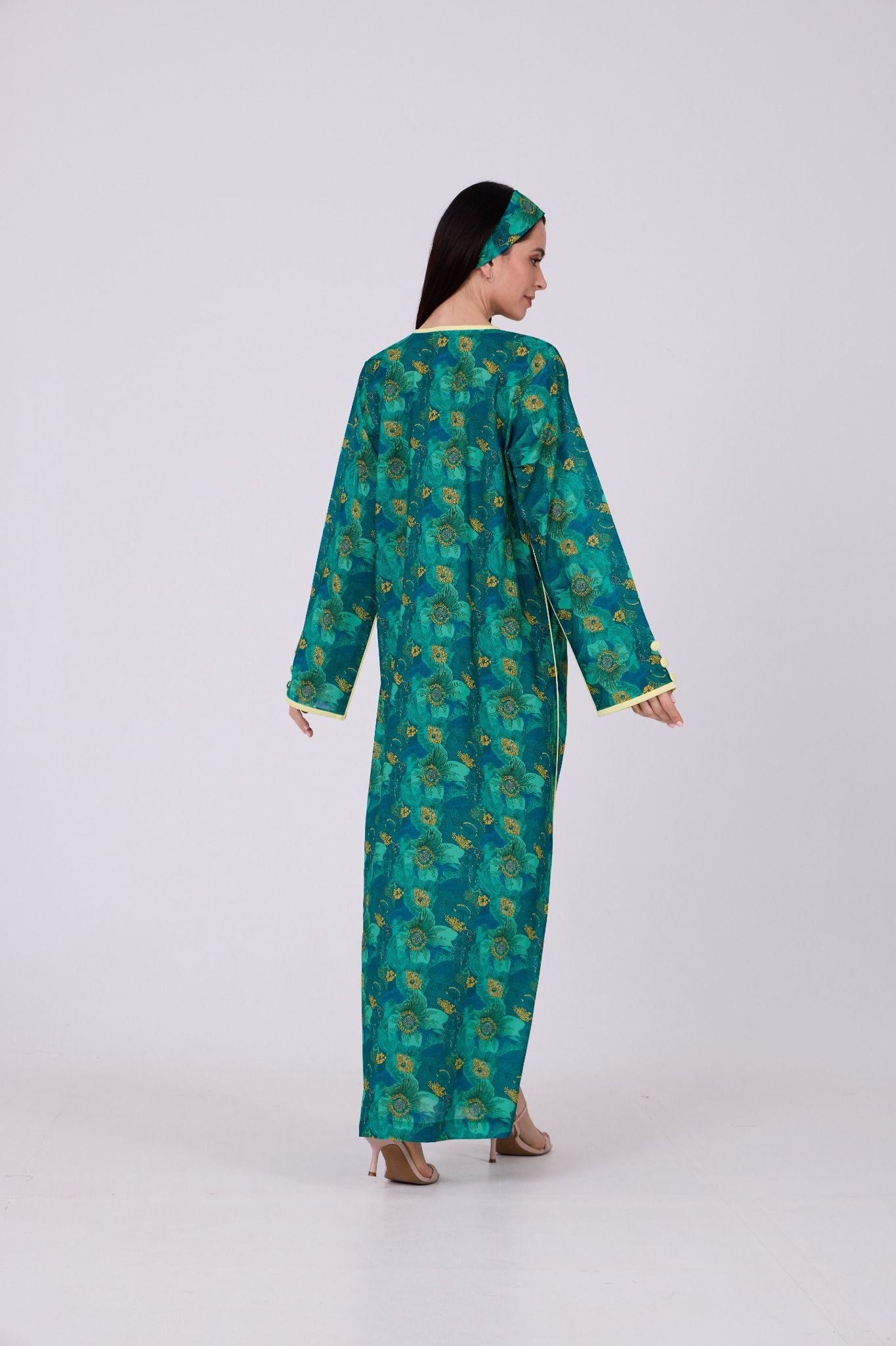 Exquisite green Jalabiya, featuring a lush floral print that captures the beauty of a blooming garden. Crafted from premium 100% cotton, this piece is designed for both comfort and elegance. The design is elevated by contrasting pale yellow piping that traces the neckline and sleeves, while unique button accents and interlaced strap detailing at the collar add a touch of sophisticated craftsmanship. Perfectly tailored for a graceful silhouette, it is a timeless addition to your modest wardrobe.
