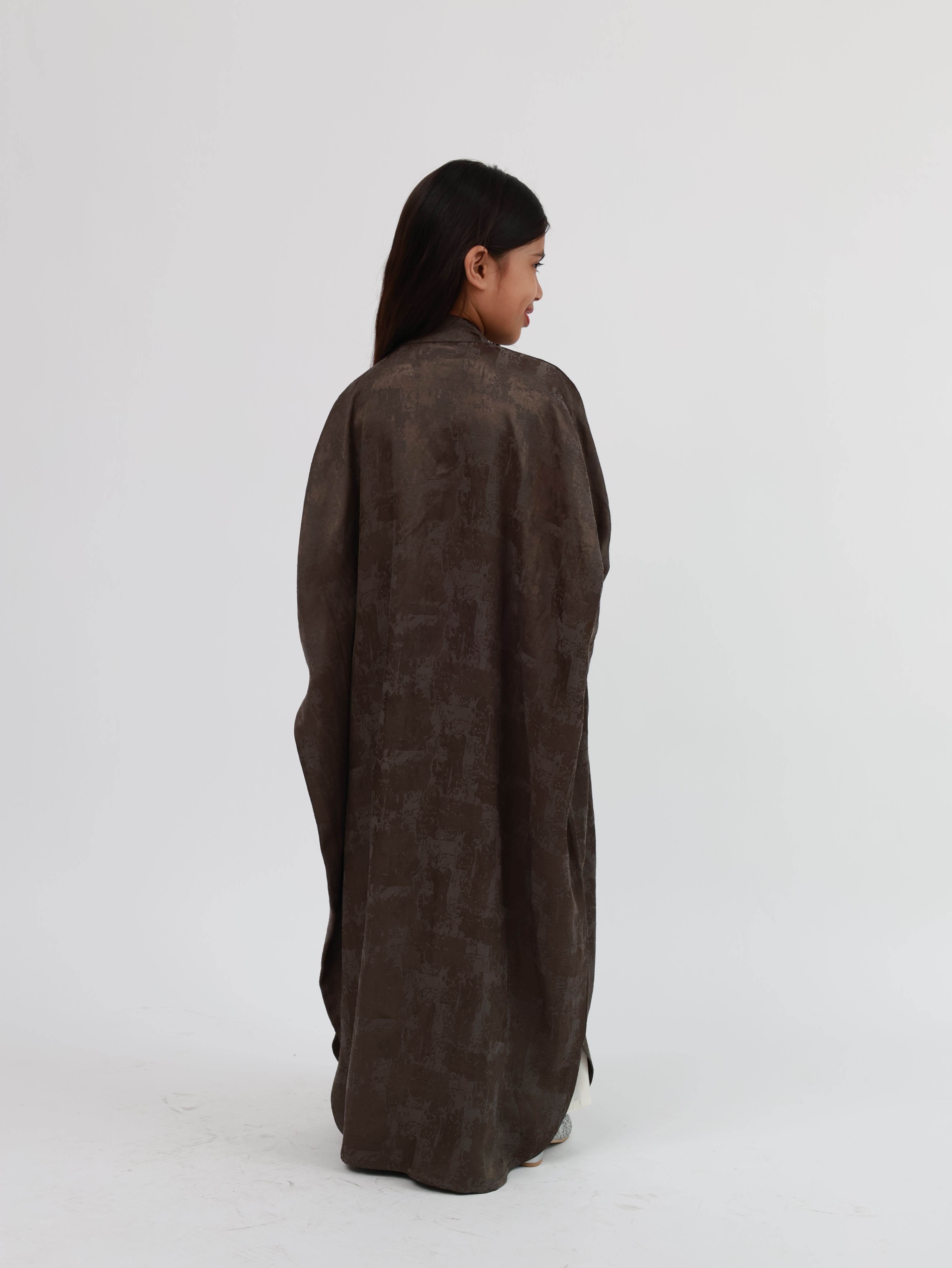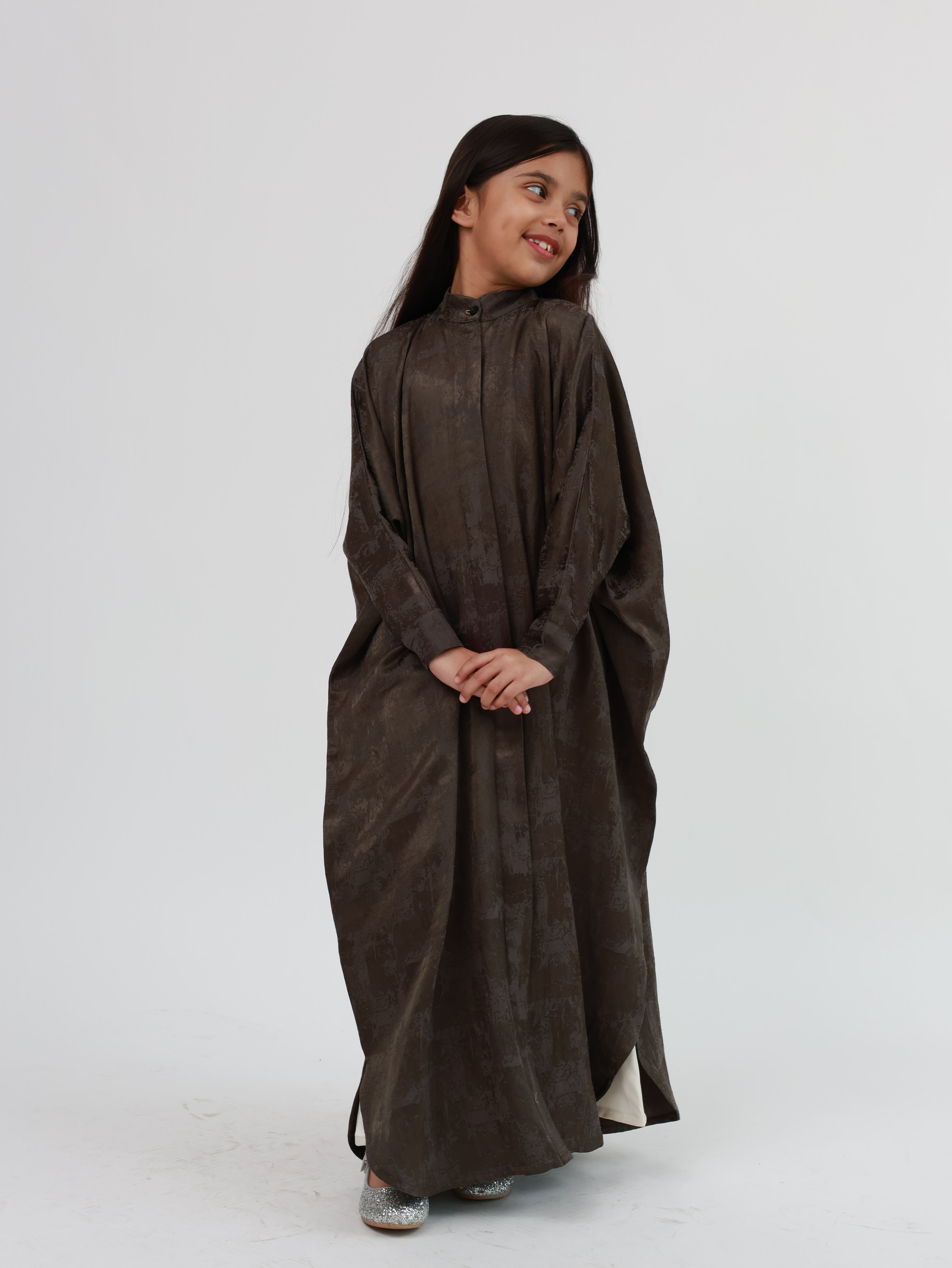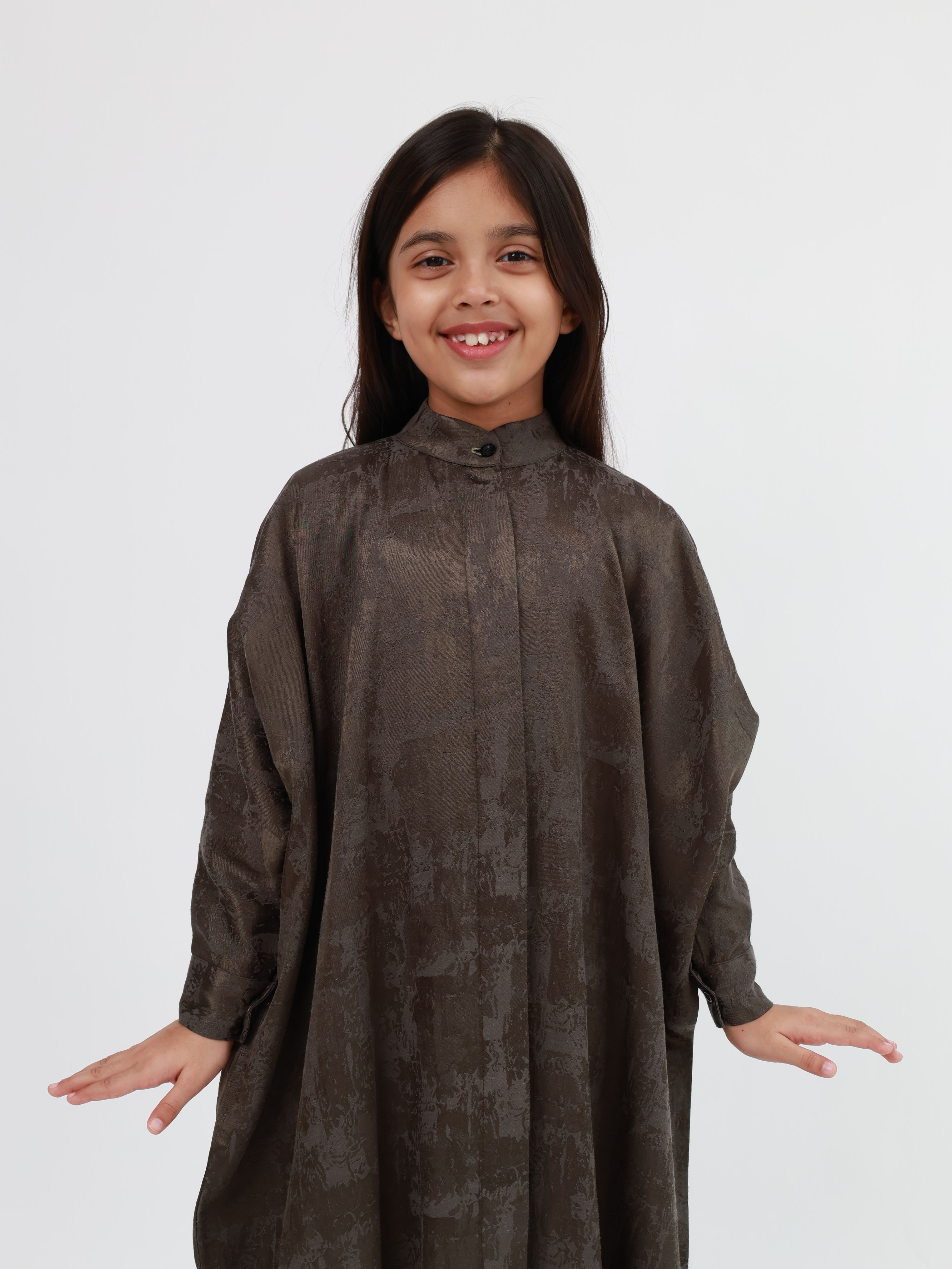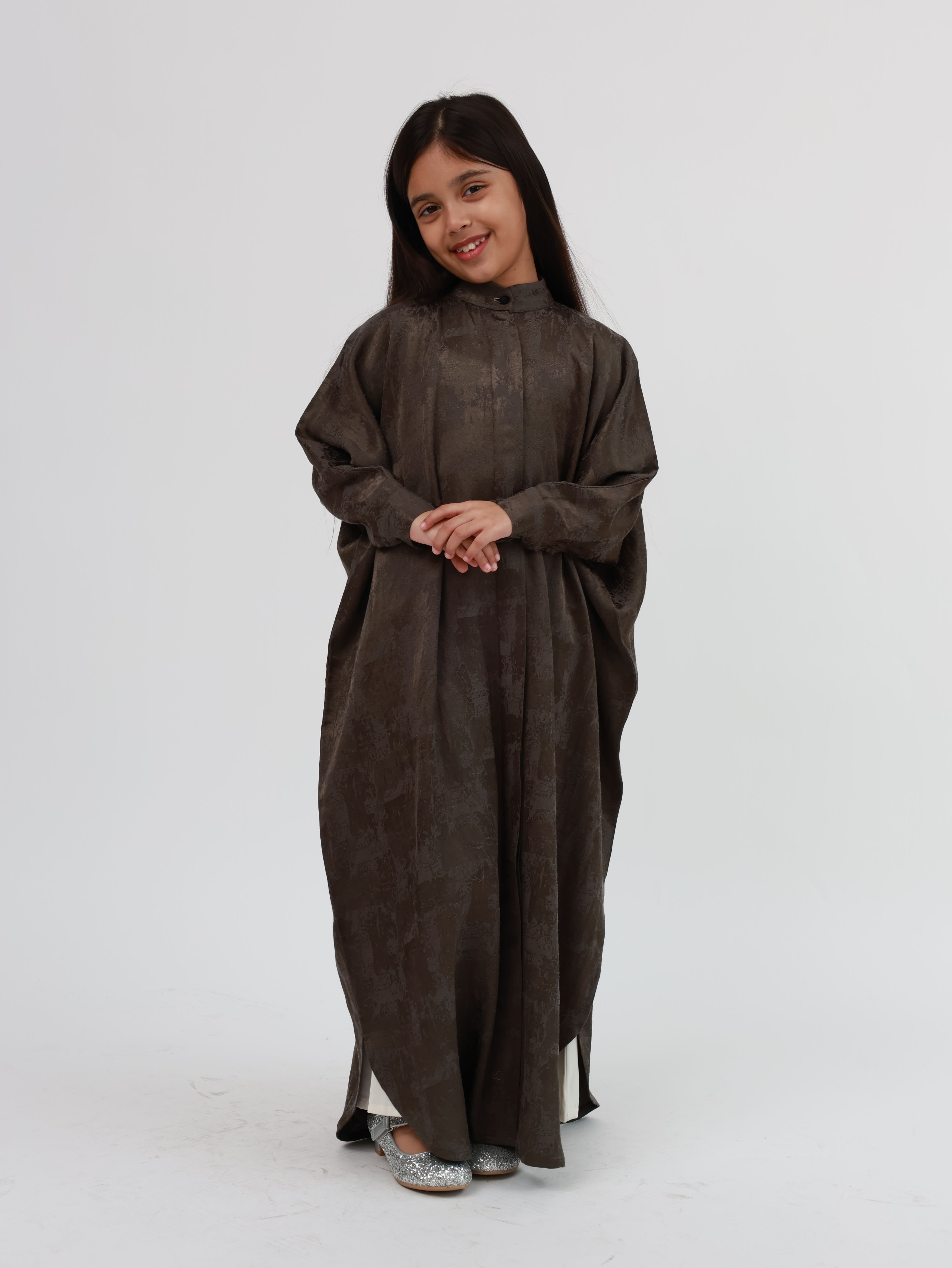This elegant abaya comes in a rich dark olive green colour, made from textured crepe fabric for a soft yet structured feel. It features a stand collar with buttons running down the front and on the sleeve cuffs, giving it a clean and polished look — perfect for both casual and dressy occasions.