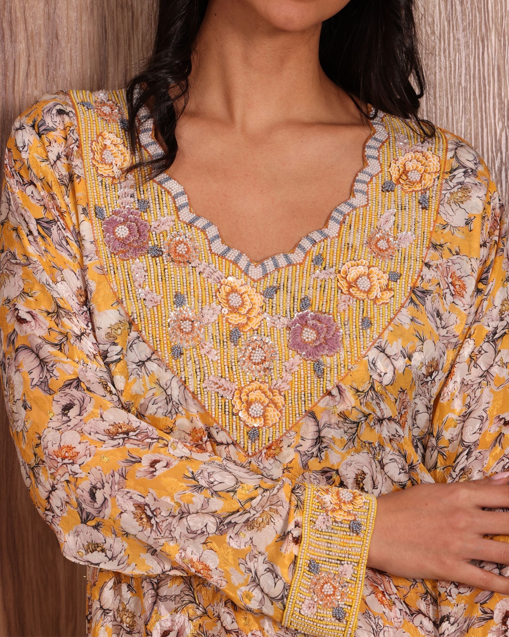 A warm mustard-gold premium jacquard mukhwara adorned with soft ivory and beige floral motifs, beautifully complemented by intricate hand embellishments in tones of blush pink, peach, and champagne. The neckline and cuffs feature detailed beadwork and sequin embroidery, adding refined texture and luminous elegance. The woven jacquard base enhances the richness of the design, creating a timeless and luxurious statement.