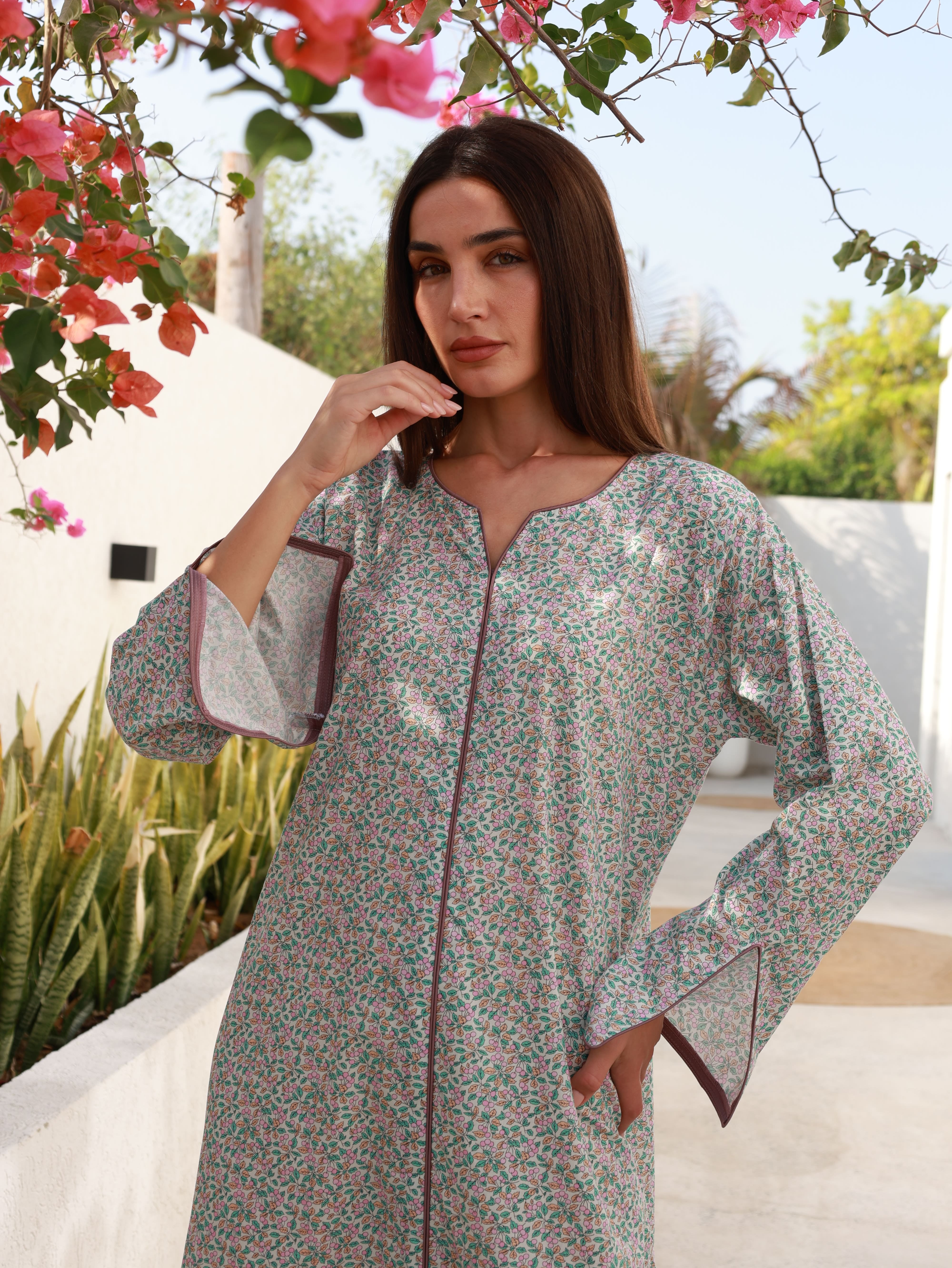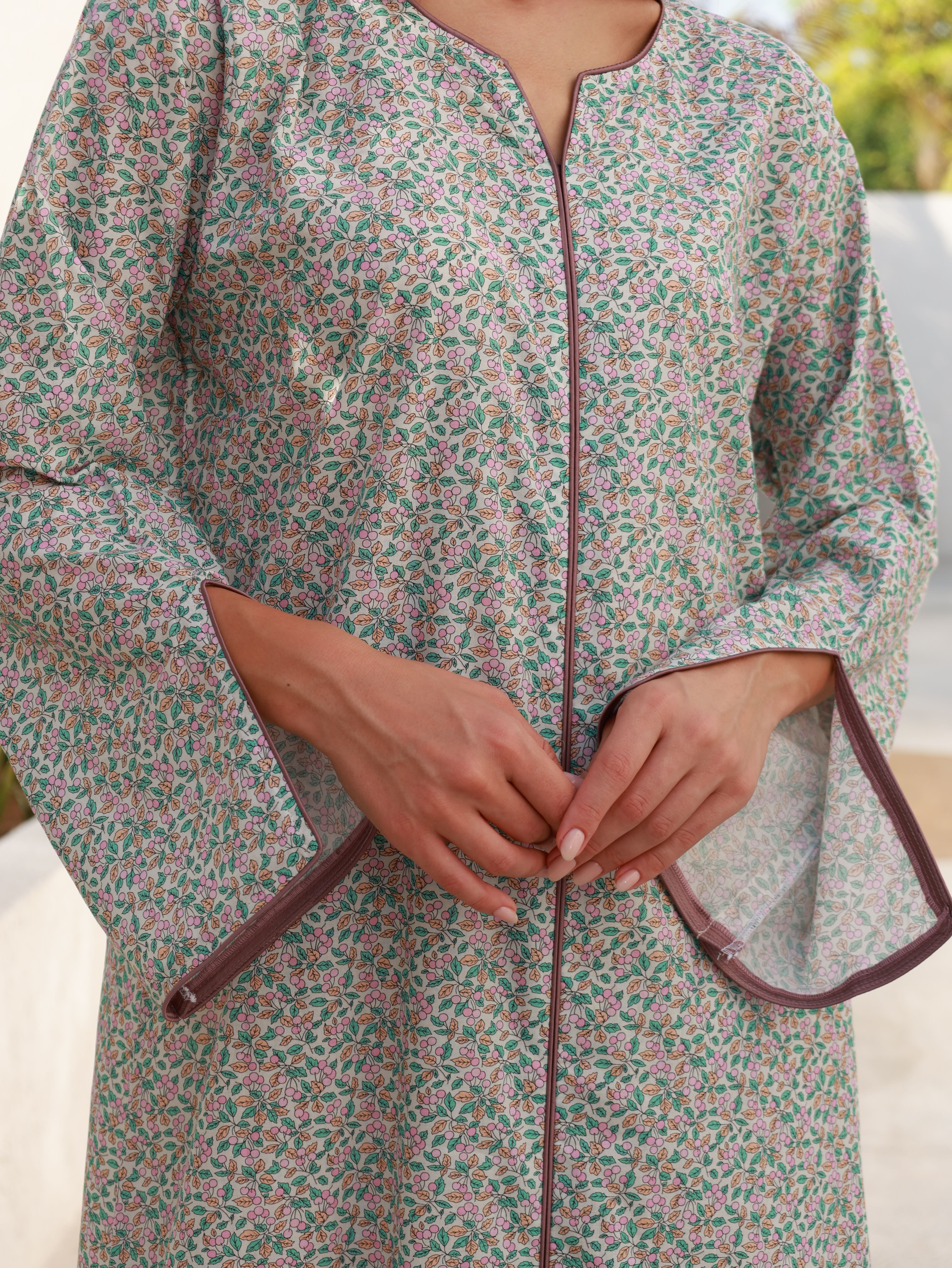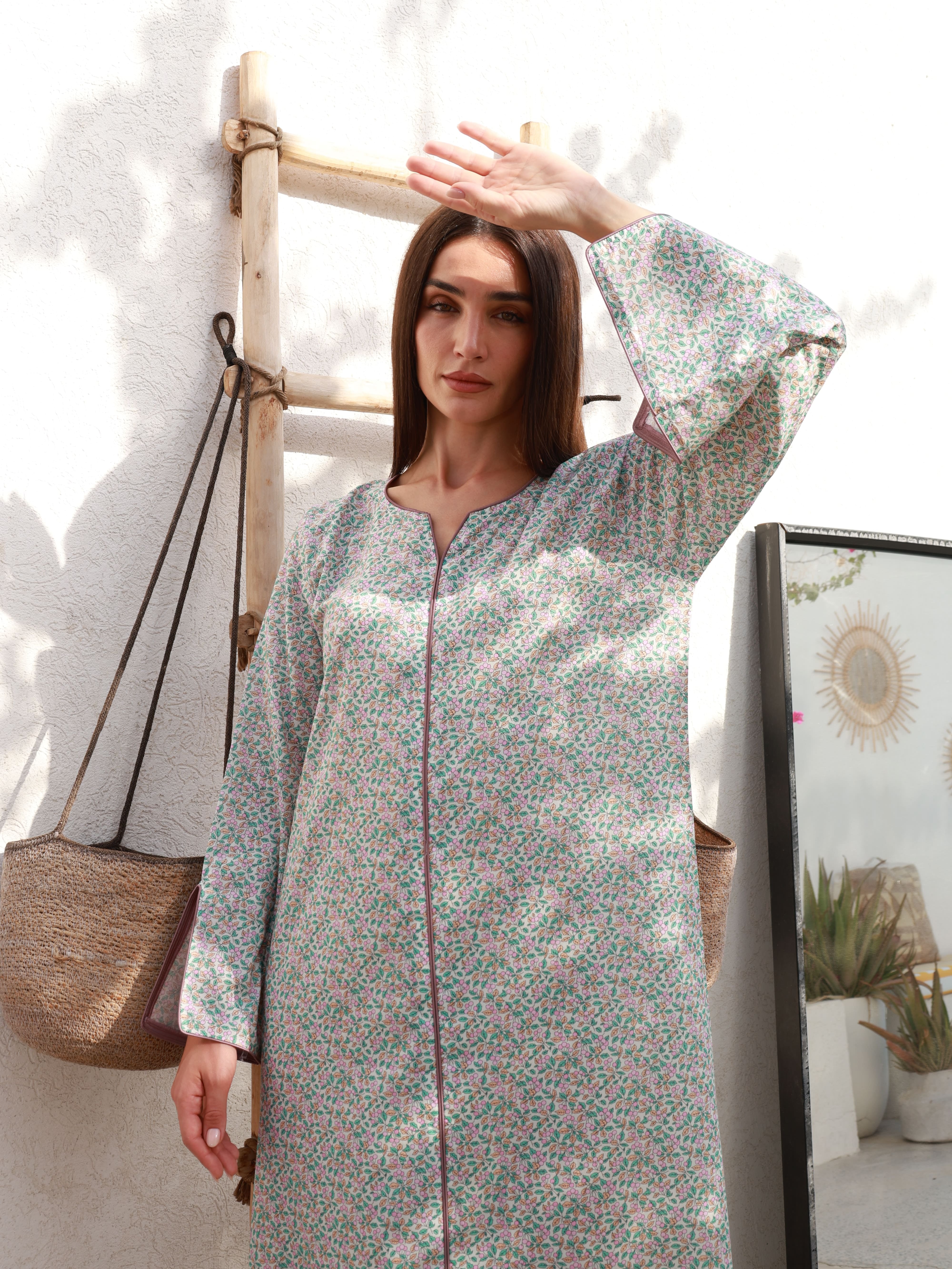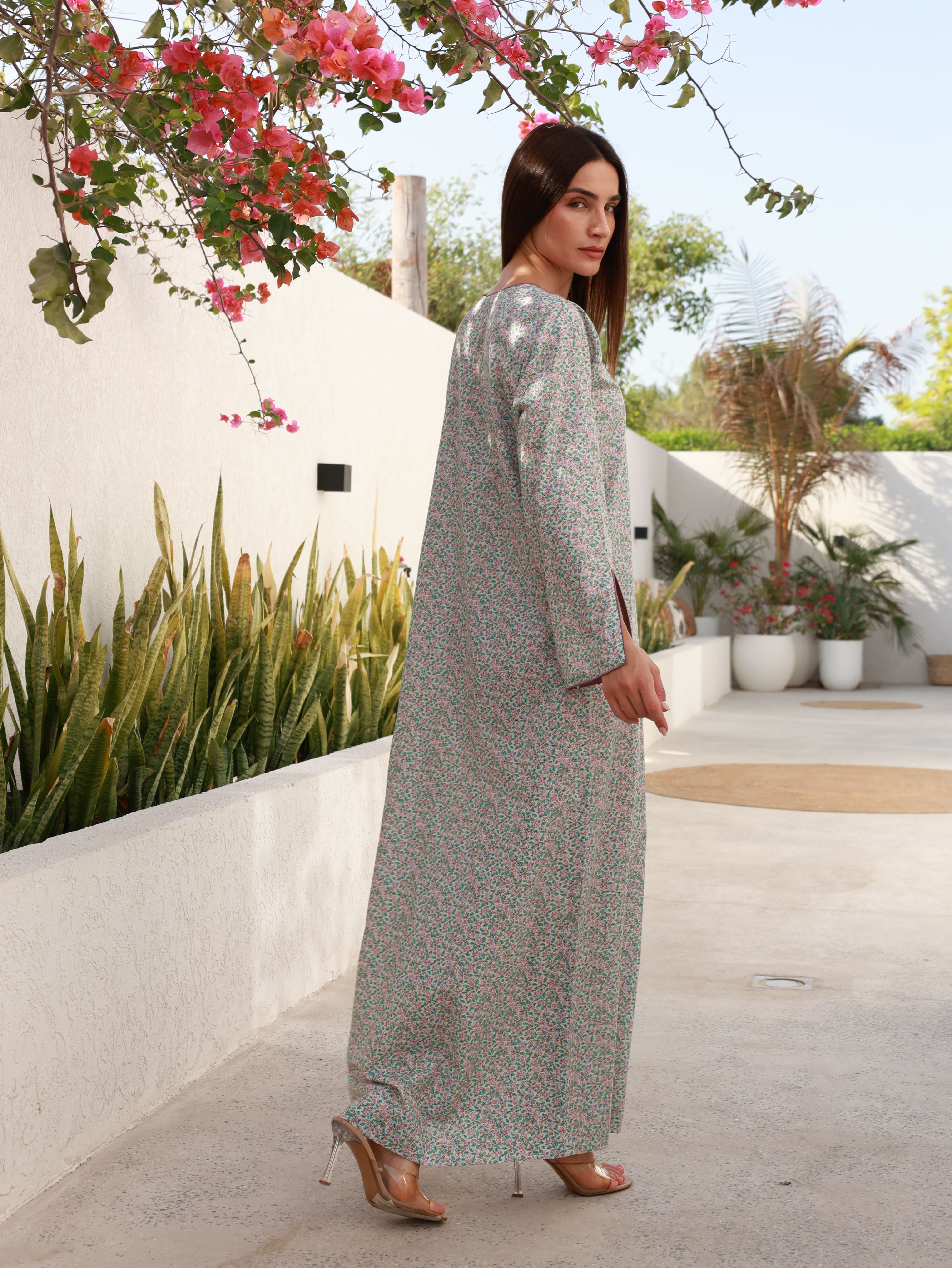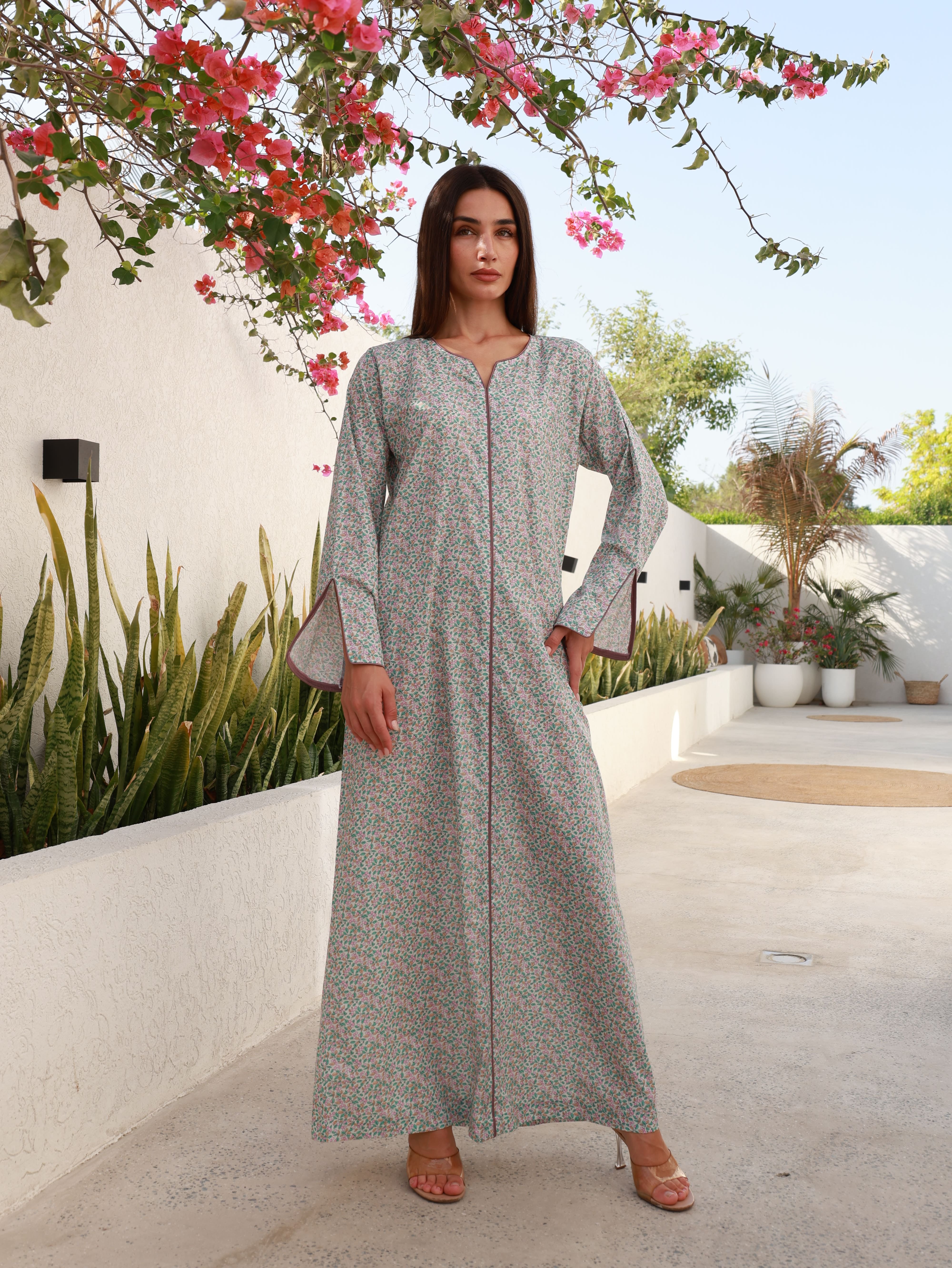 A soft grey cotton jalabiya in delicate floral print, enhanced with subtle piping along the neckline, hem, and sleeves, offering a refined, elegant look perfect for everyday wear.
