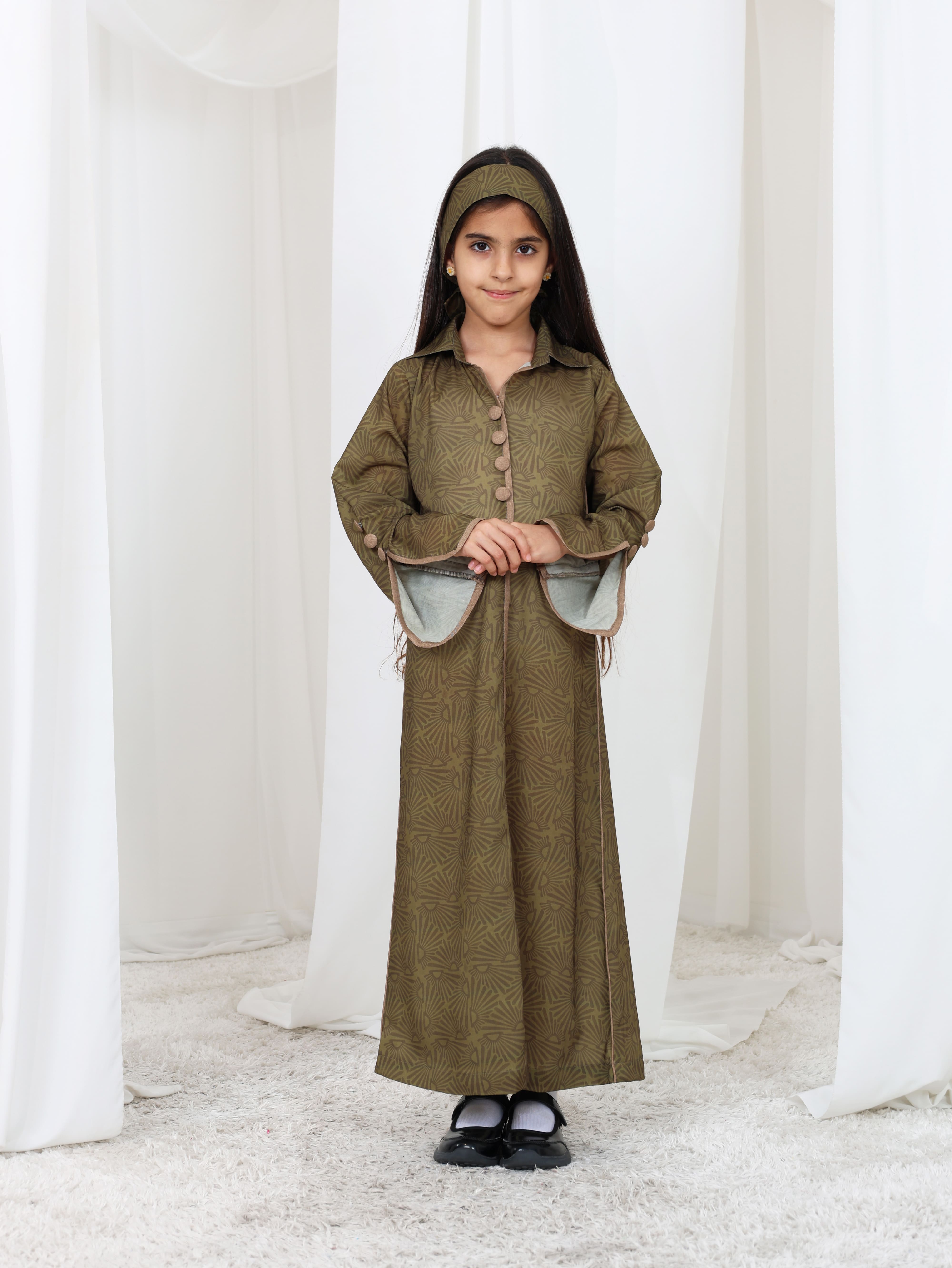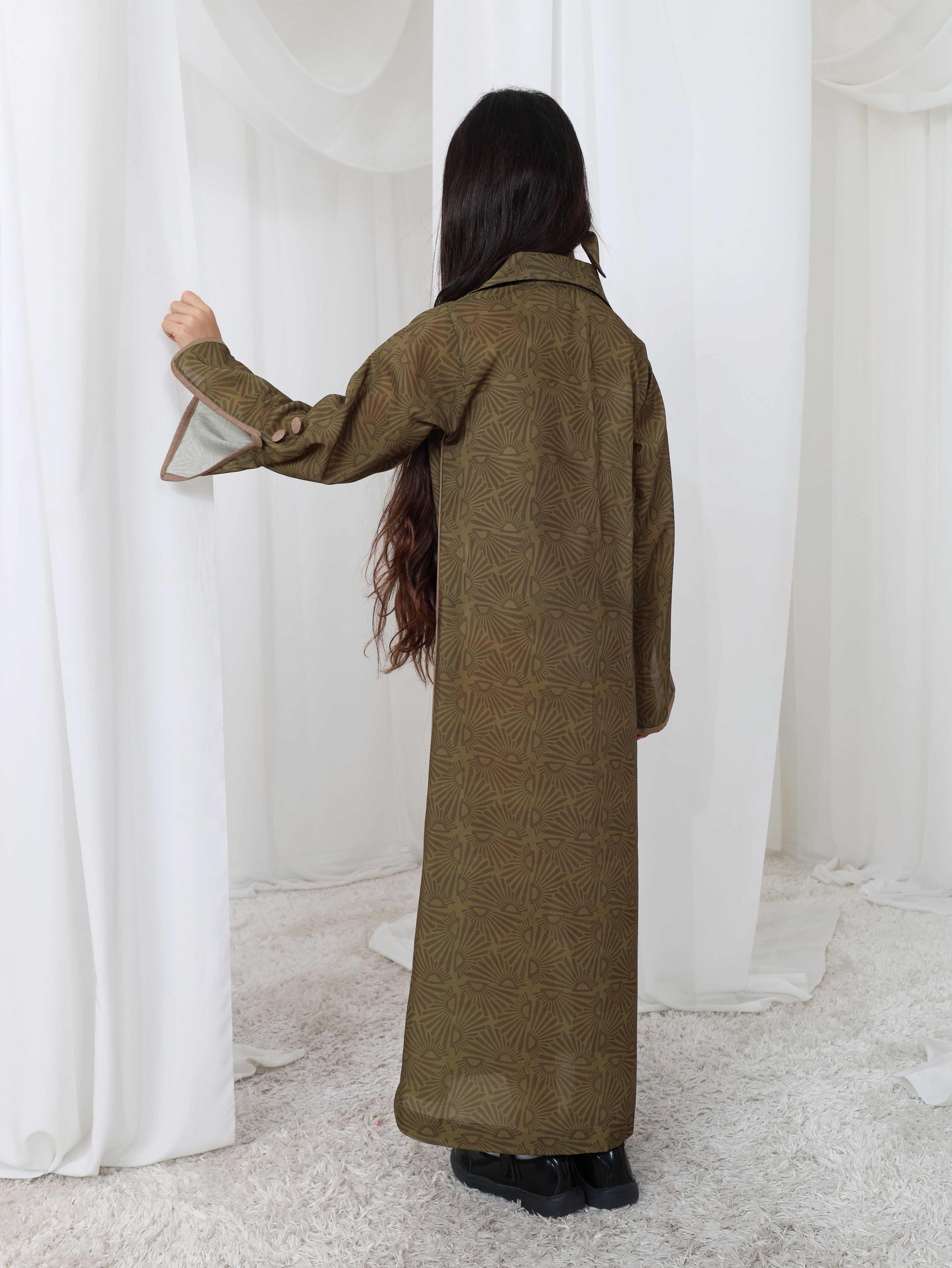 A green cotton jalabiya featuring a classic shirt collar for a contemporary touch. The neckline, sleeves, and sides of the bodice are detailed with brown piping and button accents, combining structured elegance with timeless style.