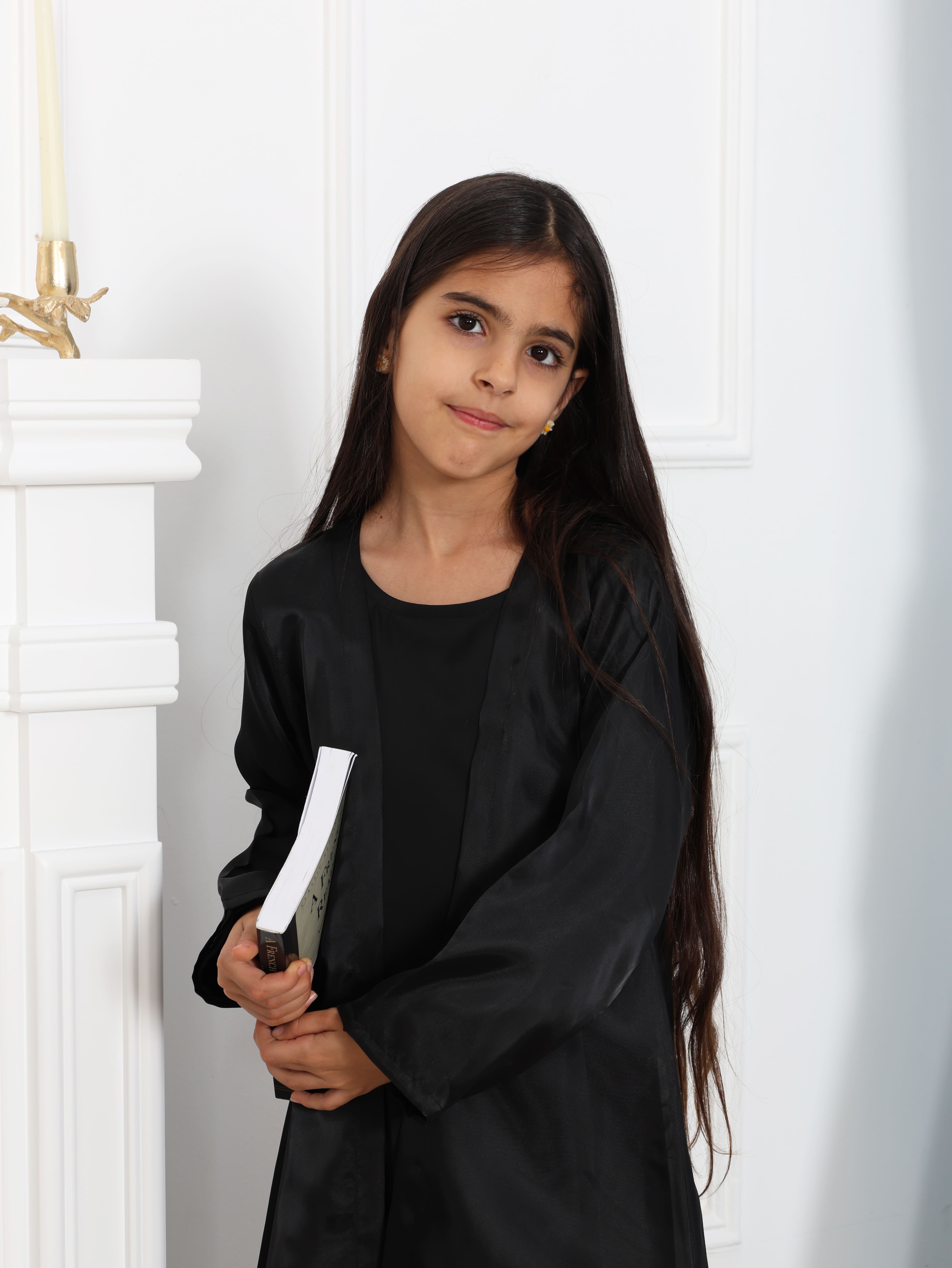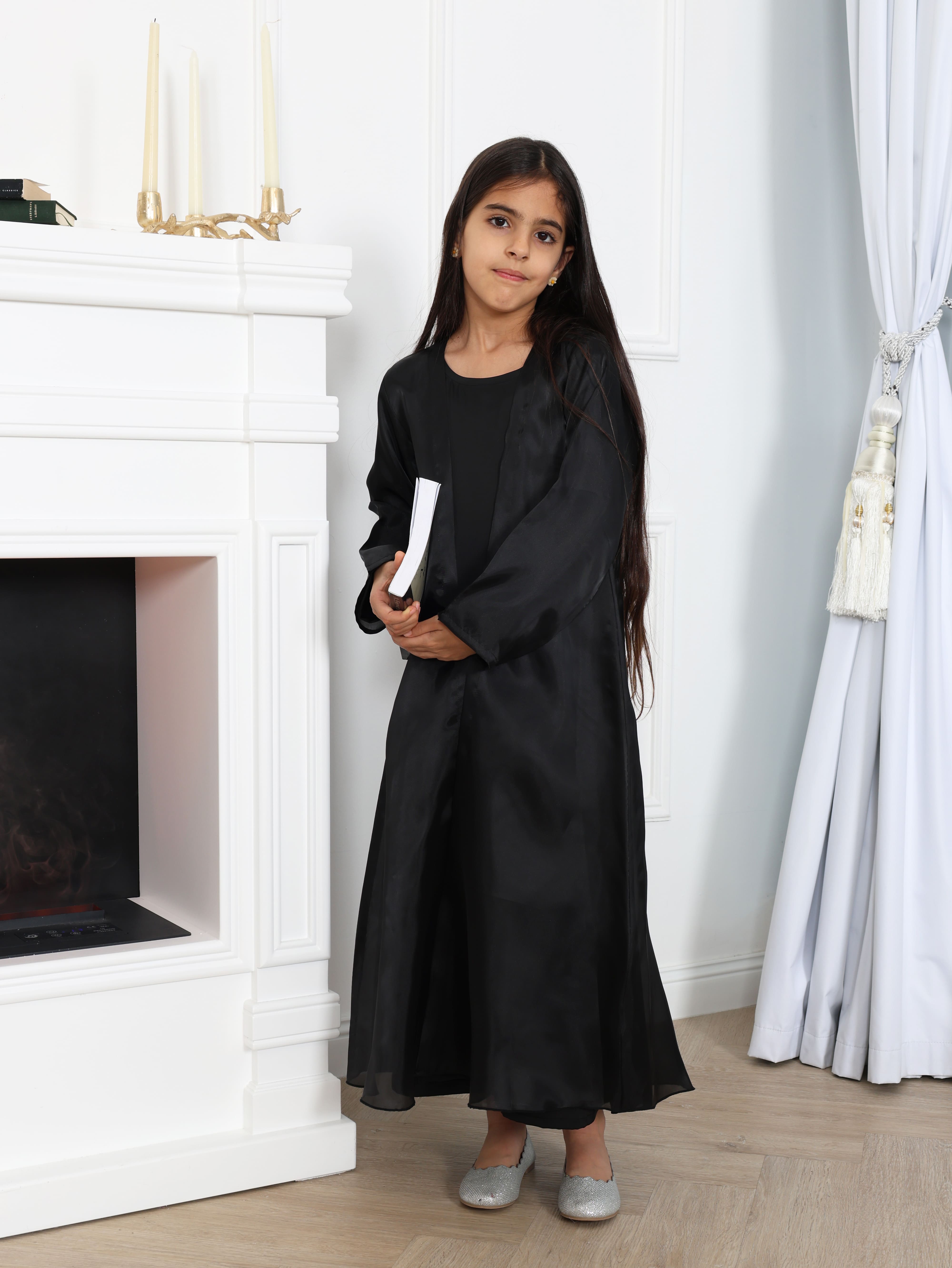 A timeless black organza abaya is defined by its sleek and minimal silhouette. Designed as an open abaya paired with a matching organza sheila and inner dress, it captures the essence of classic elegance with a modern, refined touch.