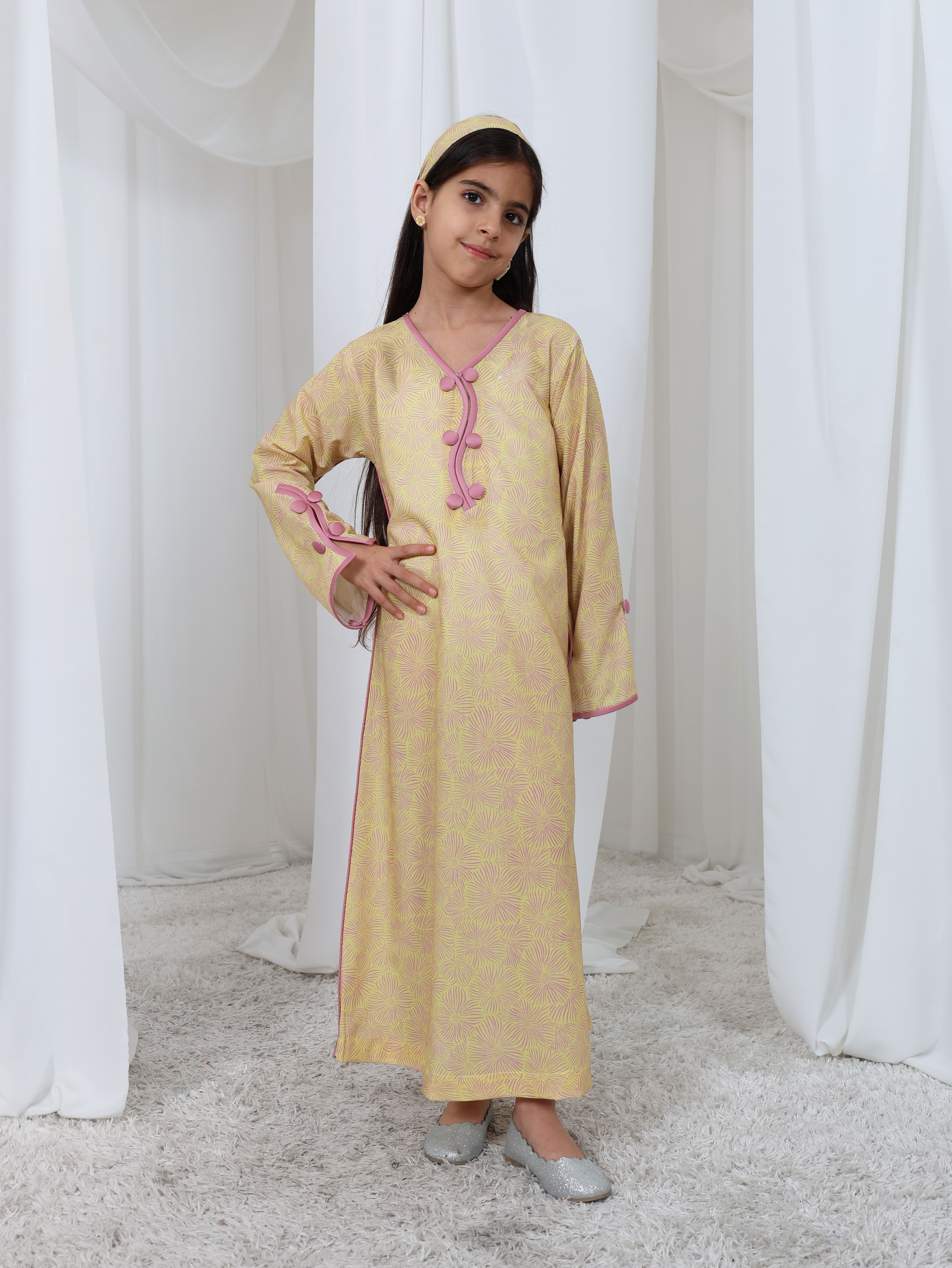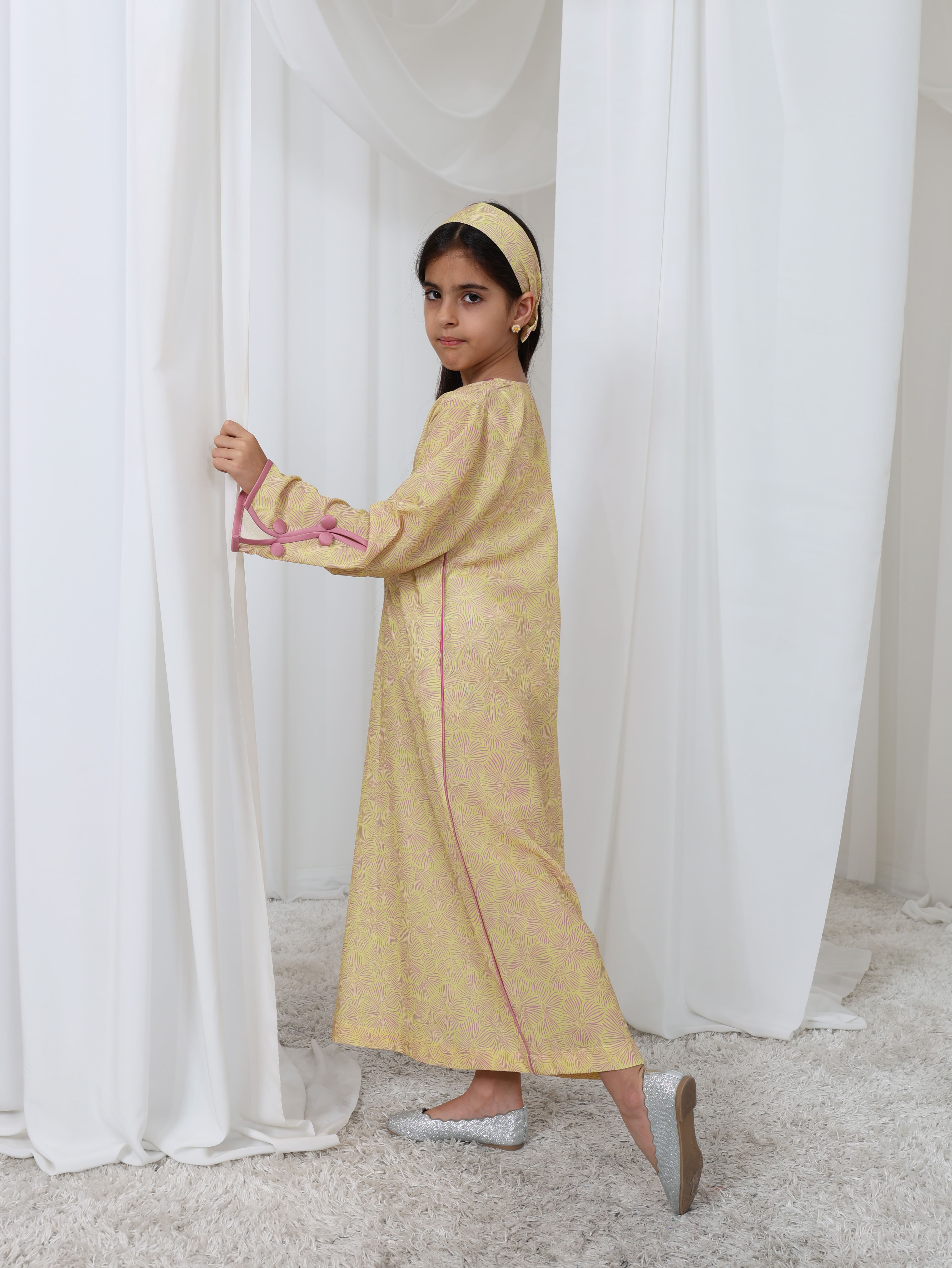 A soft yellow cotton jalabiya adorned with delicate floral prints, exuding gentle femininity. The neckline and sleeves are highlighted with pink piping and button detailing, adding a refined and charming touch to its elegant, garden-inspired design.