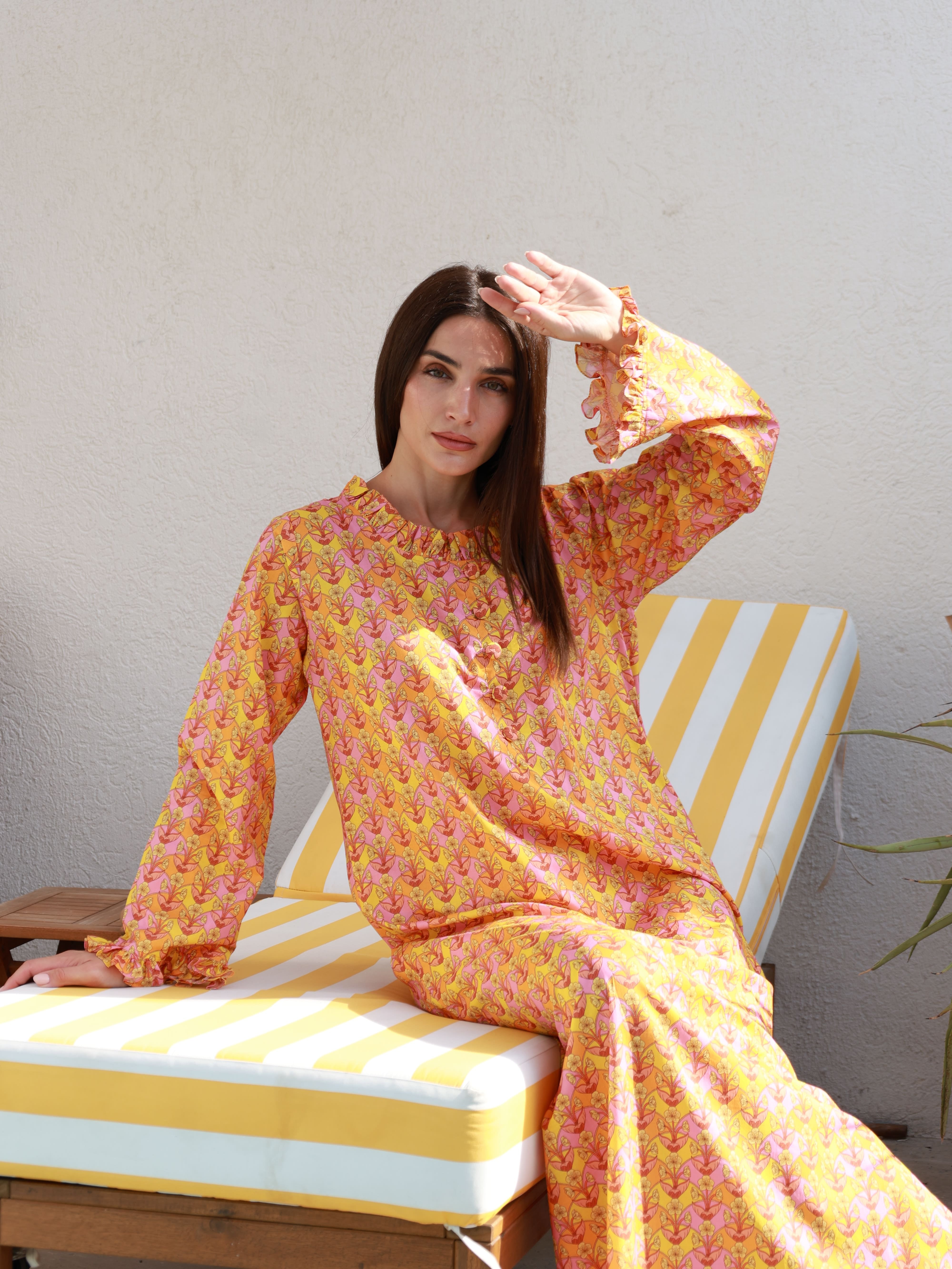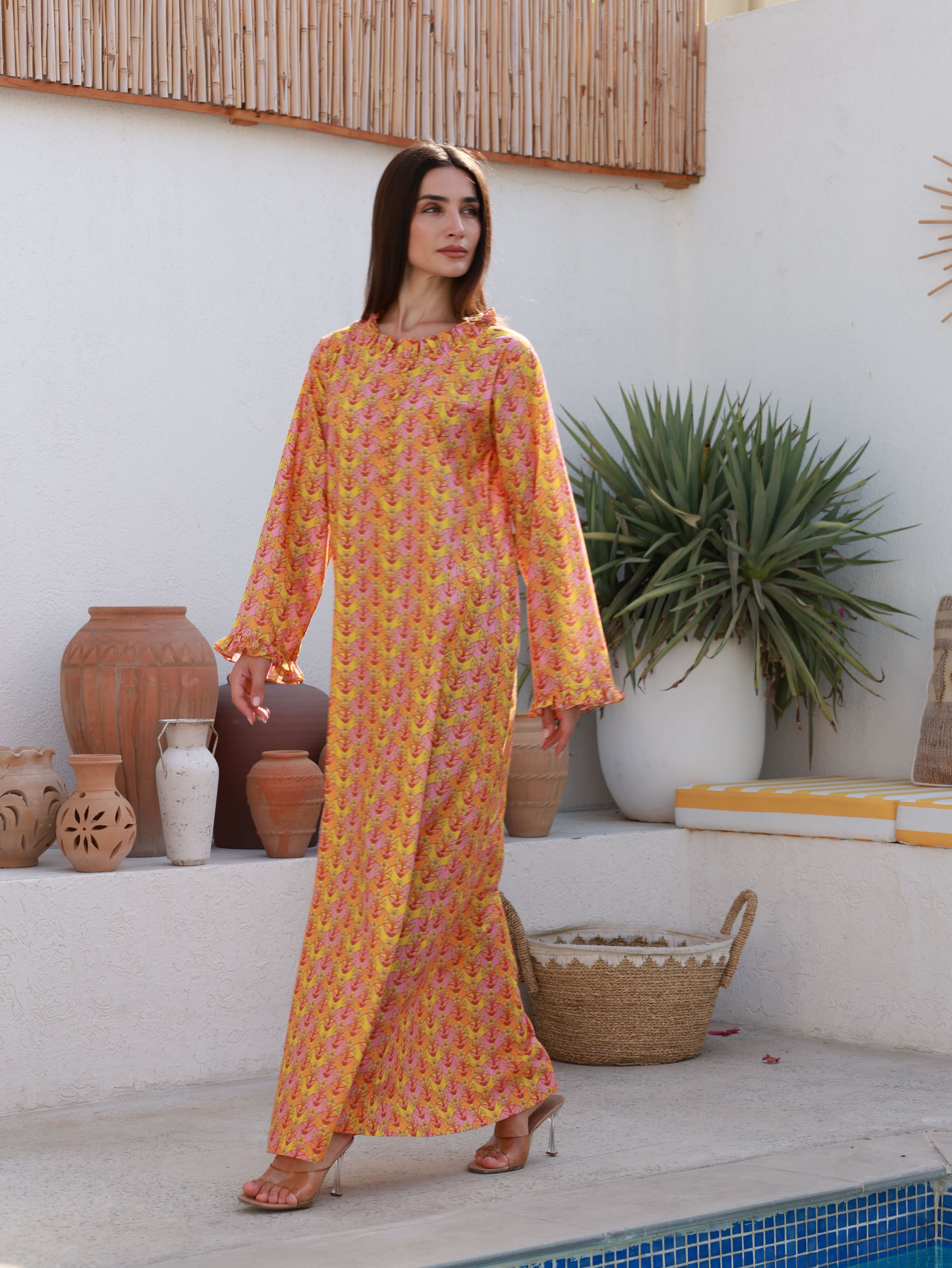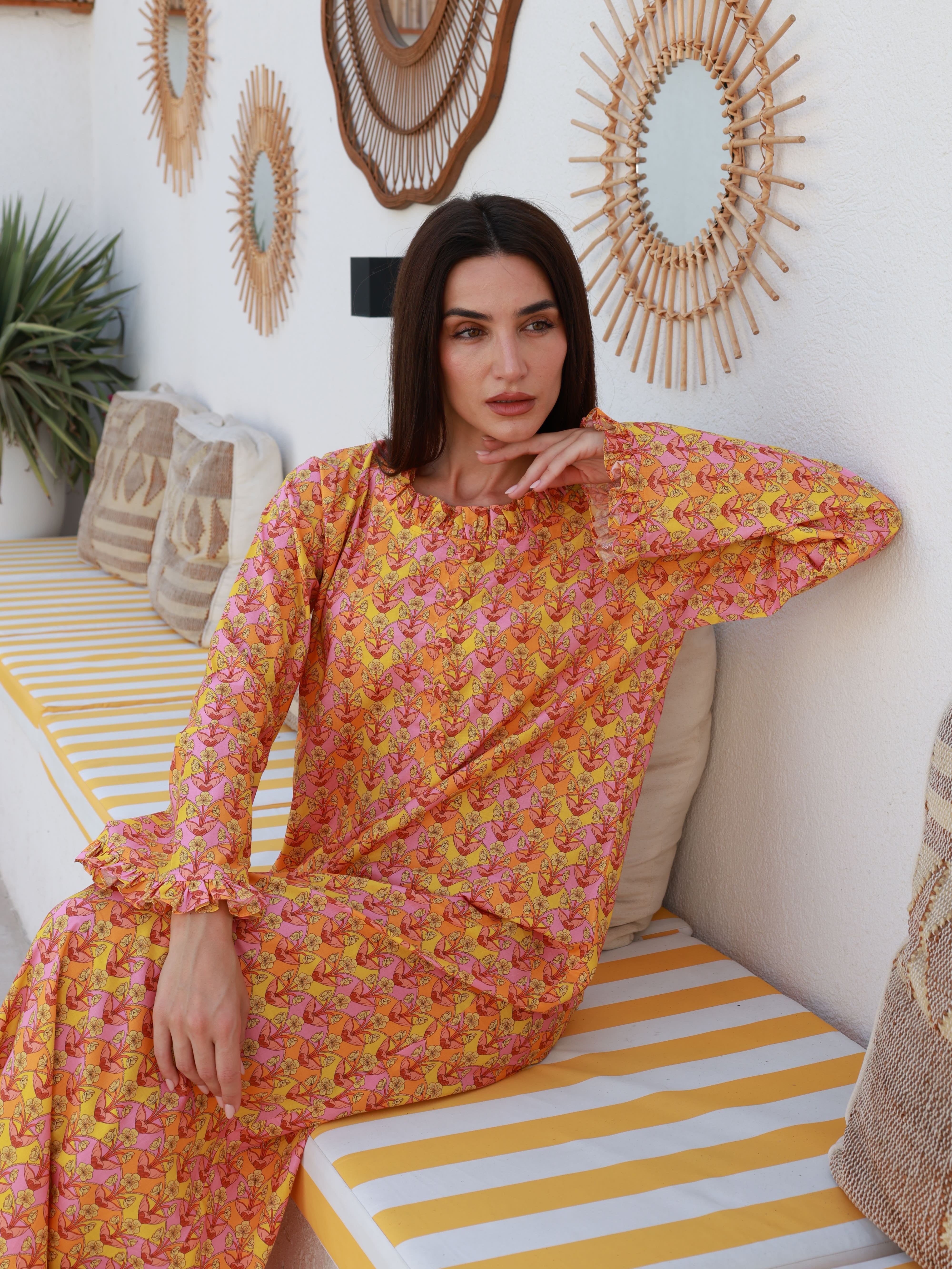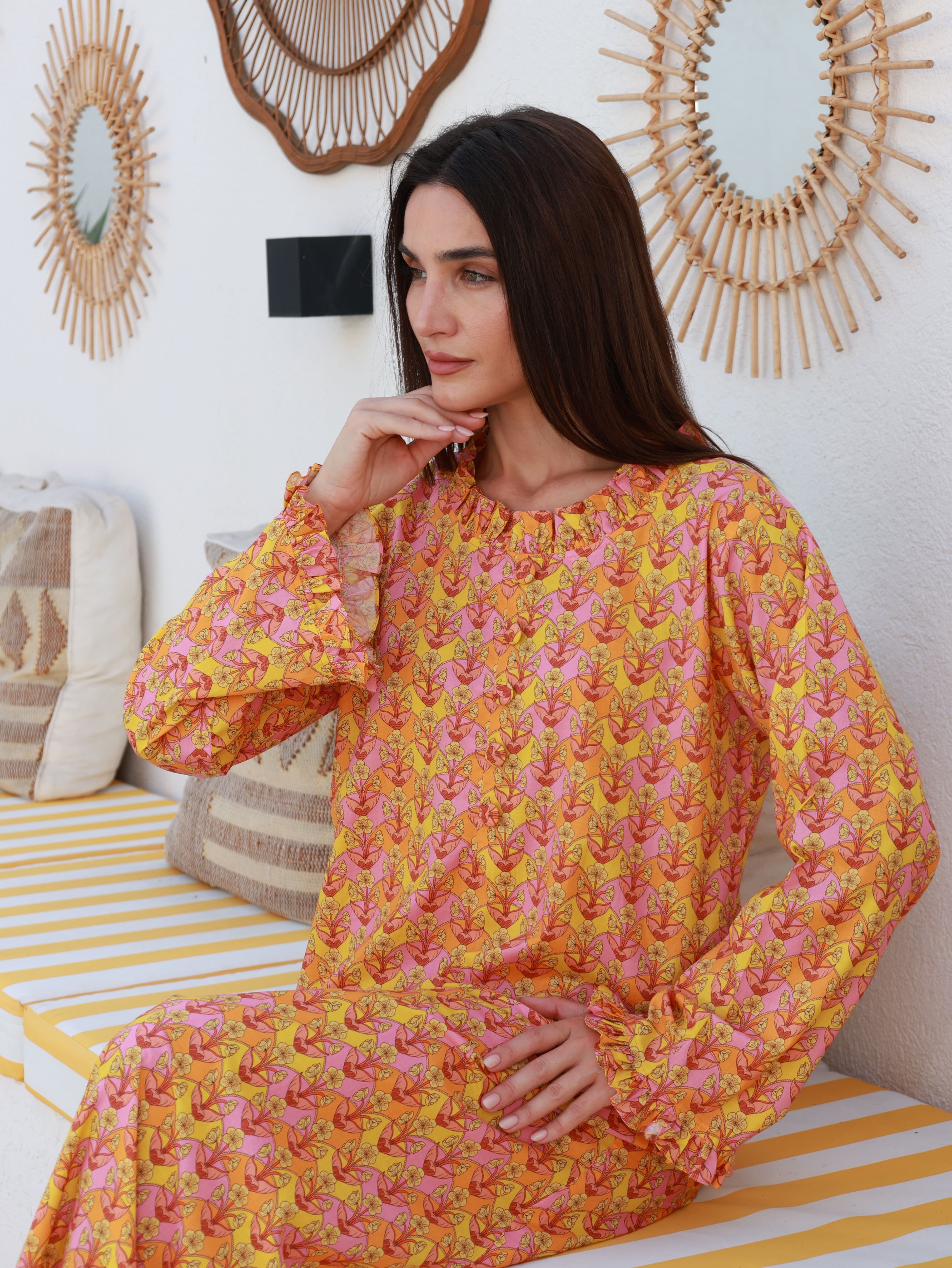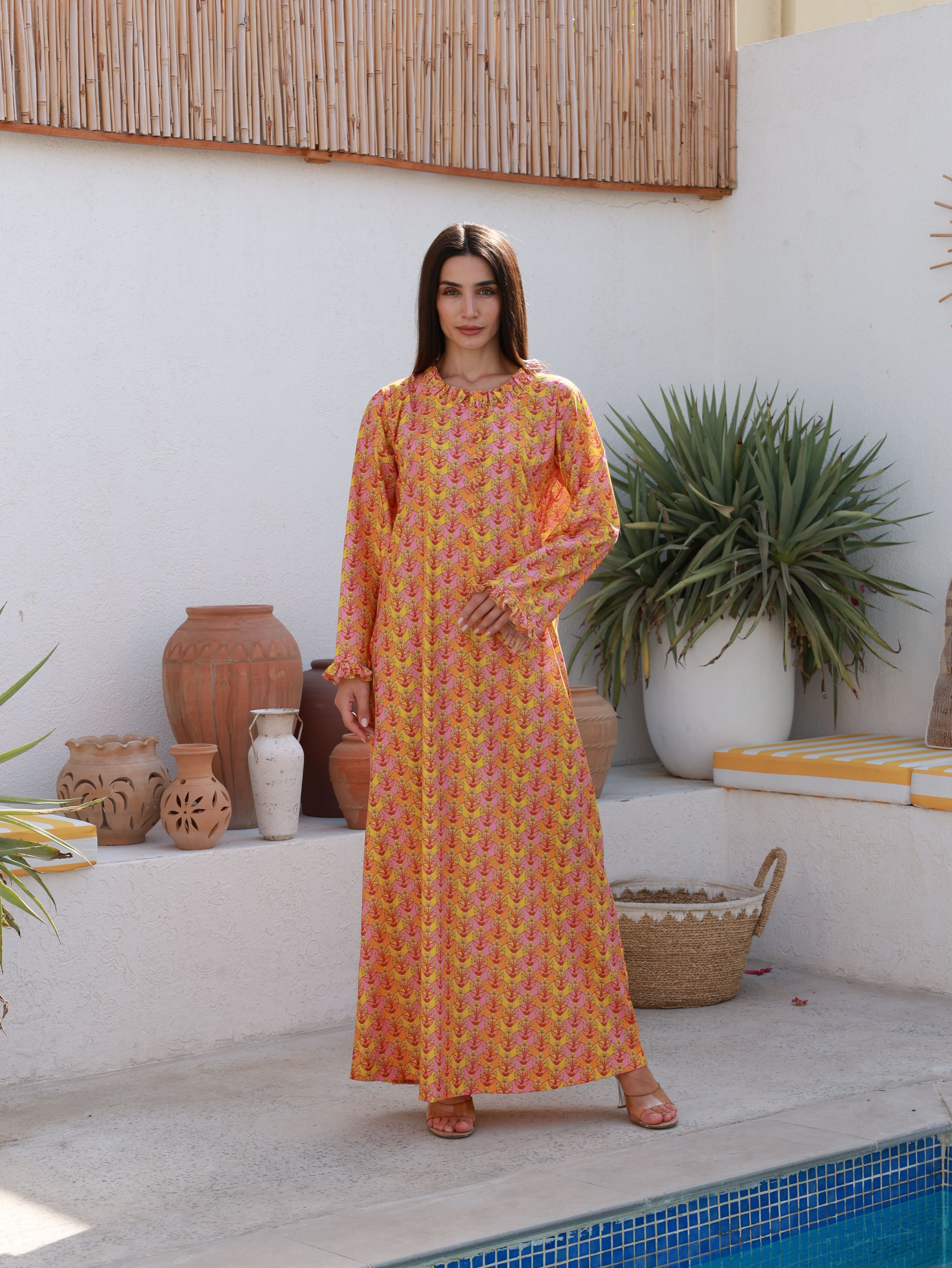 A vibrant orange cotton jalabiya in delicate floral print, featuring ruffled detailing along the neckline and sleeve ends, and a subtle show button on the chest, combining cheerful charm with feminine elegance.