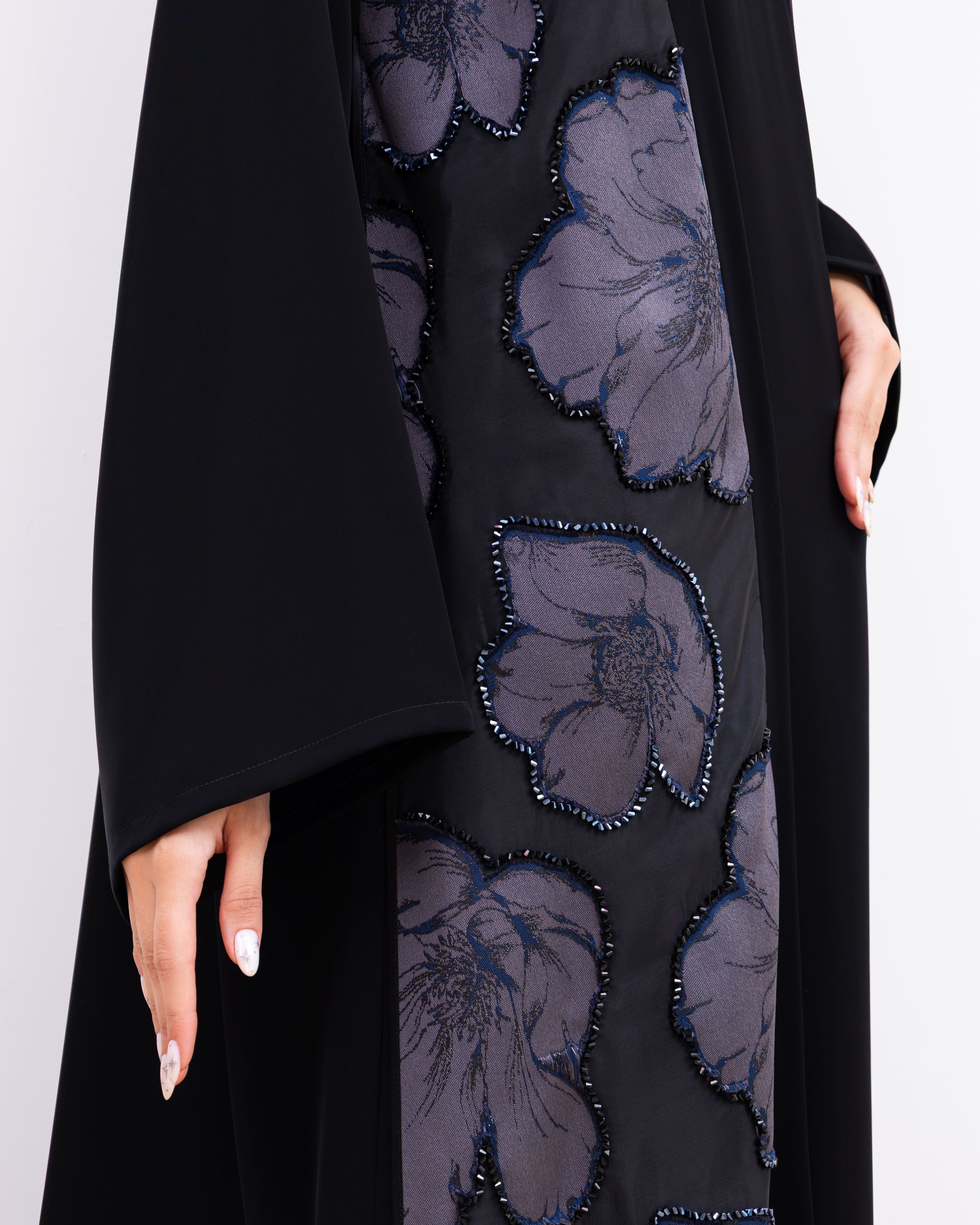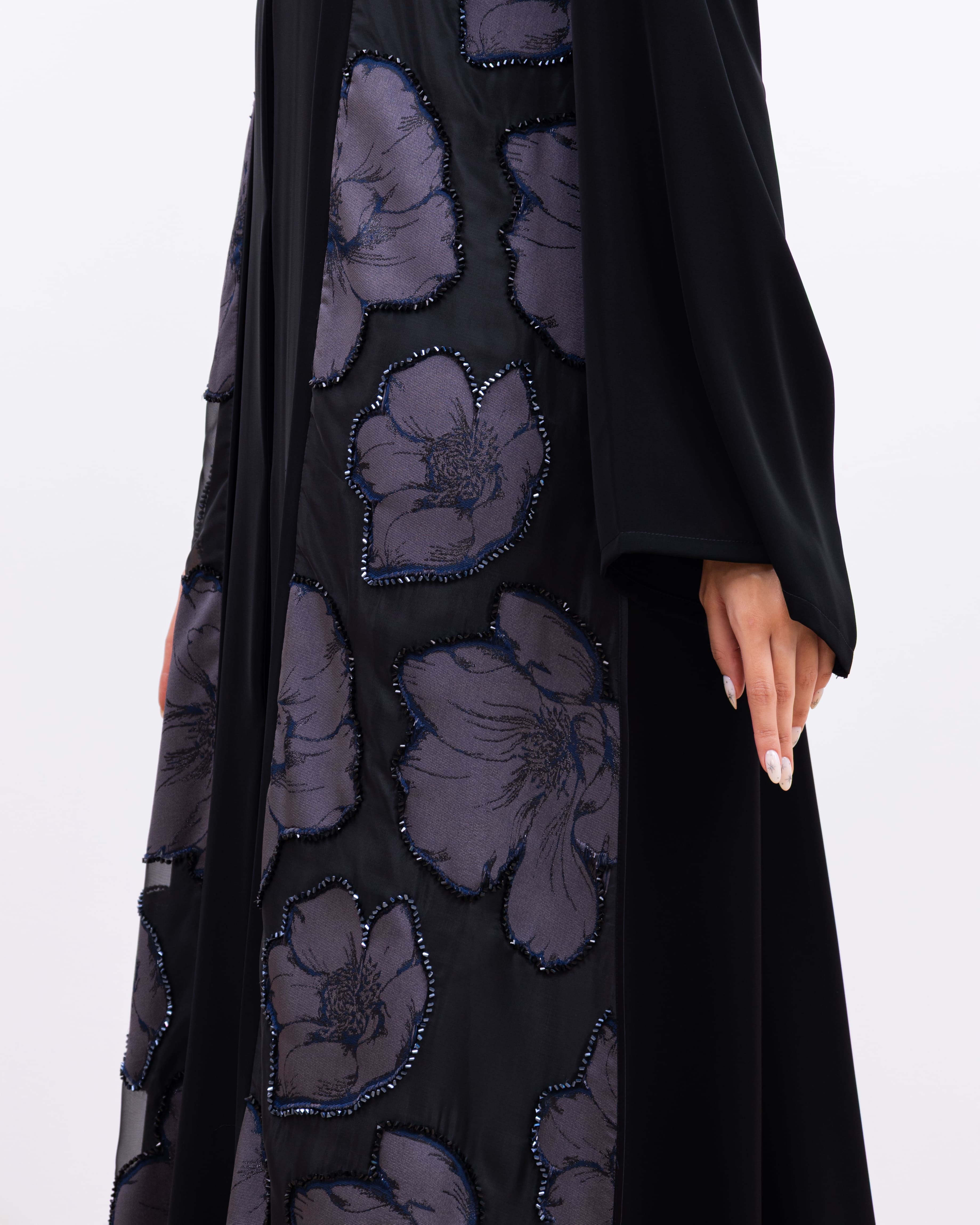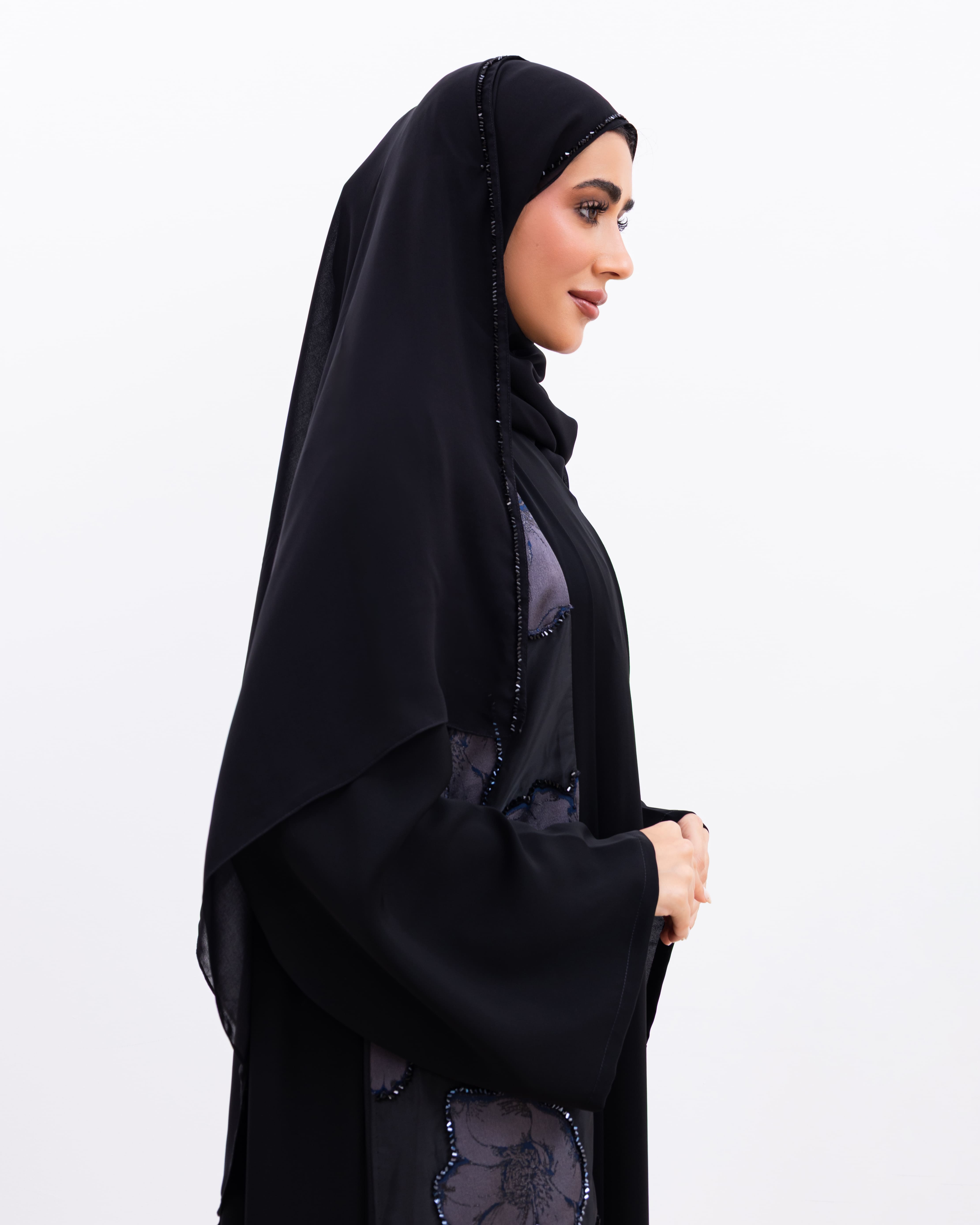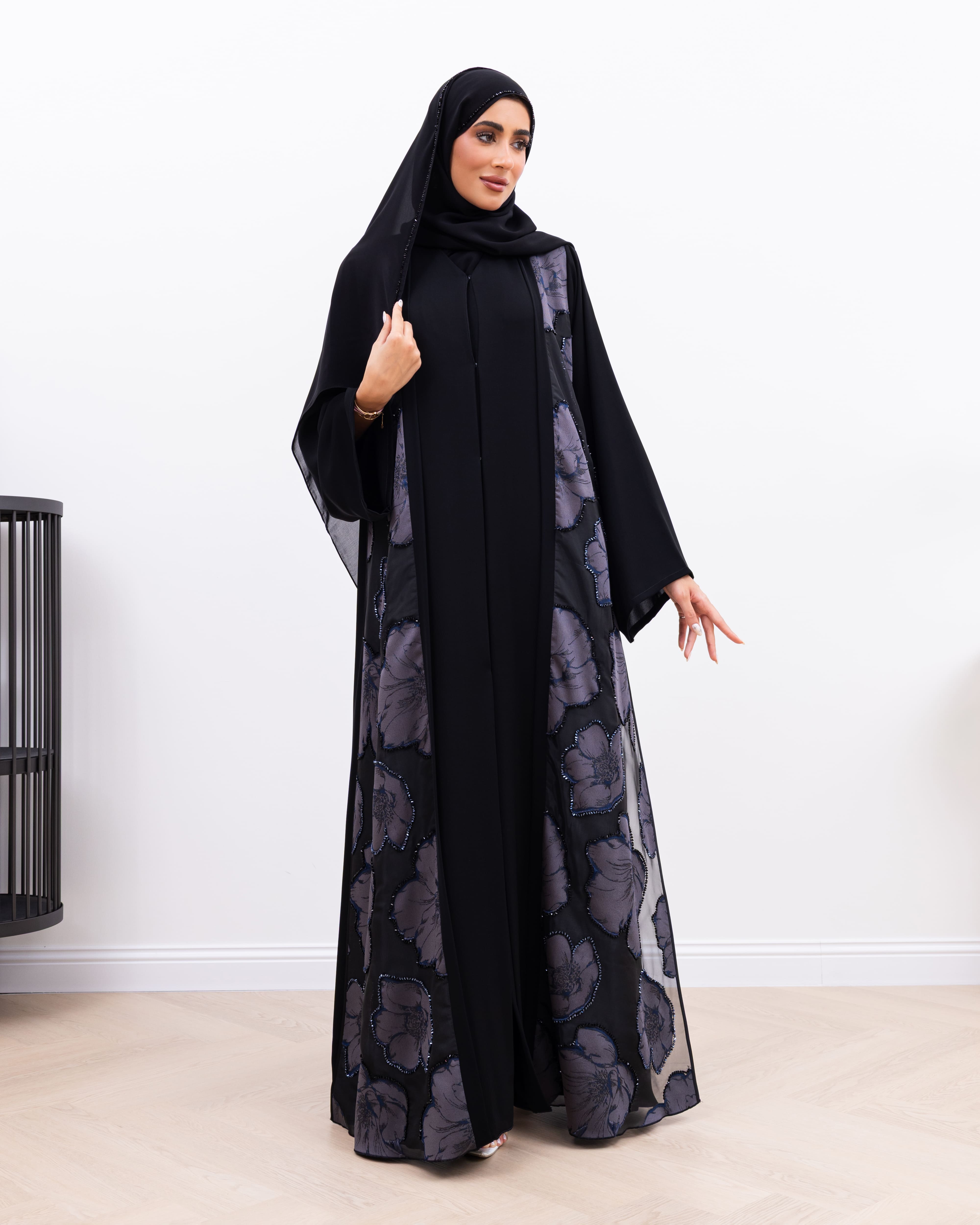 Timeless and graceful, the Mays Abaya is crafted from rich black Nada fabric for a smooth, flowing silhouette. Both sides of the front bodice are adorned with soft floral fabric panels, beautifully accented with delicate crystals that catch the light just enough. A perfect blend of femininity and elegance, this abaya adds subtle charm to classic black.