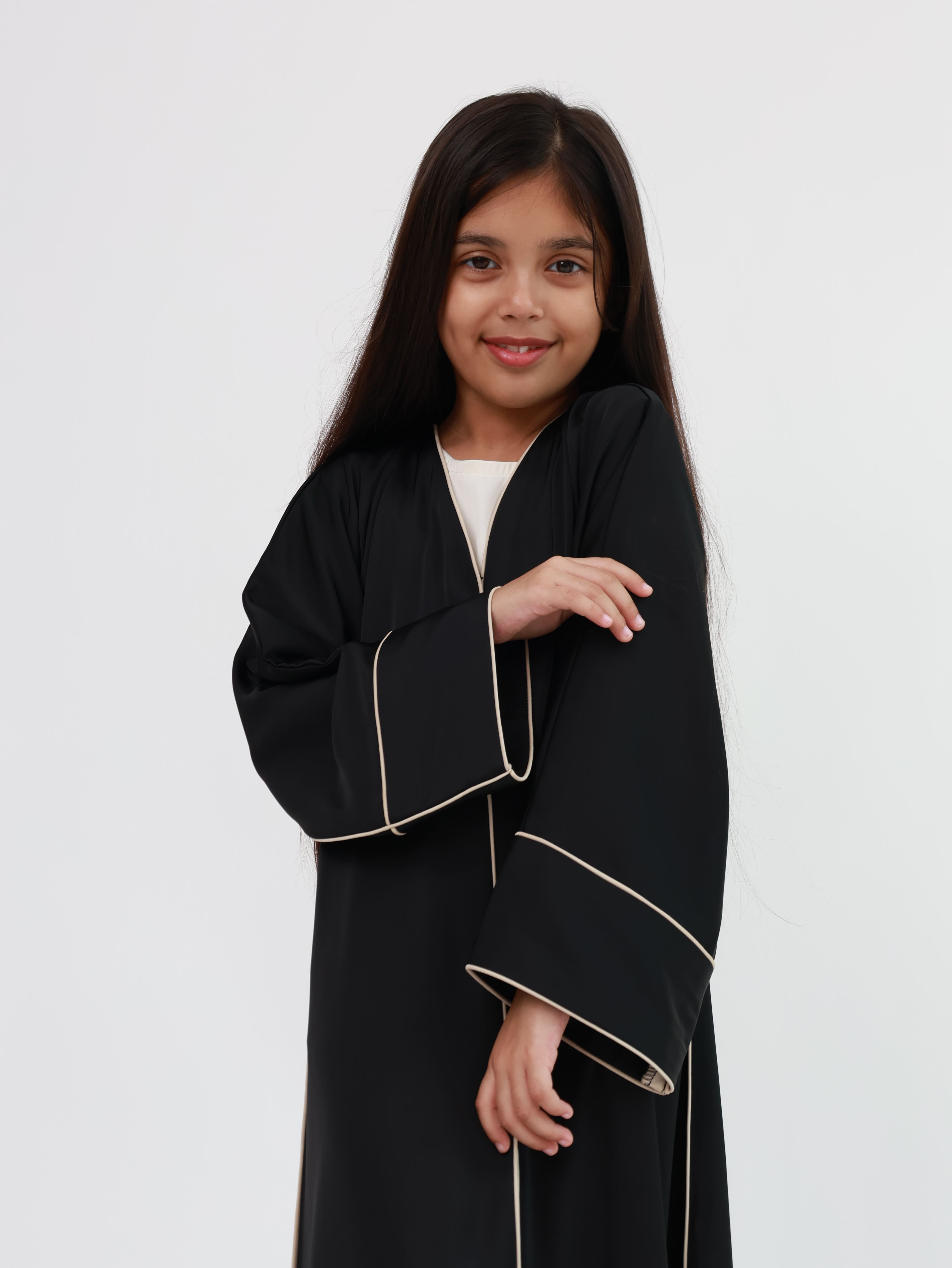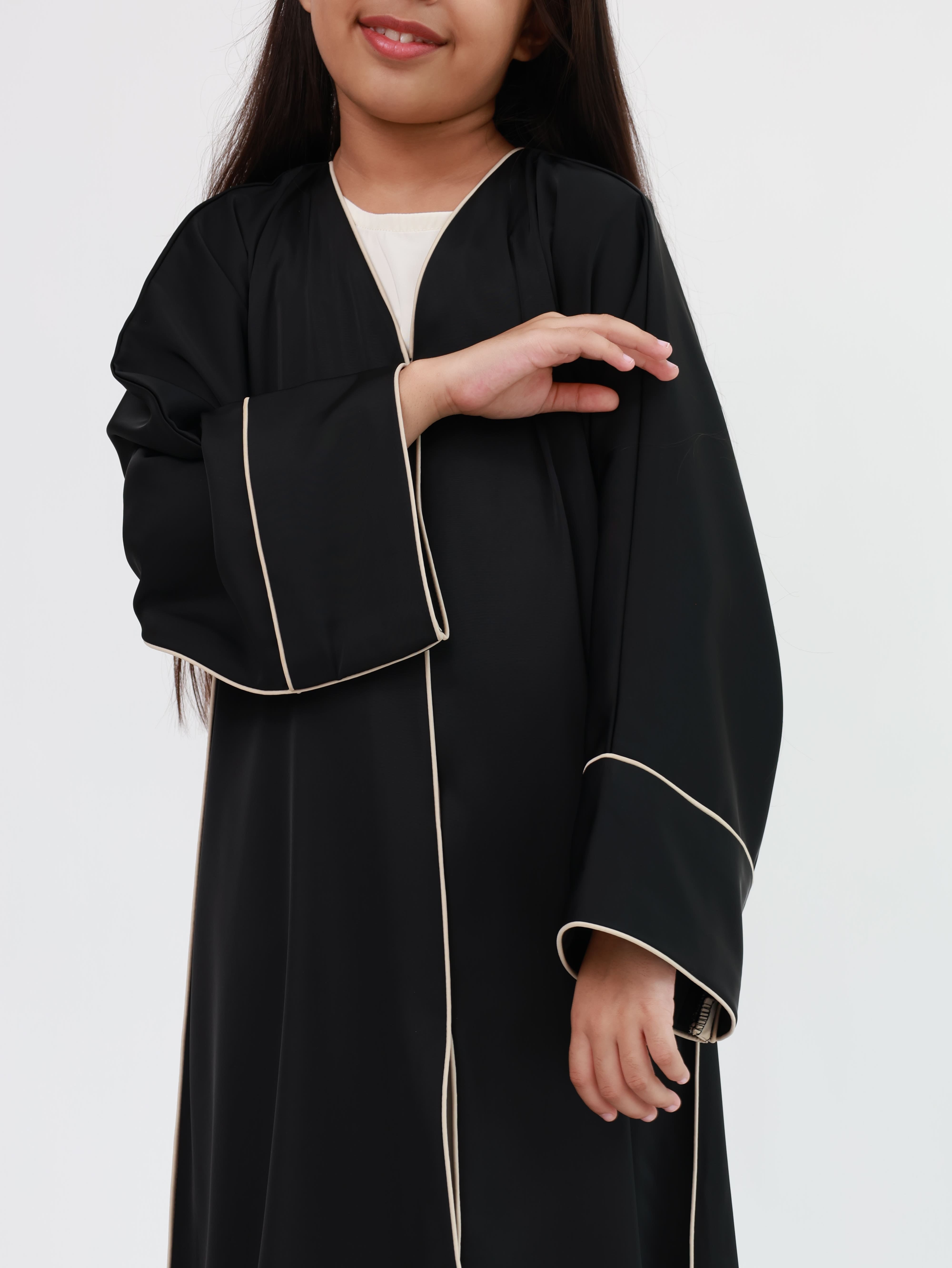 This black abaya is made from soft Farhathan fabric and designed with neat beige piping from the neck to the bottom and on the sleeves. It has a front-open style with a button closure, making it easy to wear and comfortable for daily use or special occasions.
