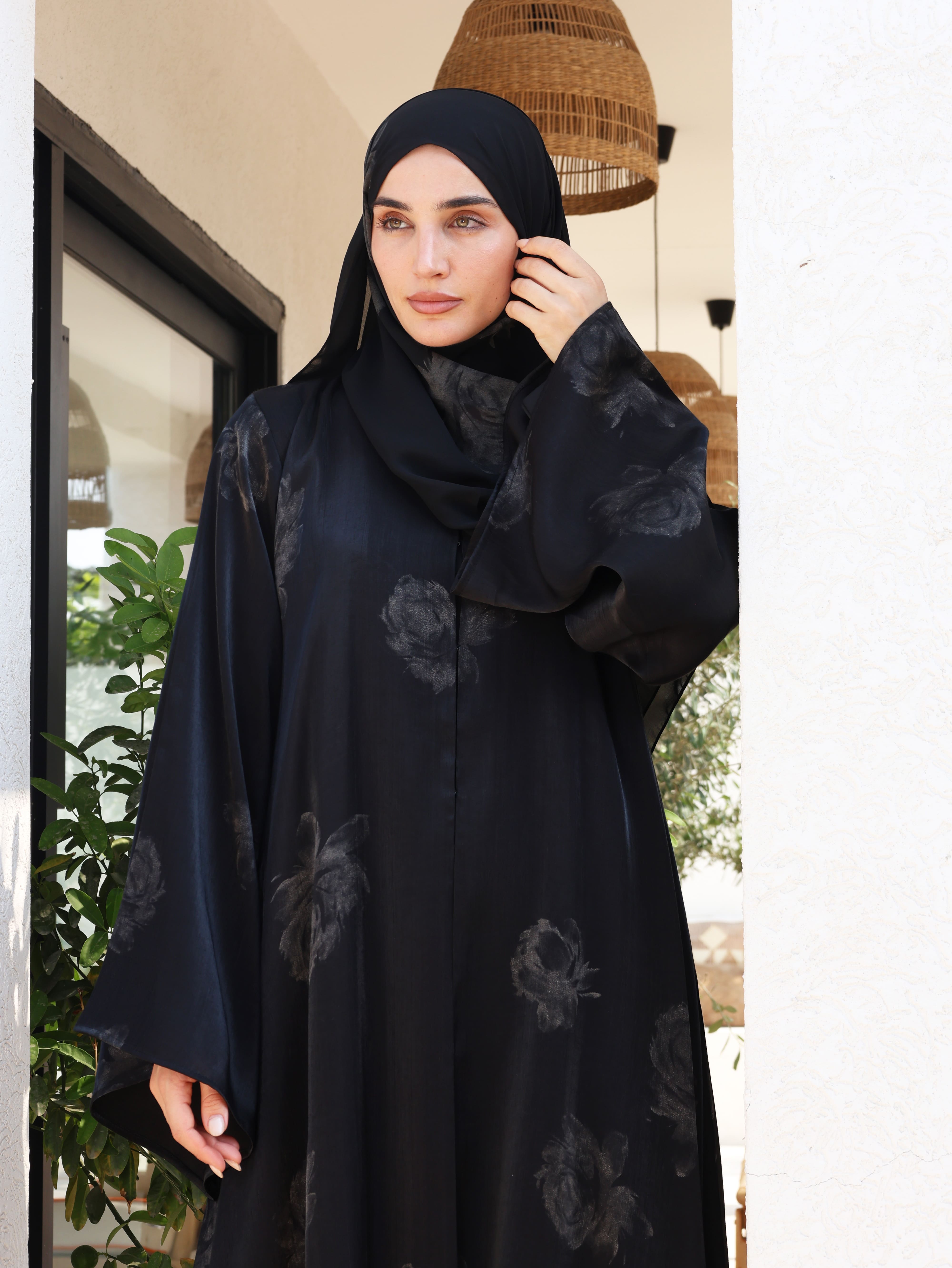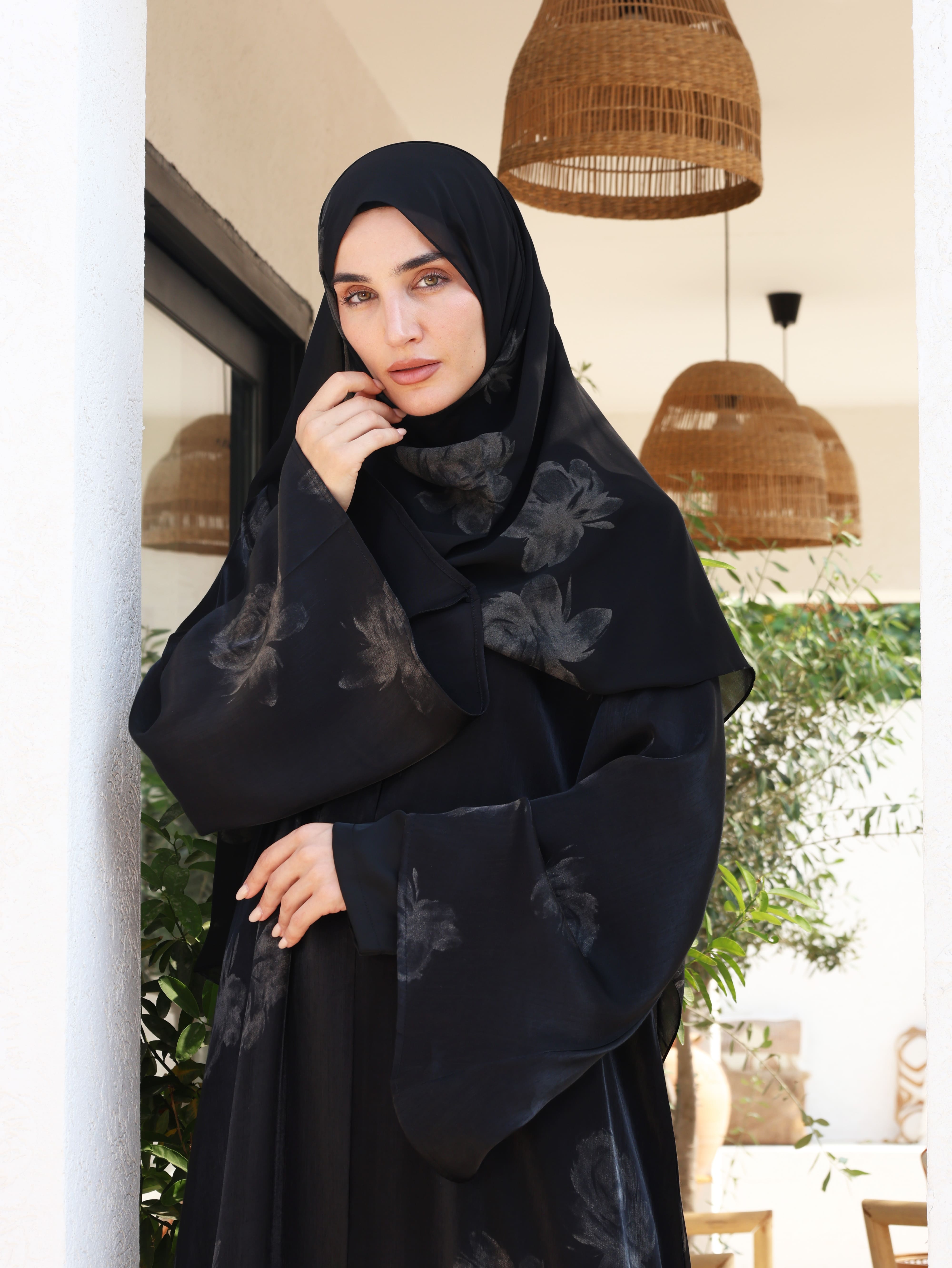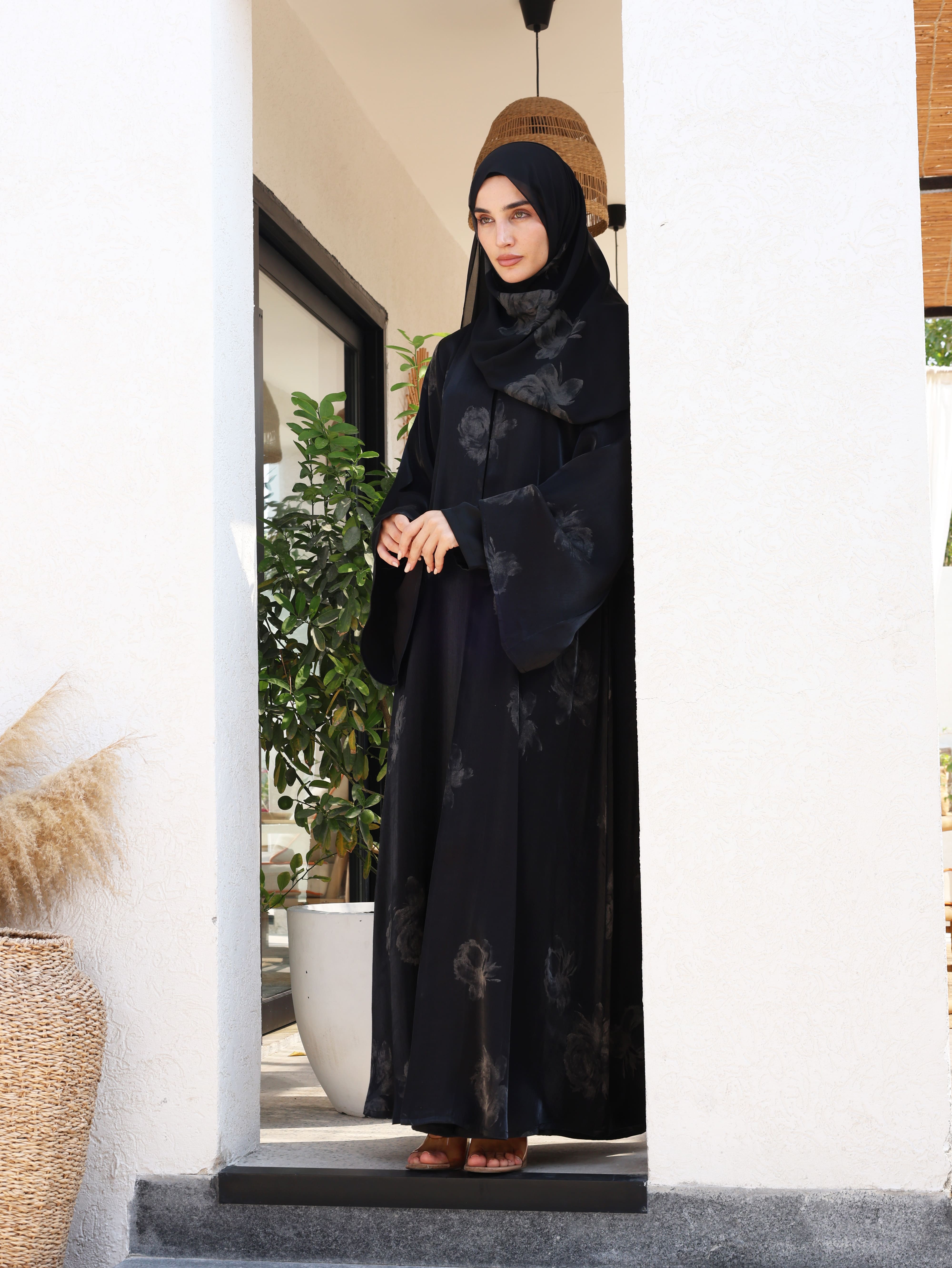 A black soft and shiny chiffon abaya adorned with delicate floral prints, featuring a front-open design with button closure for a graceful touch. Paired with a matching sheila, it combines elegance and sophistication with effortless charm.