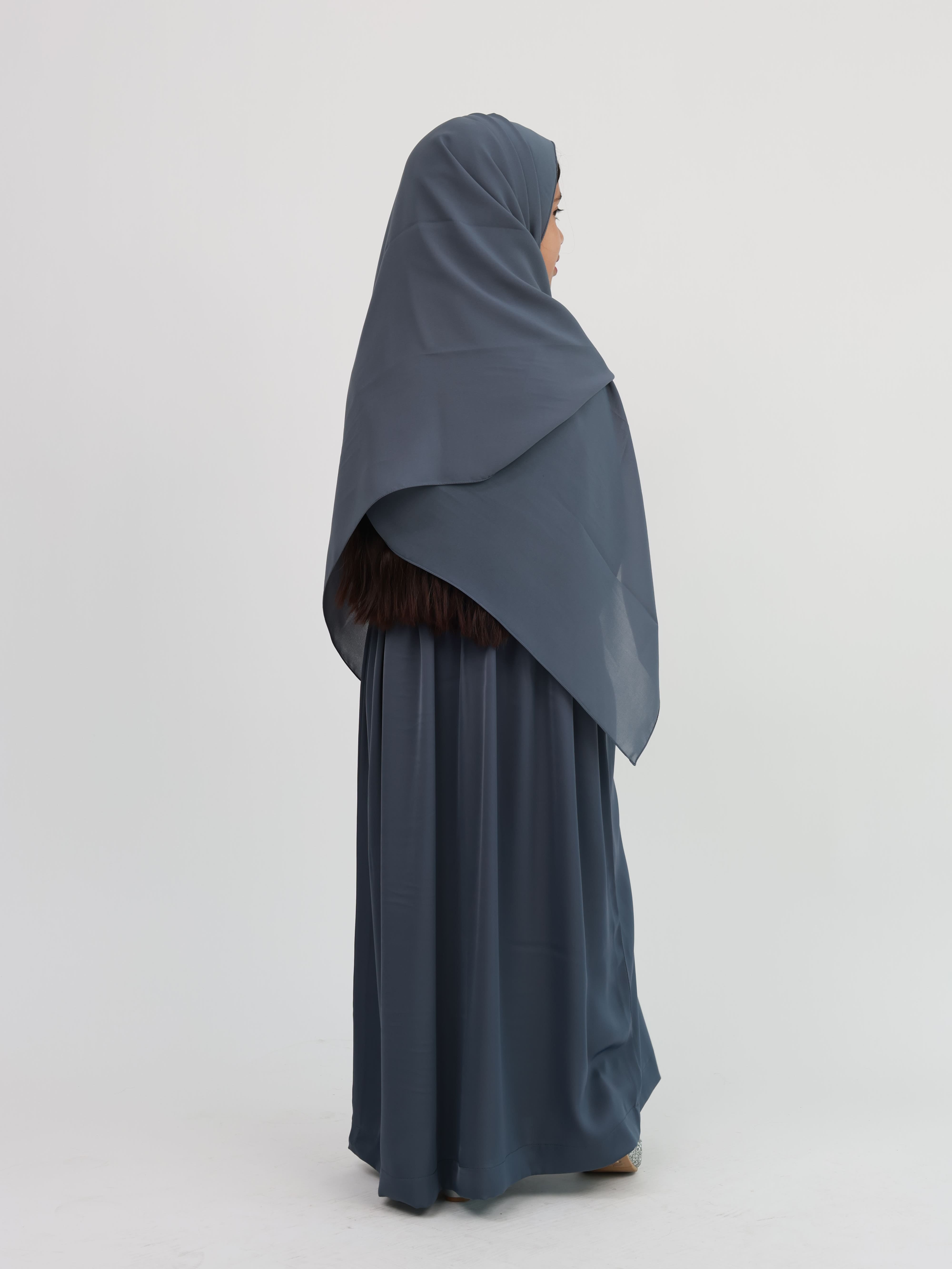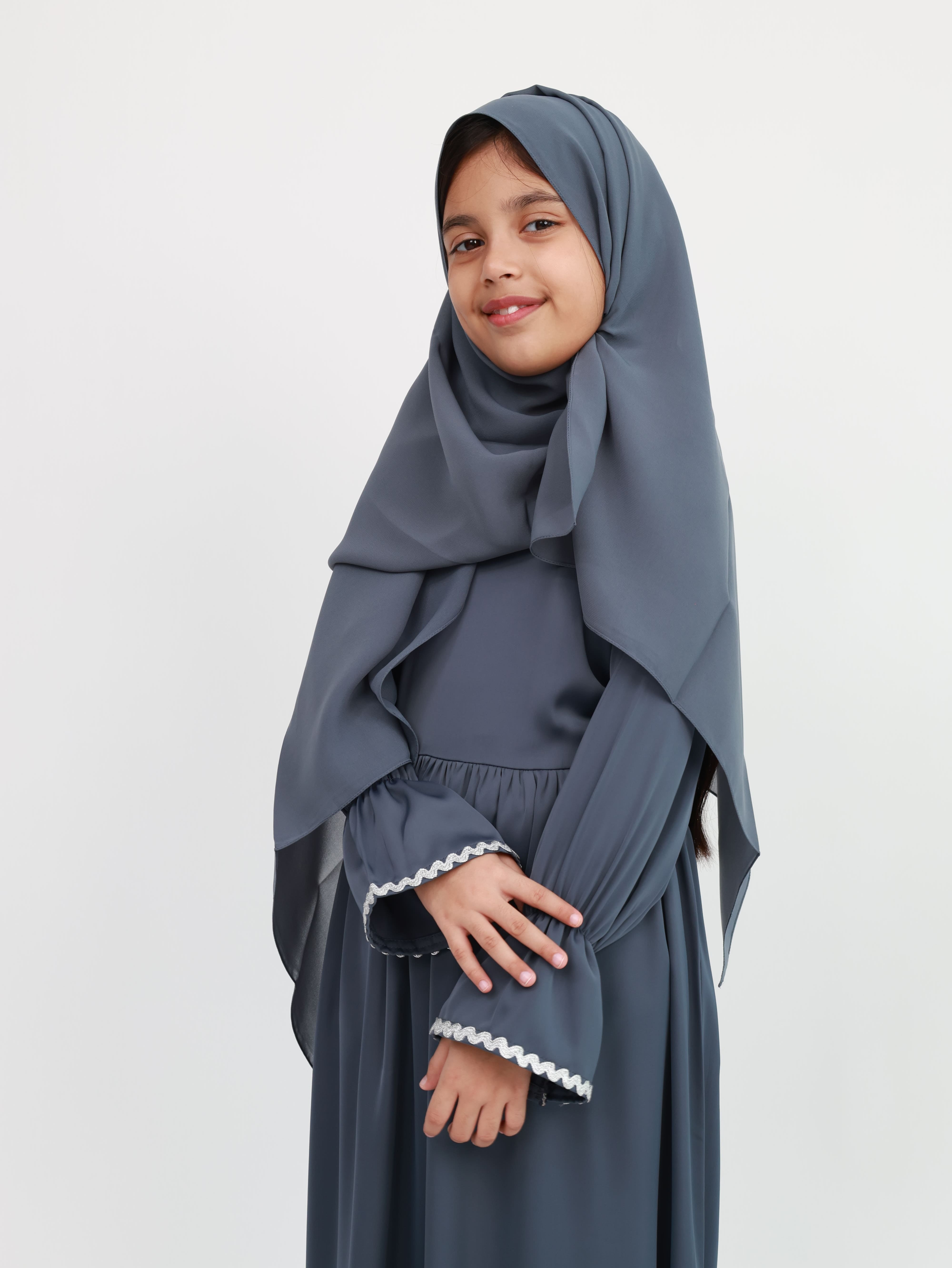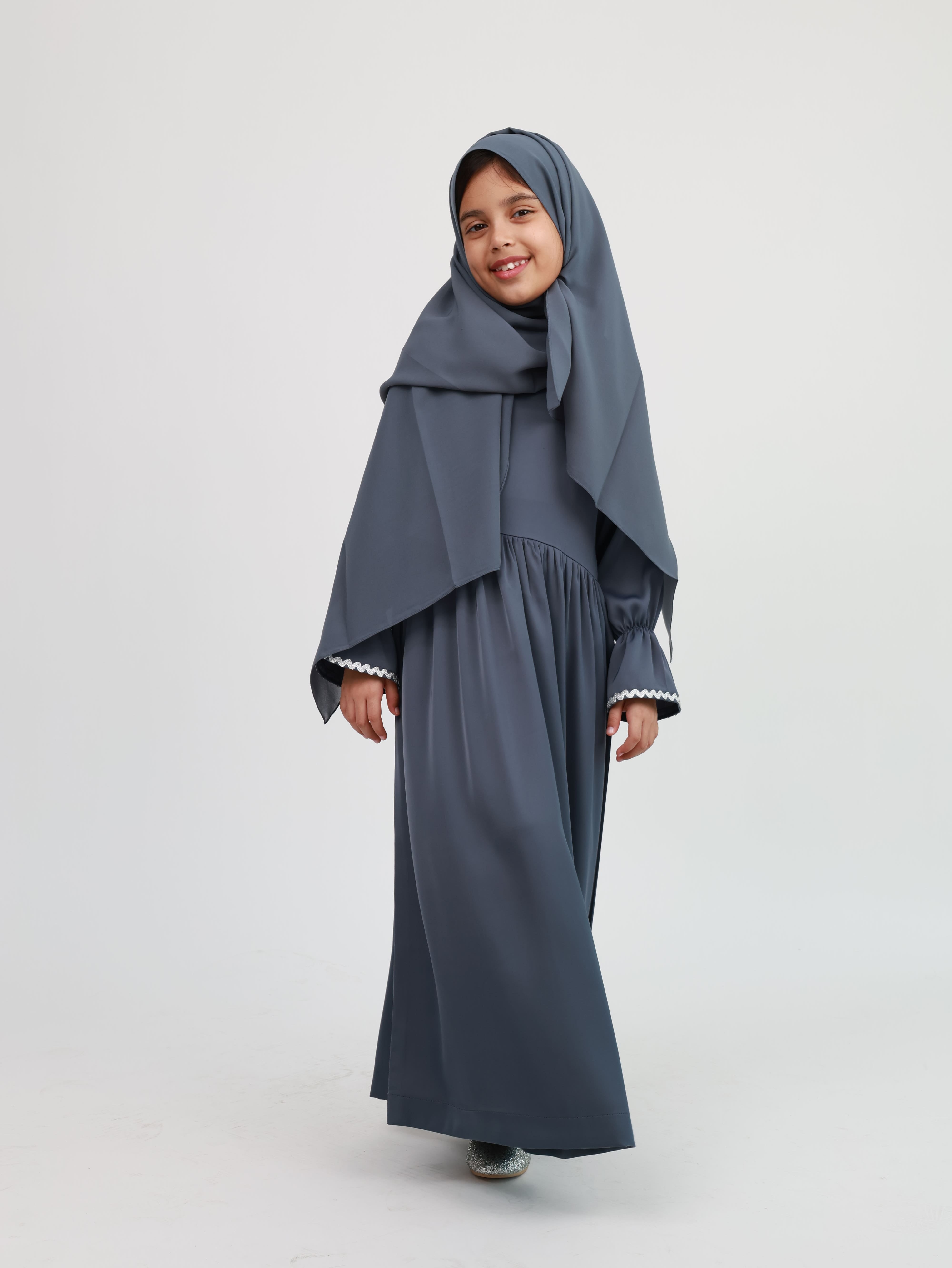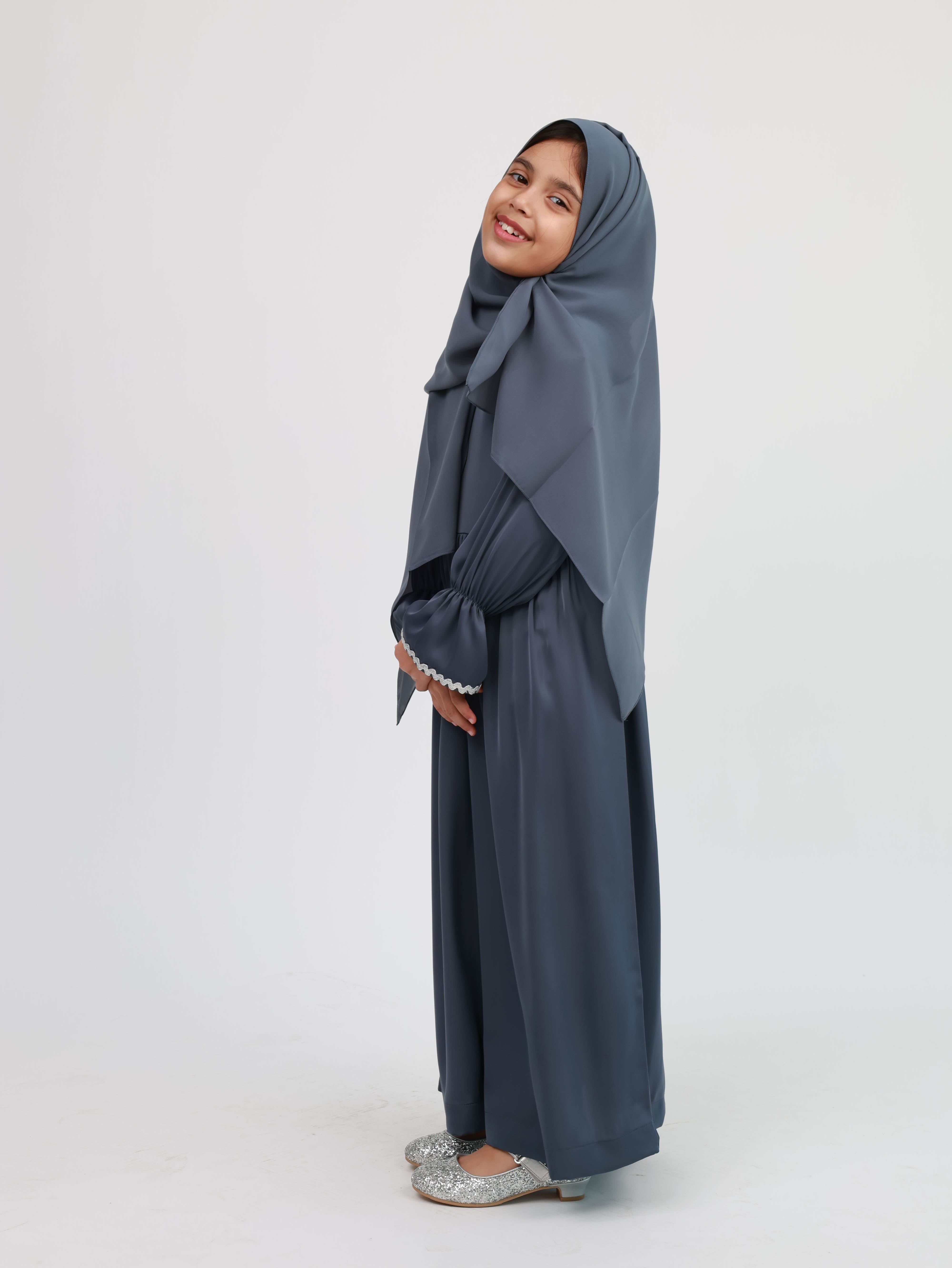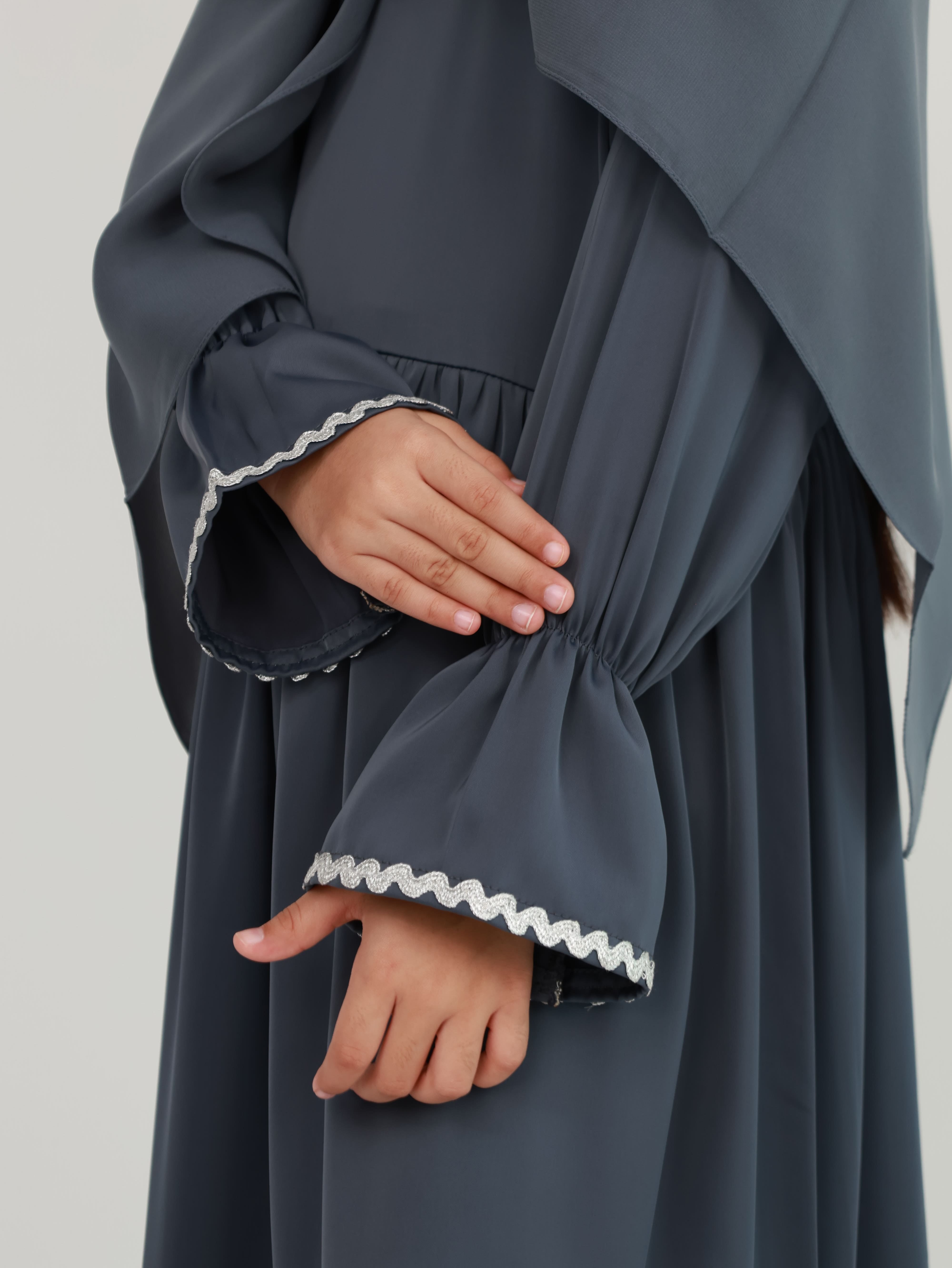 A modest and stylish abaya in soft grey Farhathan fabric, designed with pleats on the waist and sleeves for a neat, flowy look. Finished with wavy white lace on both sleeves, adding a soft and elegant touch — perfect for everyday or special outings.