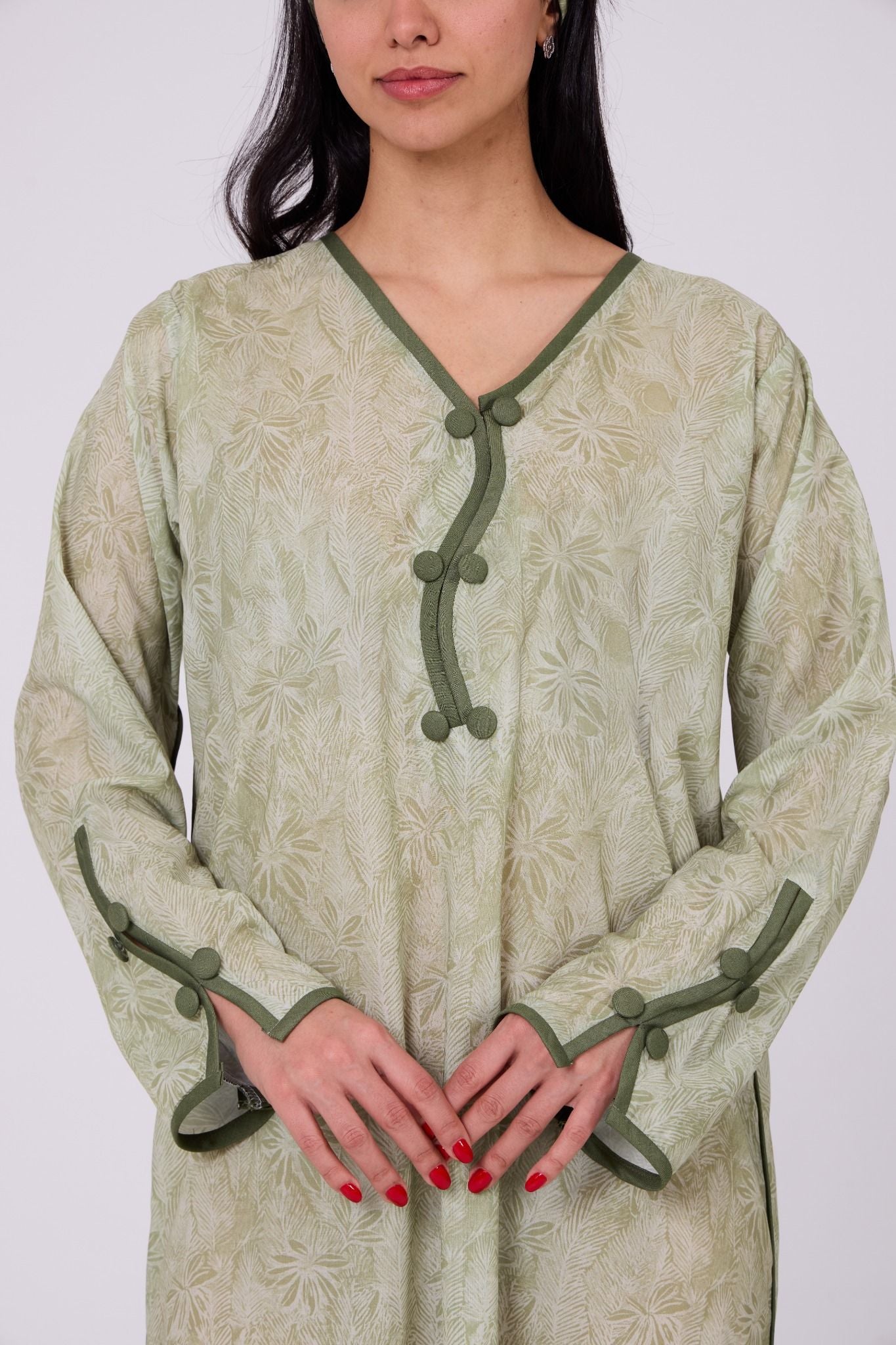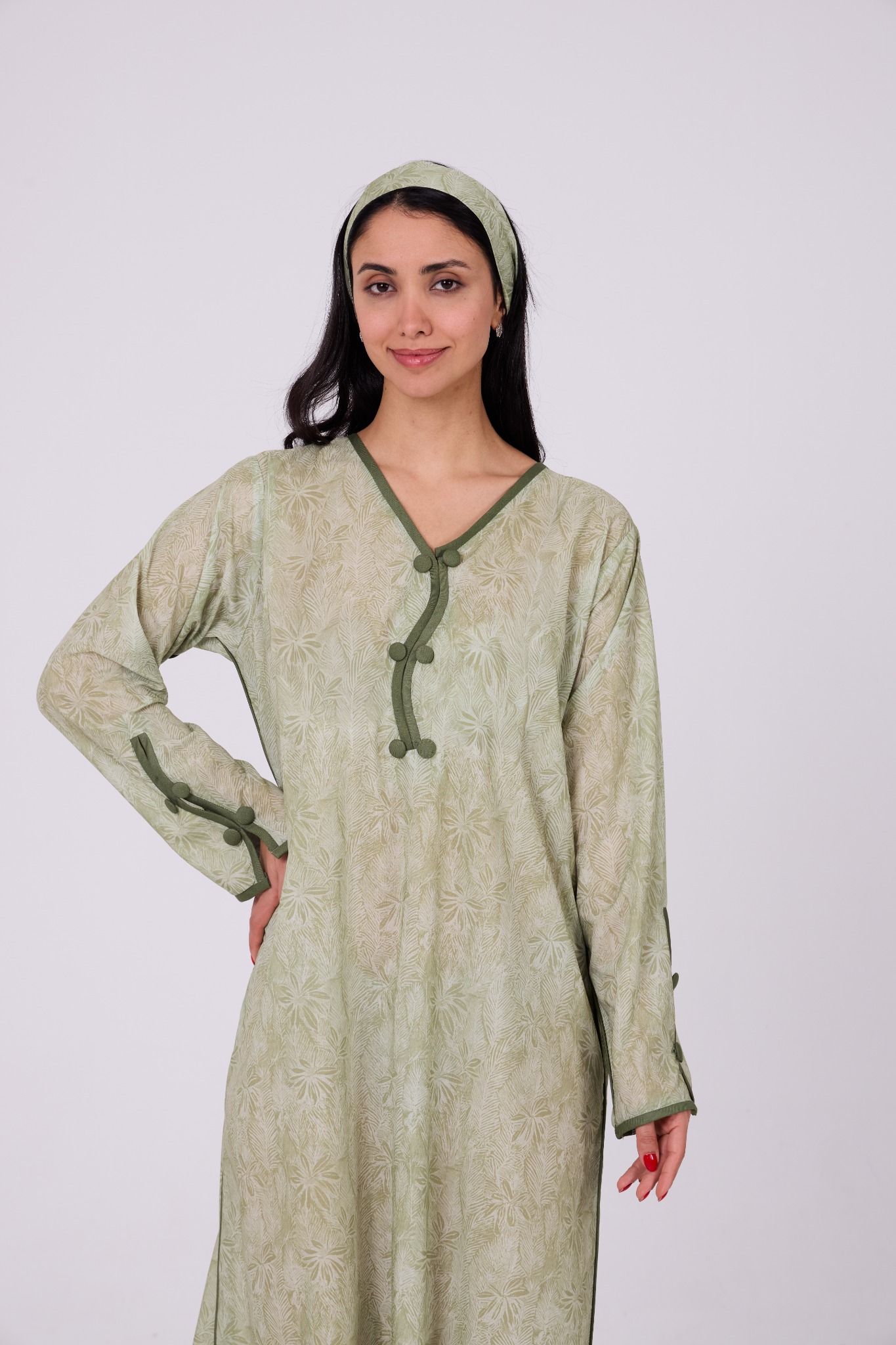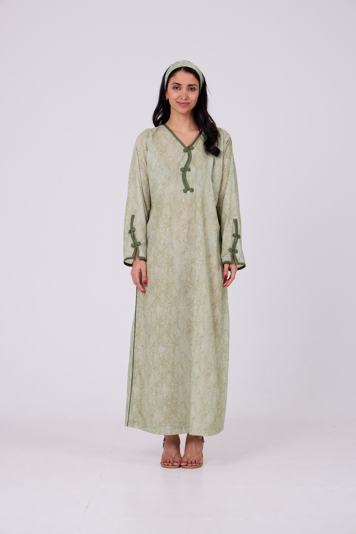 A soft olive-toned jalabiya crafted in lightweight printed fabric, featuring delicate fern-inspired motifs that create a calm and elegant aesthetic. Designed with a flattering V-neckline, enhanced by contrast olive piping and fabric-covered button detailing for a refined finish. The wide sleeves are accented with slit openings and matching fabric buttons, adding subtle structure while maintaining comfort and ease. Comes with a matching headband to complete the look.