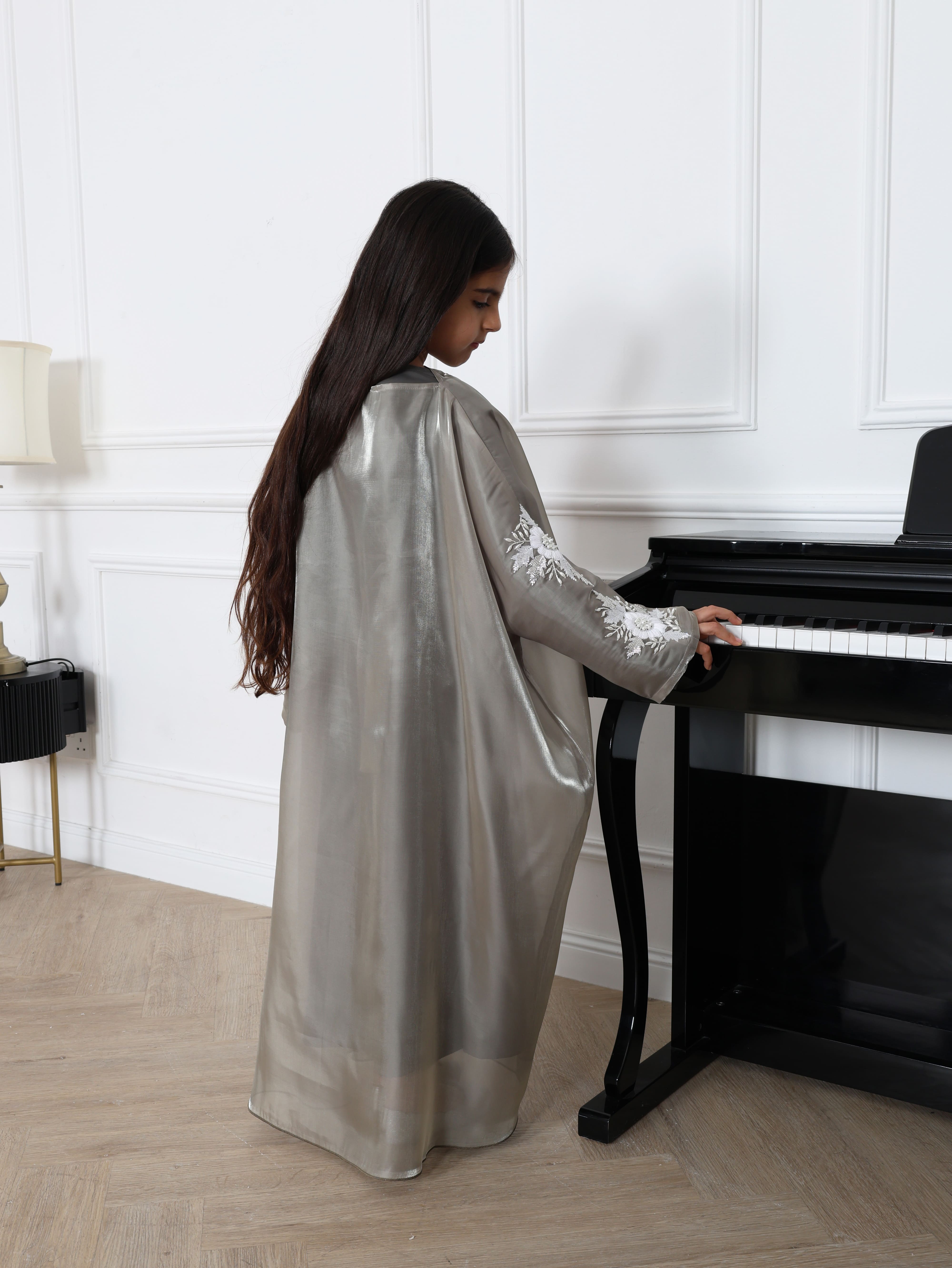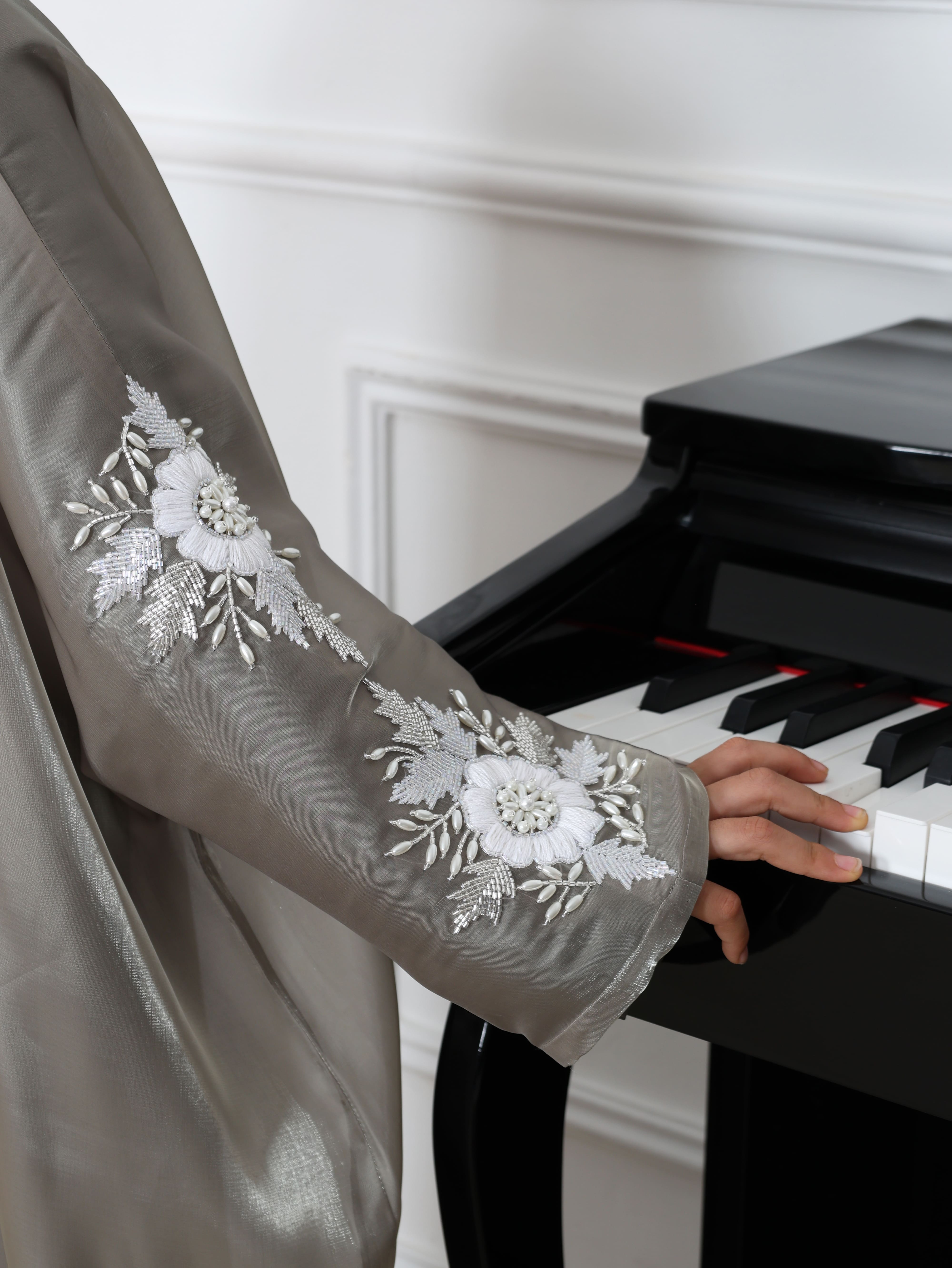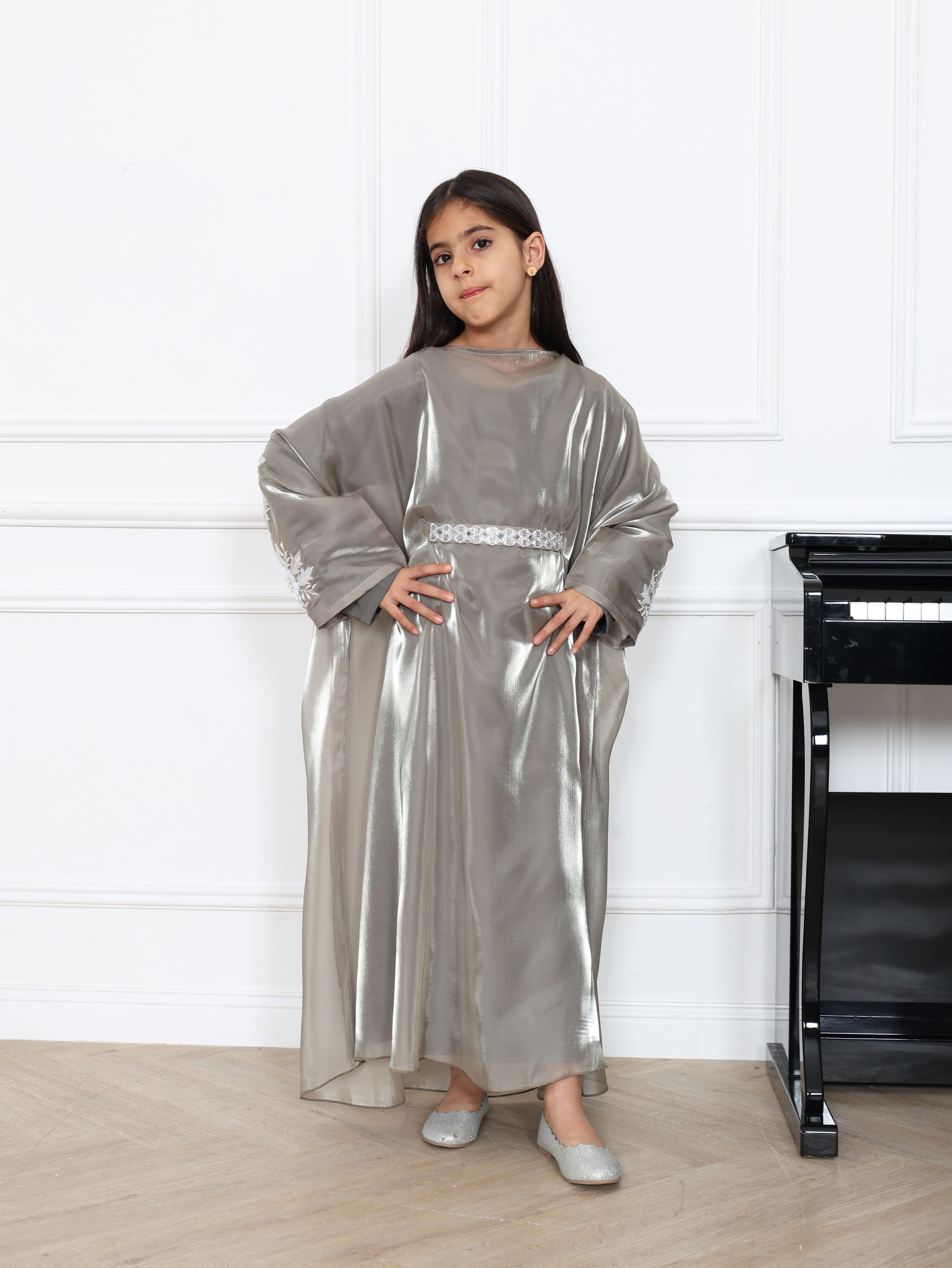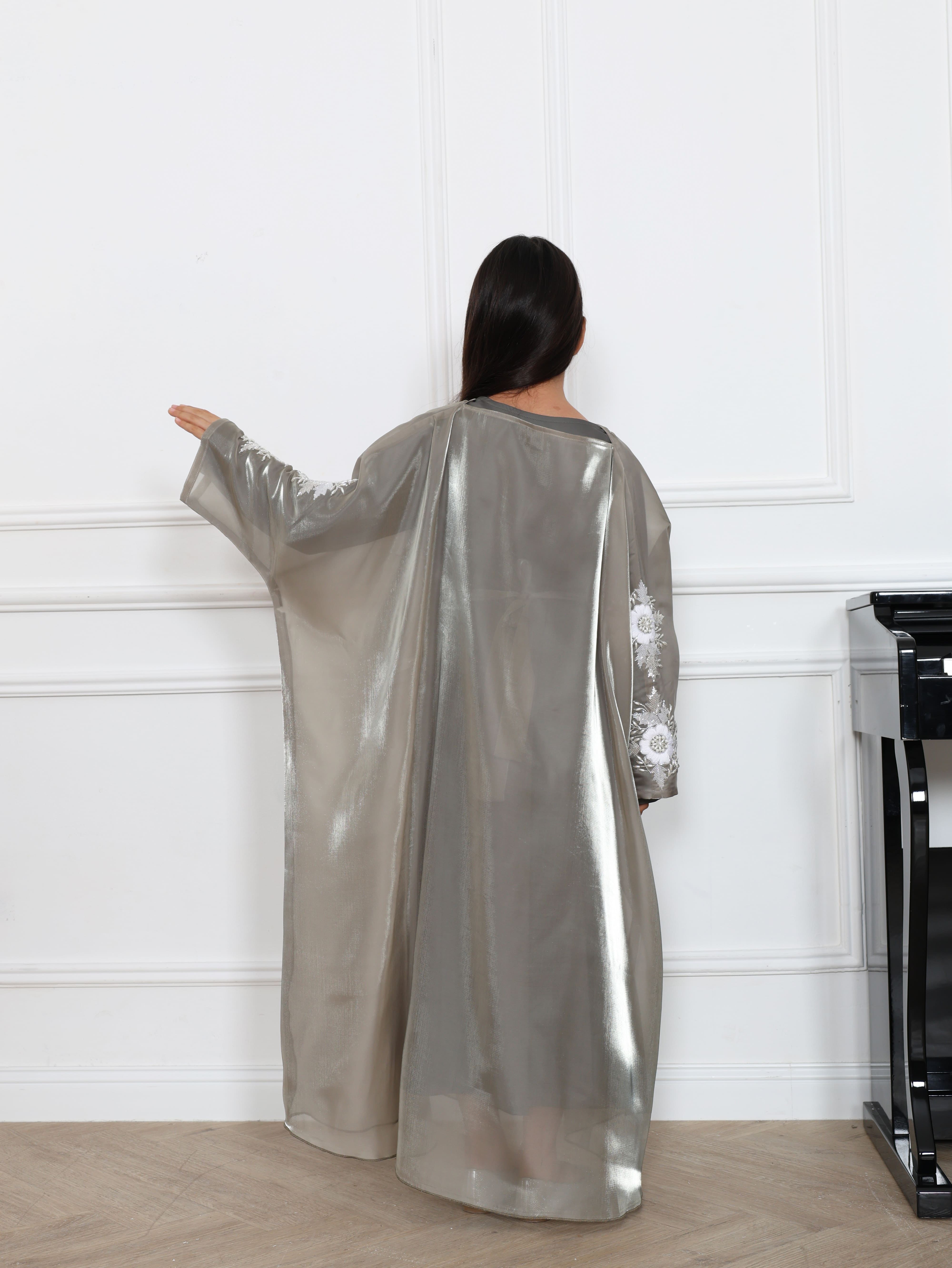 An elegant olive green organza abaya in a flowing farasha style, featuring a non-adjustable waist belt adorned with delicate stones for a refined sparkle. The sleeves are beautifully detailed with handworked floral motifs, adding an artisanal touch. Paired with a matching inner dress and an organza sheila, it exudes timeless sophistication and graceful charm.