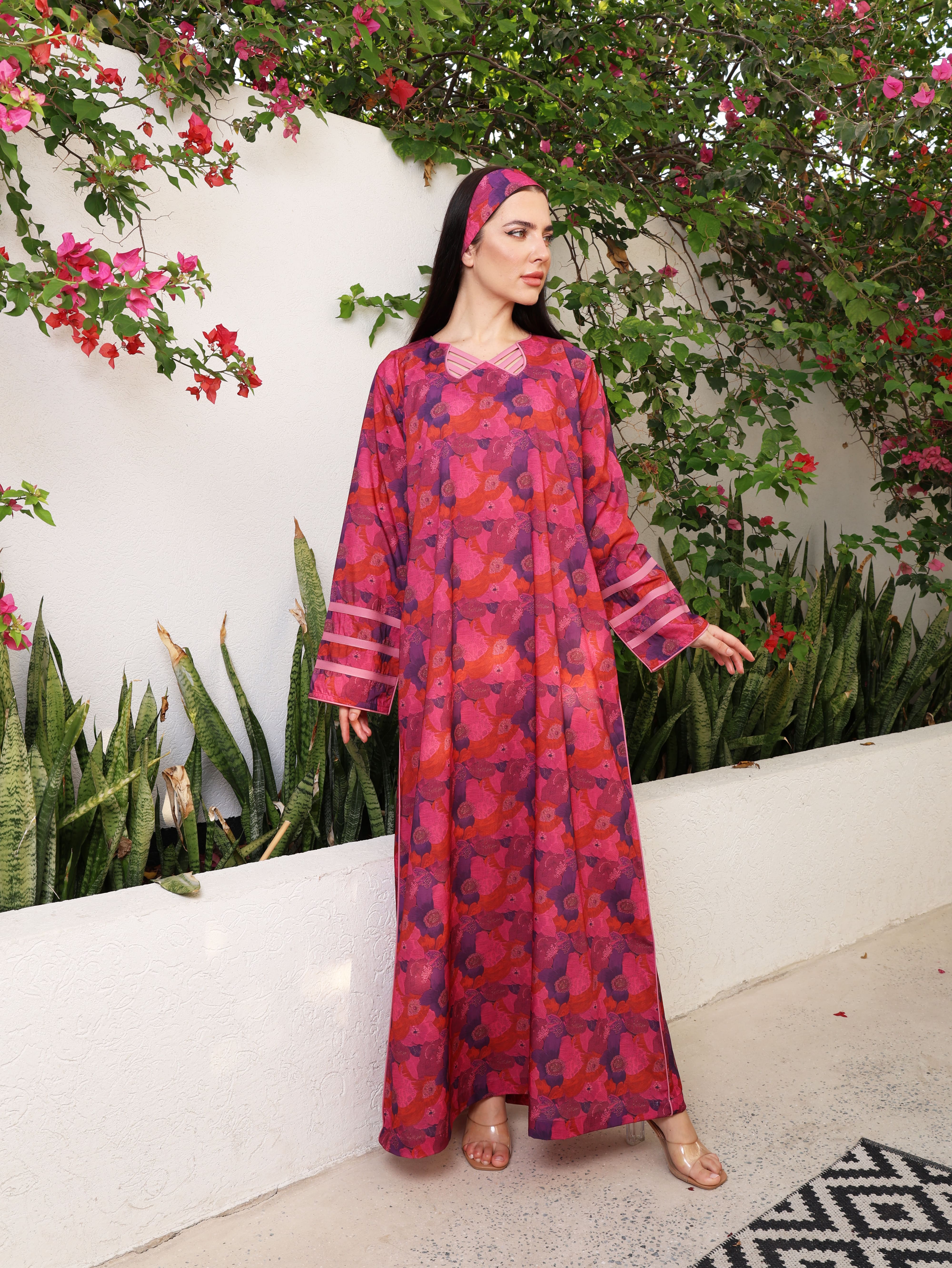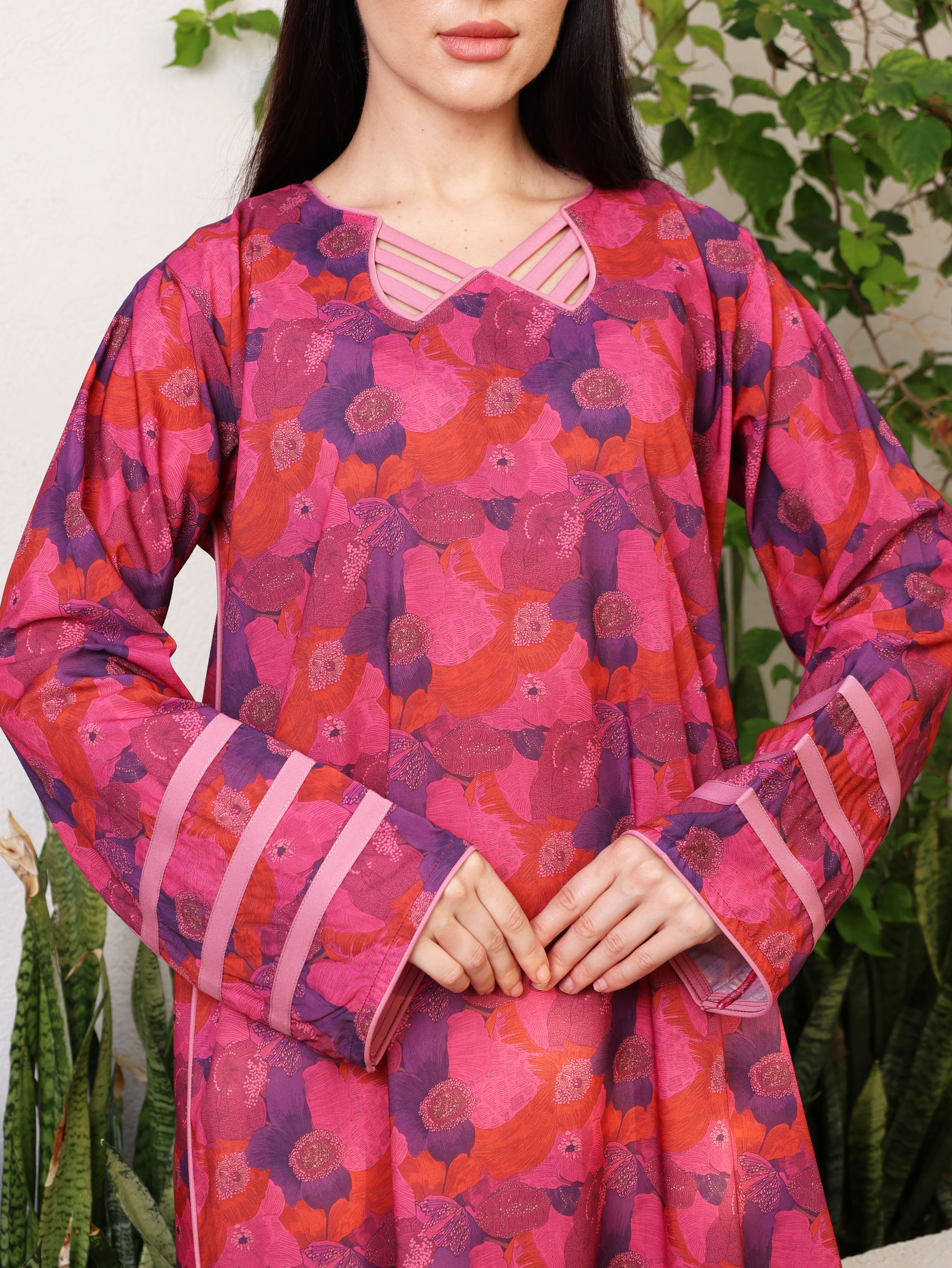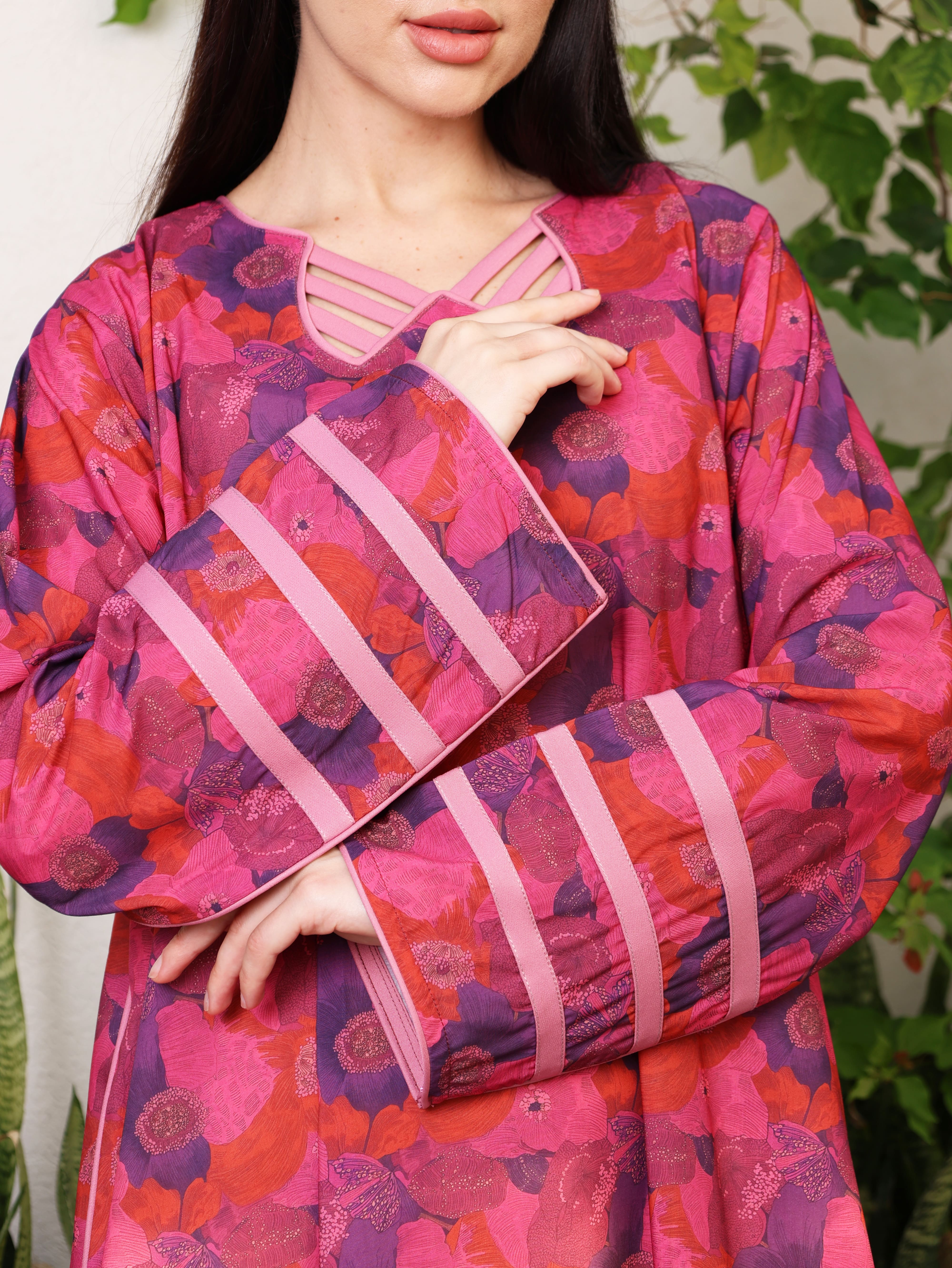 A soft pink jalabiya adorned with charming floral prints radiates delicate femininity. The neckline and sleeves feature refined piping and intricate strap detailing, adding a subtle yet elegant touch to its graceful design.