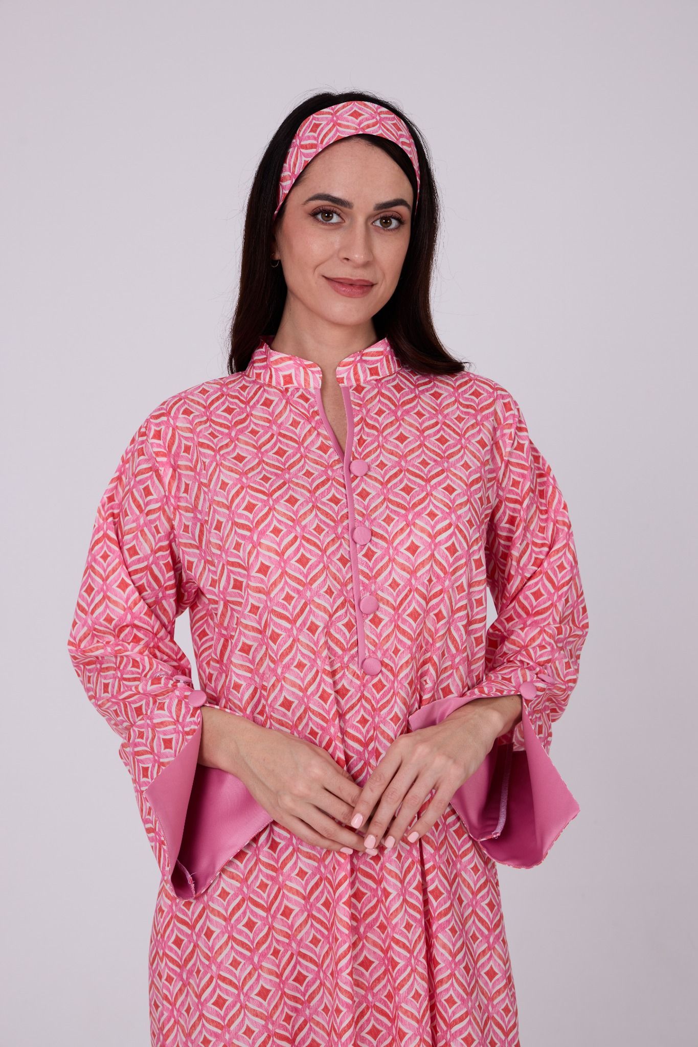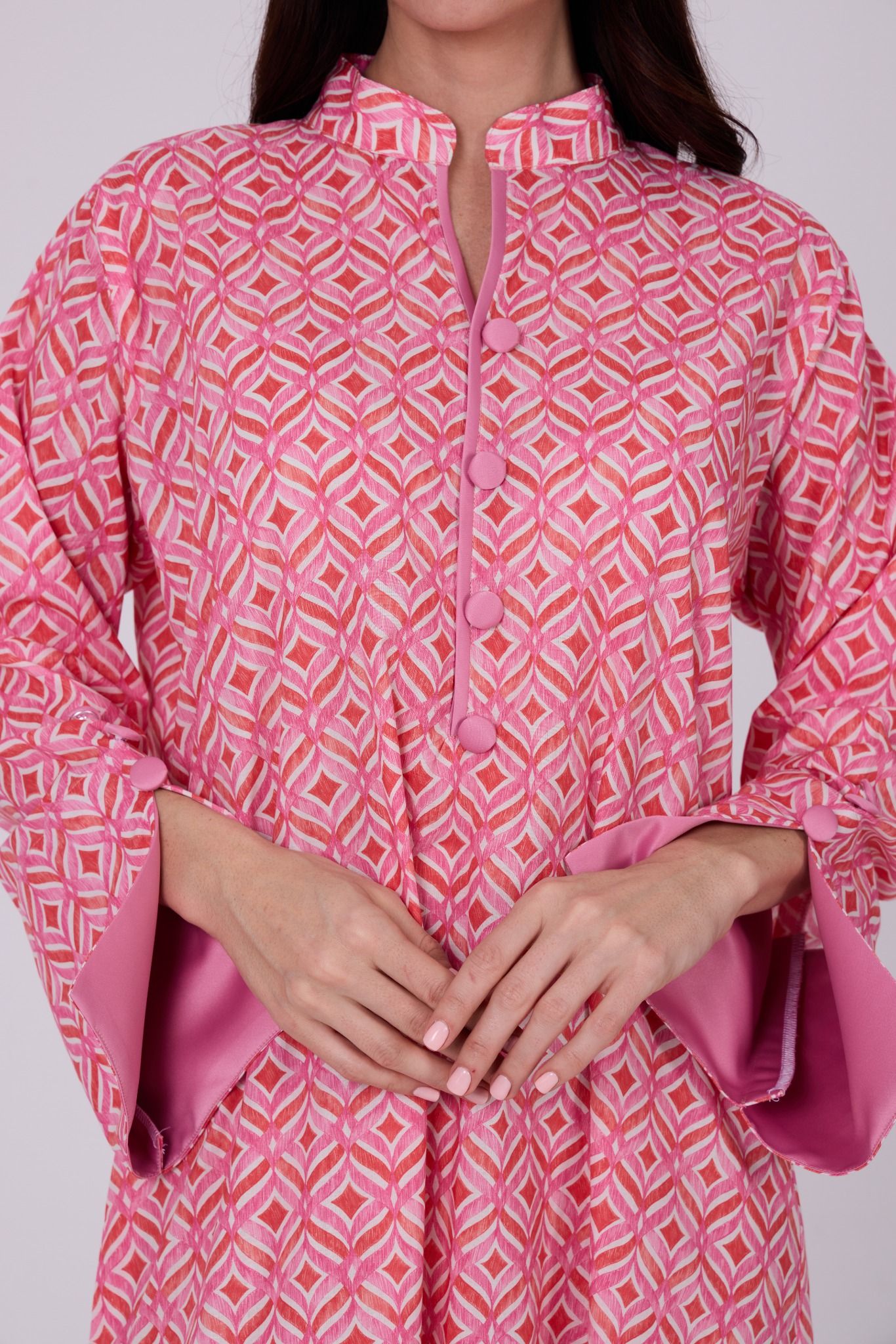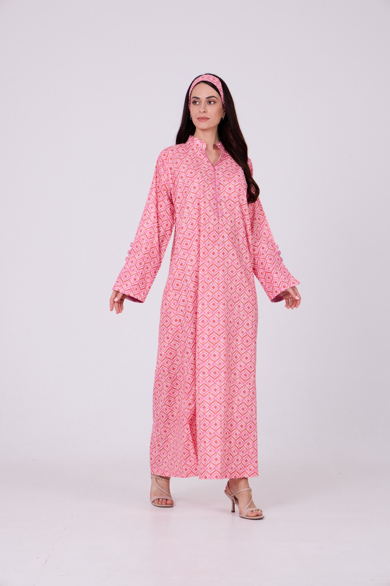 A vibrant pink jalabiya crafted in lightweight printed fabric, featuring an elegant geometric lattice pattern for a bold yet refined look. Designed with a structured collar neckline and a button-down front adorned with fabric-covered buttons, adding a polished finish. The wide sleeves are detailed with slit openings and matching fabric buttons, complemented by contrast pink lining for a graceful and contemporary touch. Comes with a matching headband to complete the look.