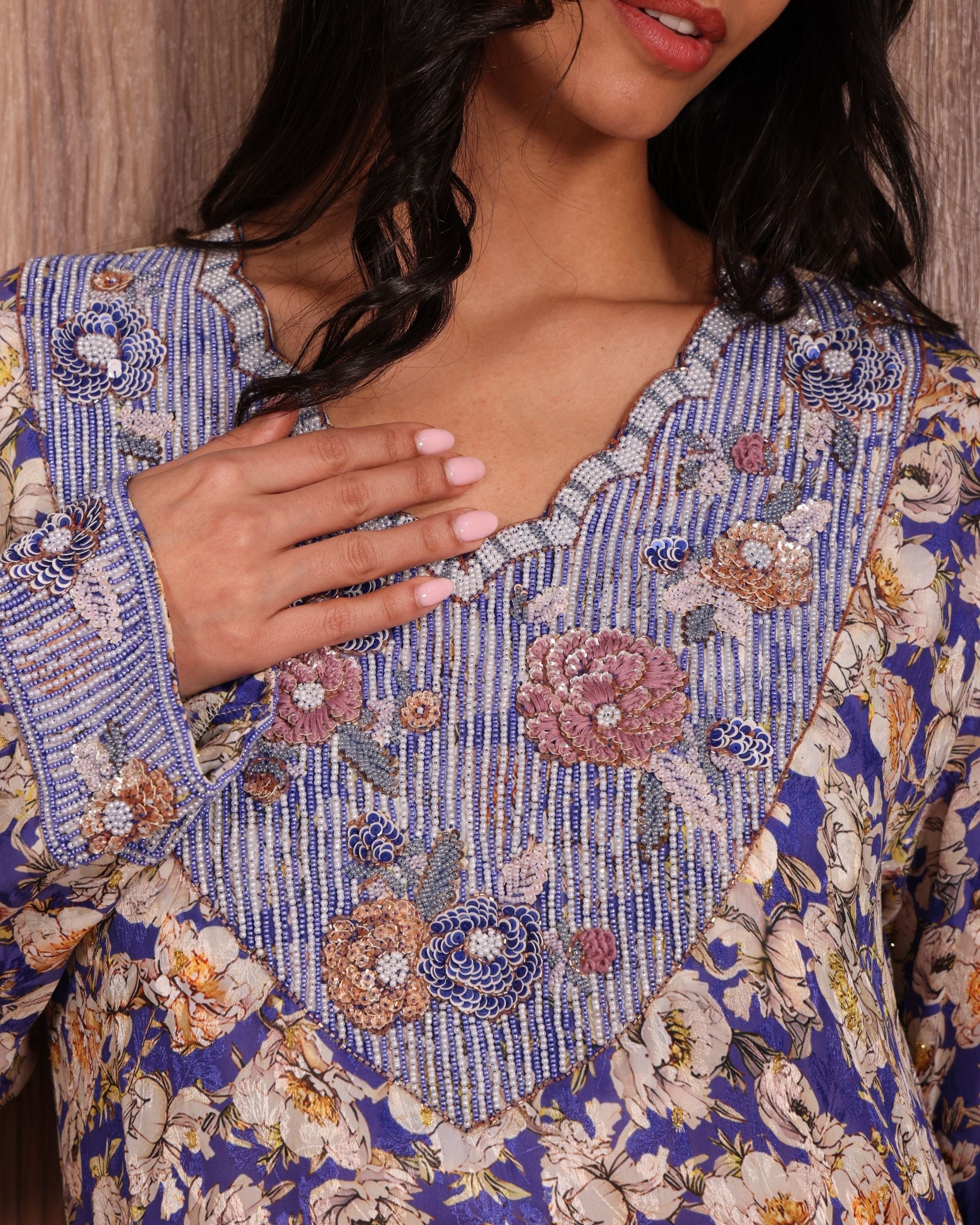 A royal blue jacquard mukhwara adorned with delicate ivory floral motifs, beautifully contrasted by intricate bead and sequin embroidery in soft blush, champagne, and sapphire tones. The neckline and sleeves feature refined hand embellishments, creating a rich, textured elegance that enhances its graceful charm.