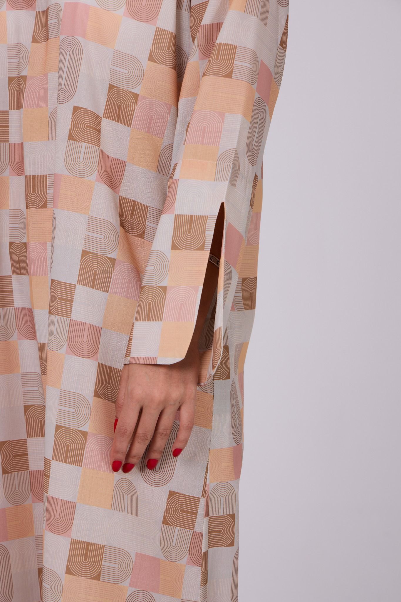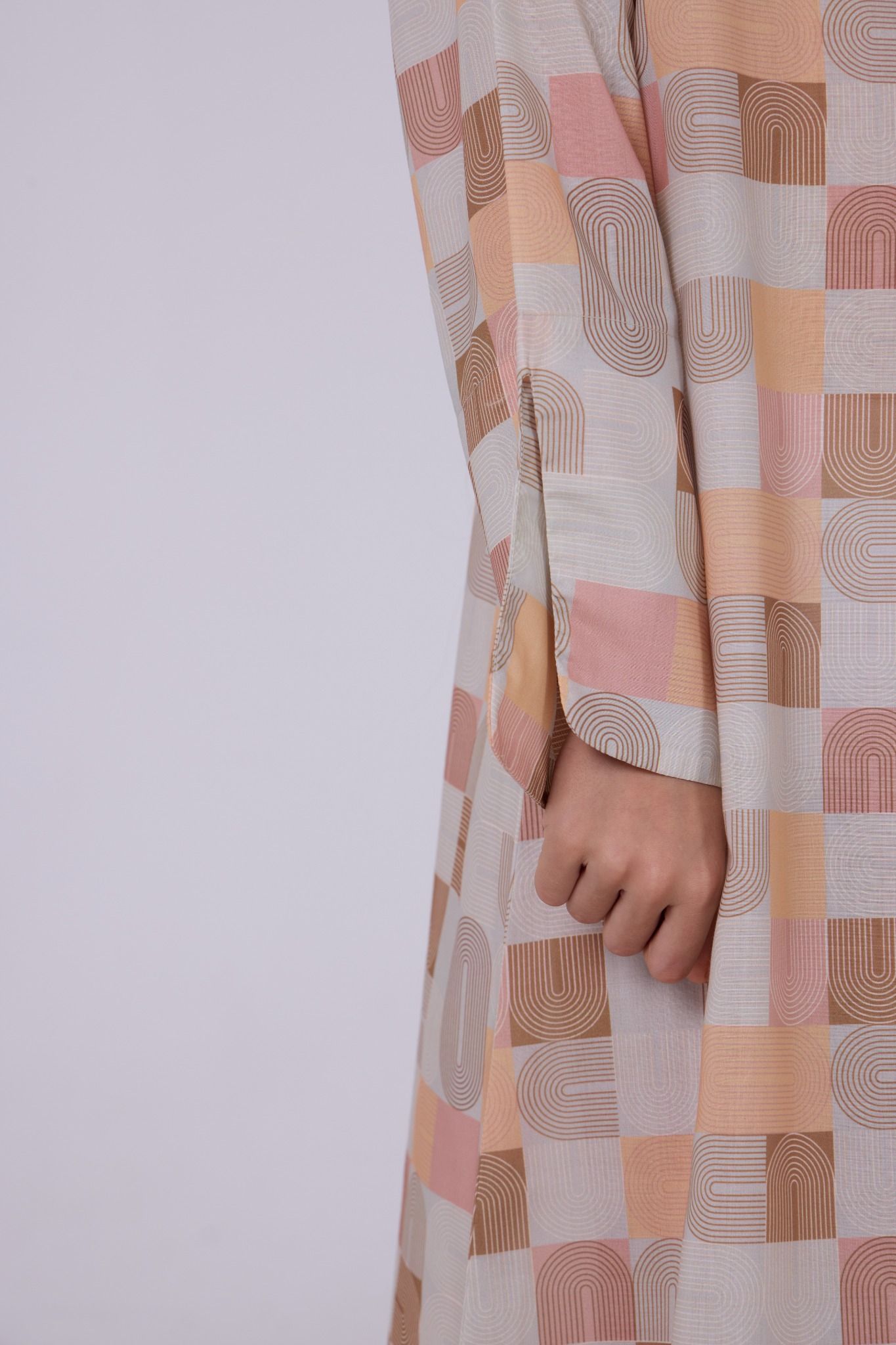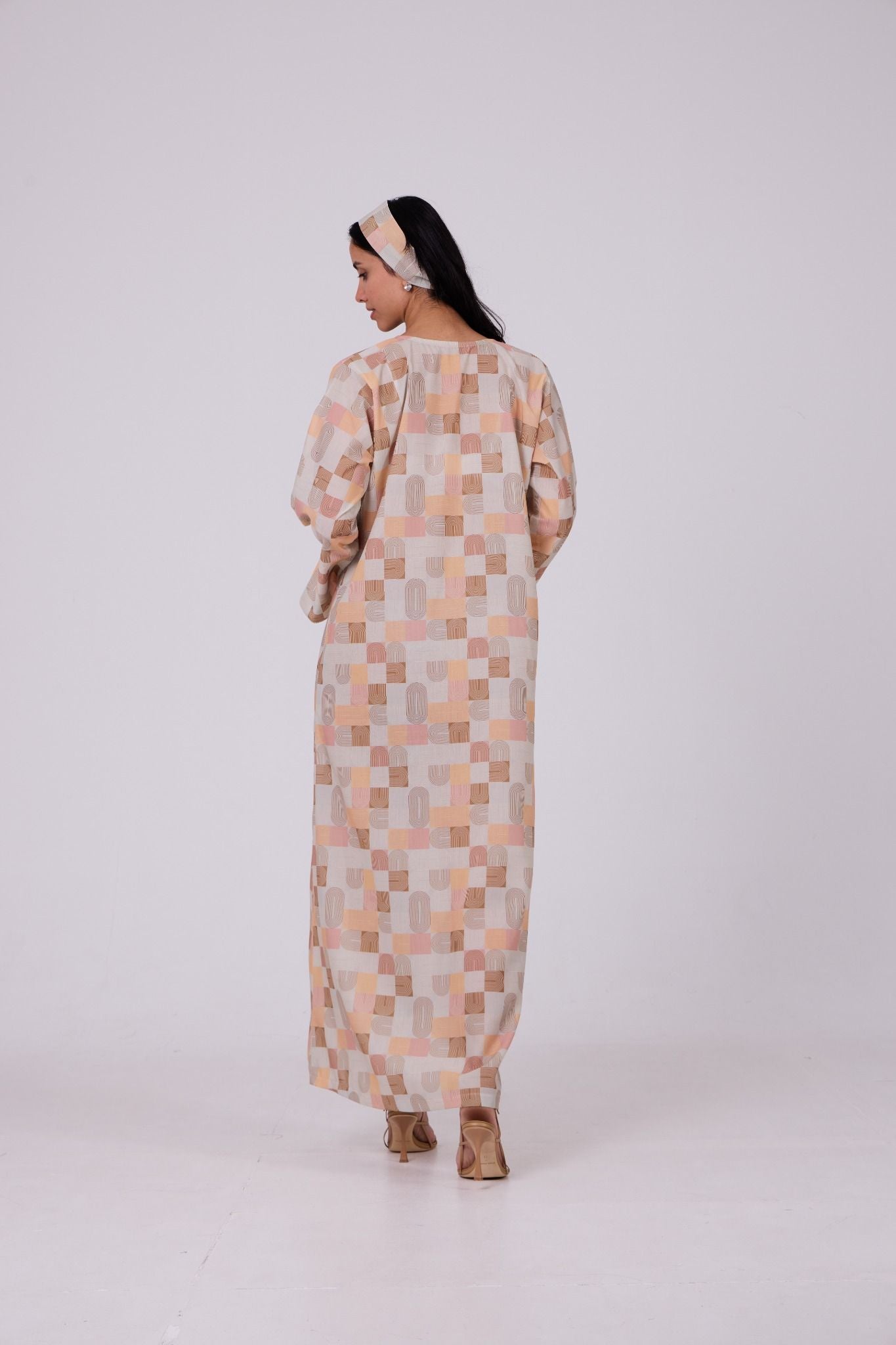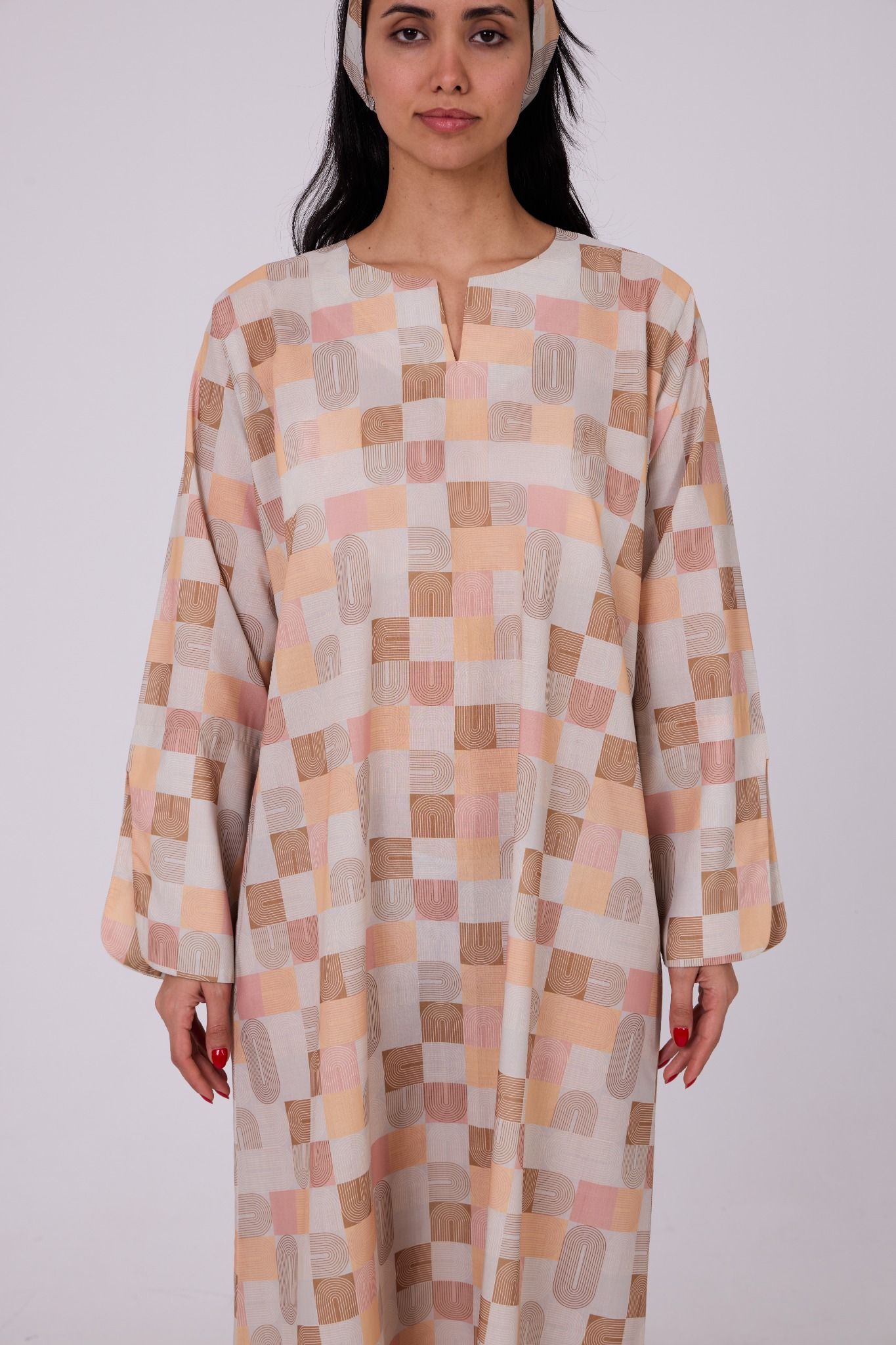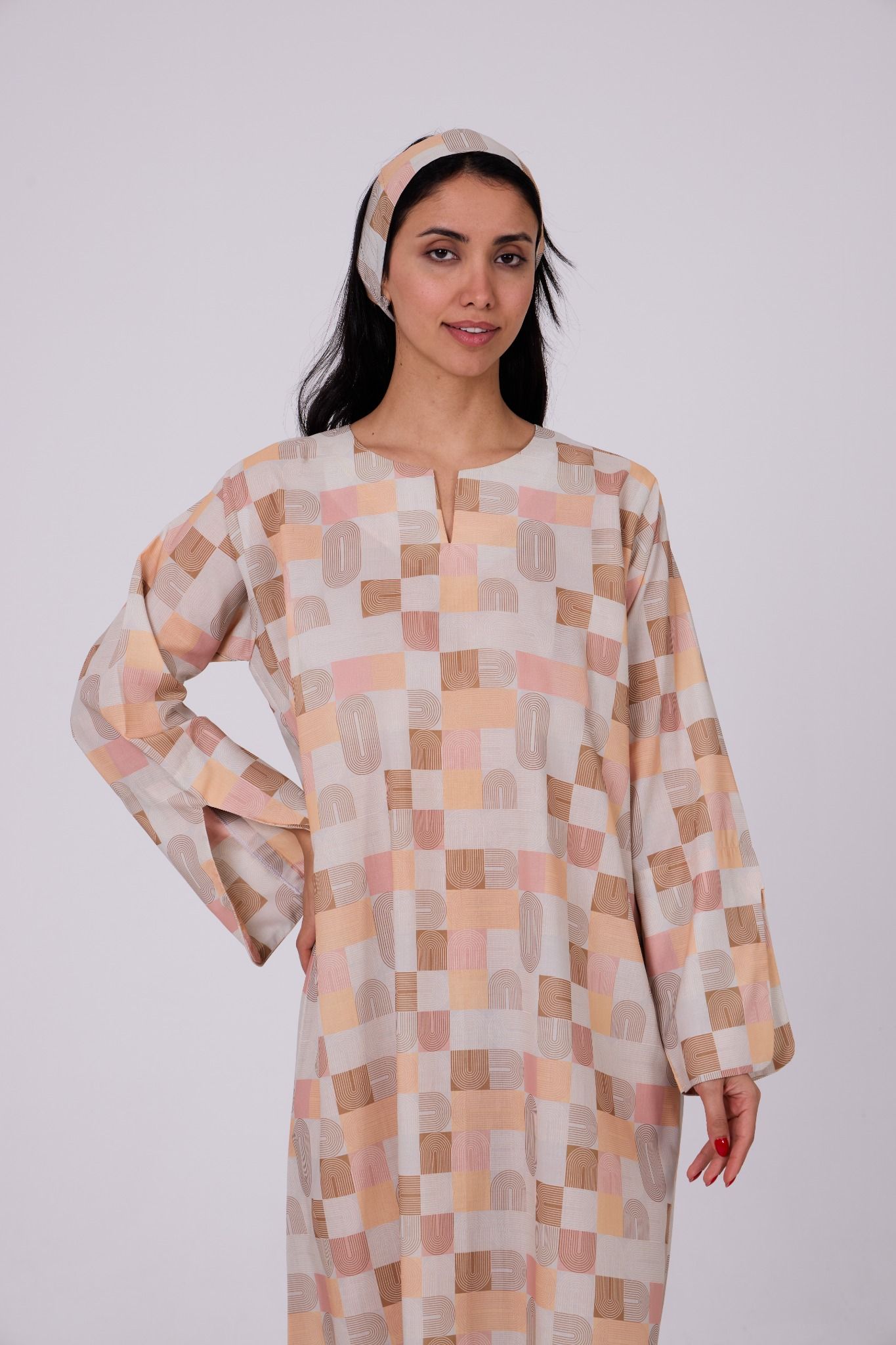 A soft-toned jalabiya crafted in lightweight printed fabric, featuring a modern geometric pattern in warm shades of beige, peach, blush, and sand for a refined contemporary look. Designed in a relaxed straight silhouette, it is finished with a subtle slit neckline that adds a clean and minimal touch. The wide sleeves with slit detailing enhance comfort and movement, making it an effortless piece for everyday elegance. Comes with a matching headband to complete the look.