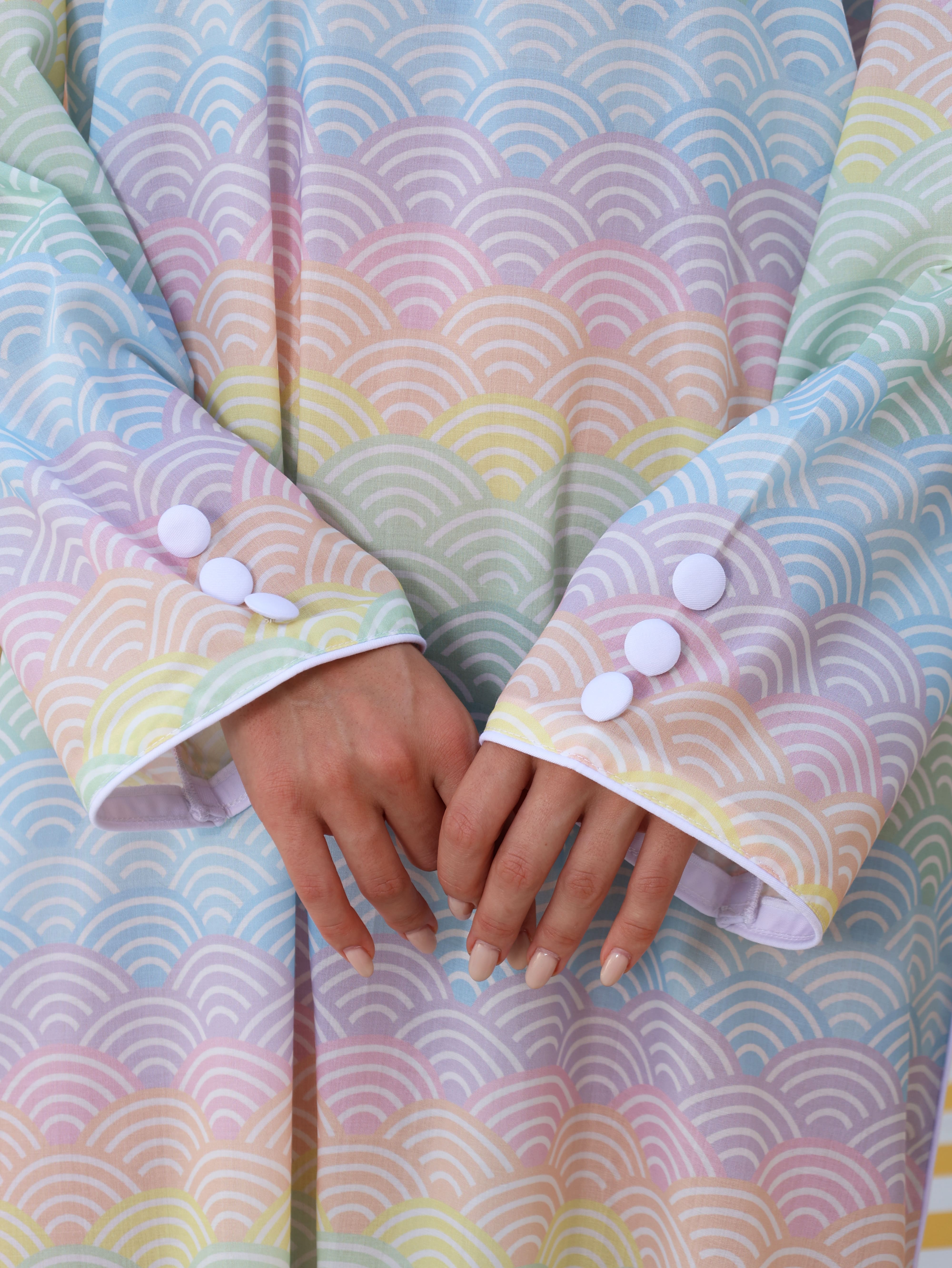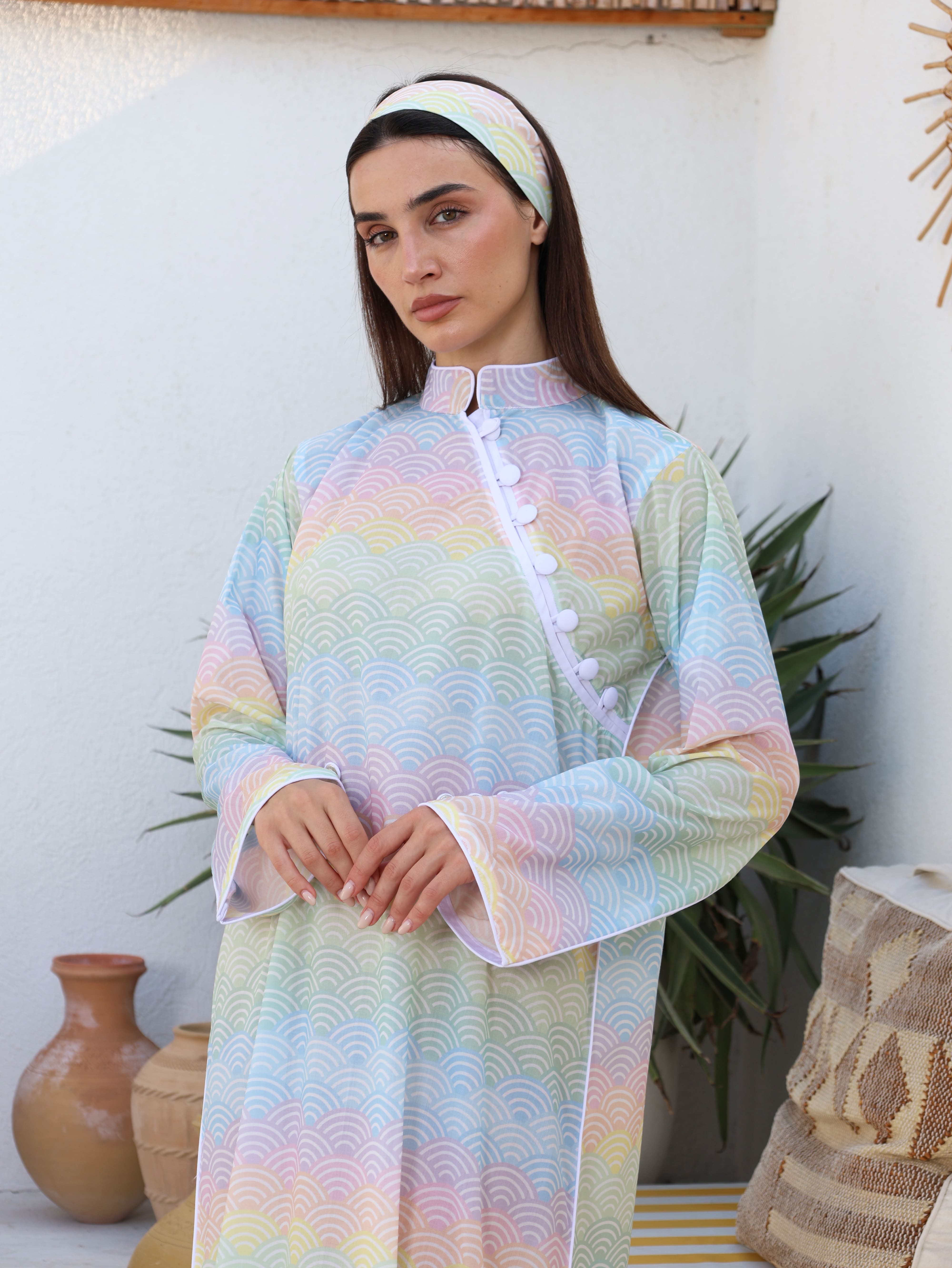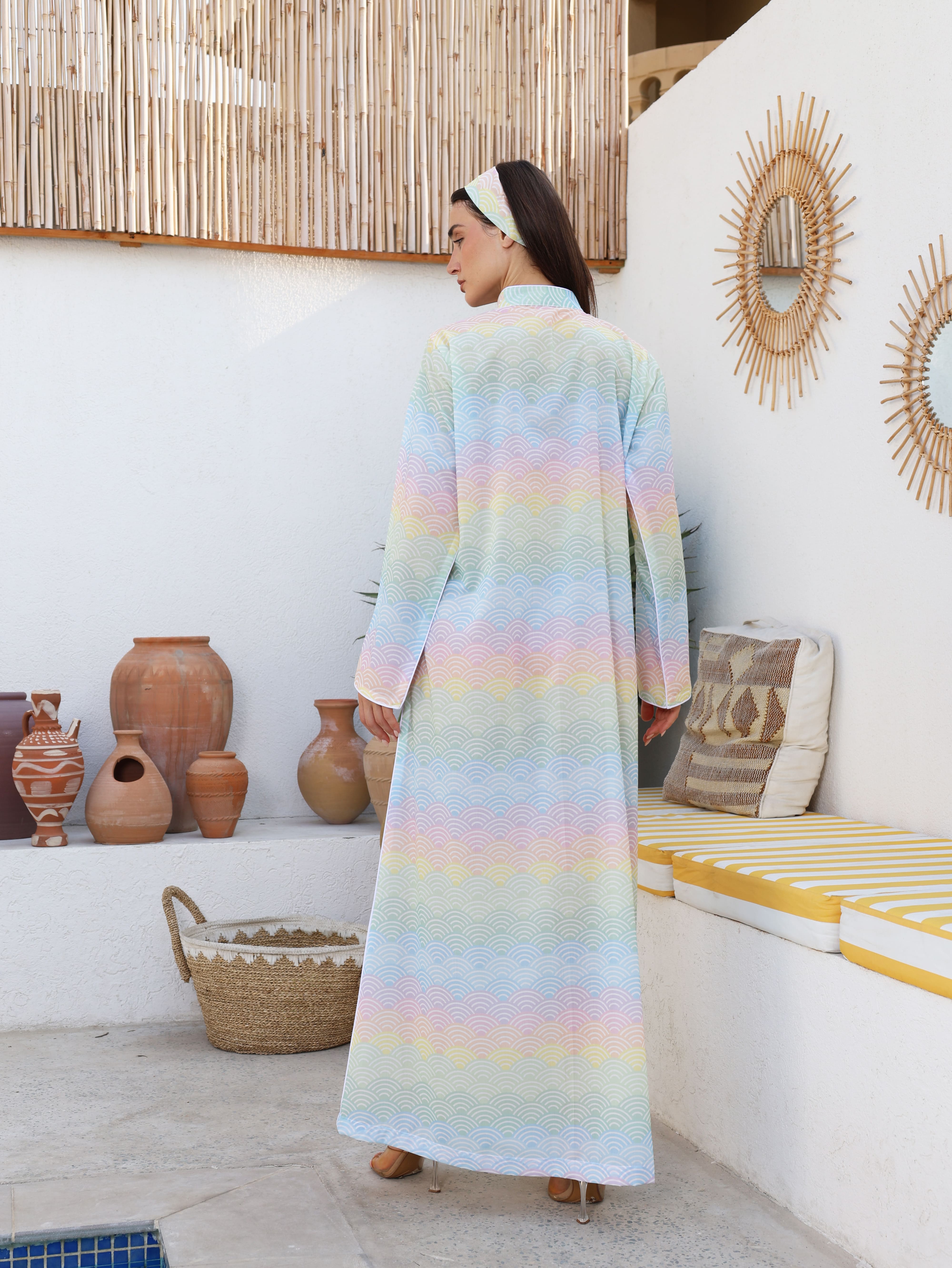 A vibrant rainbow-colored cotton jalabiya featuring a subtle kimono-style neckline for a modern twist. The neckline, sleeves, and sides of the bodice are highlighted with crisp white piping and button detailing, combining playful colours with refined sophistication.