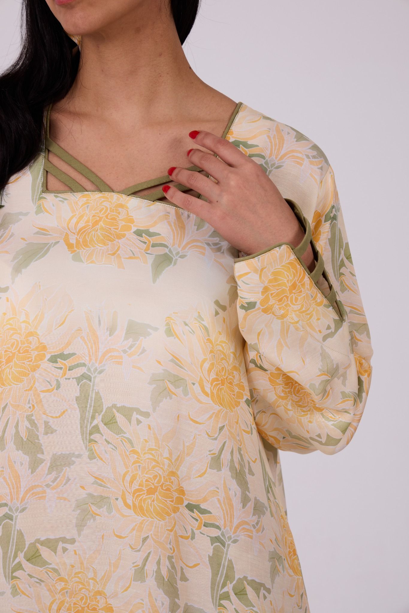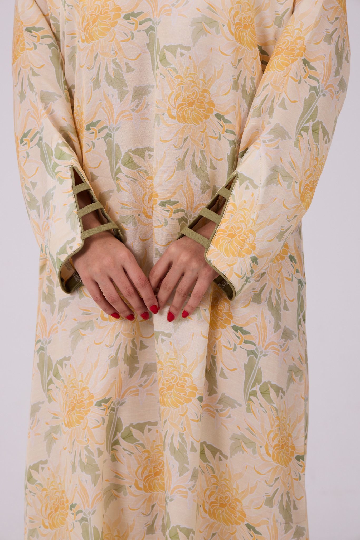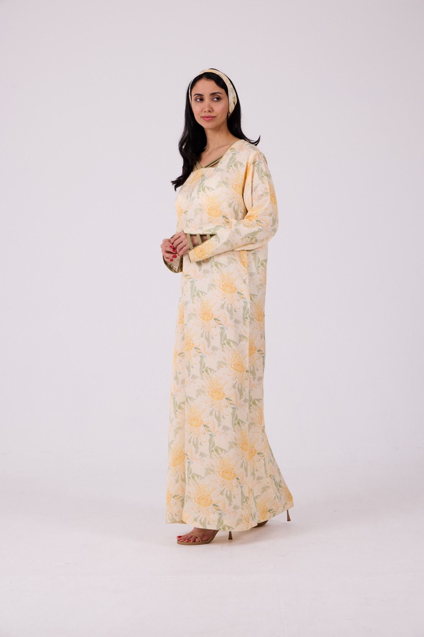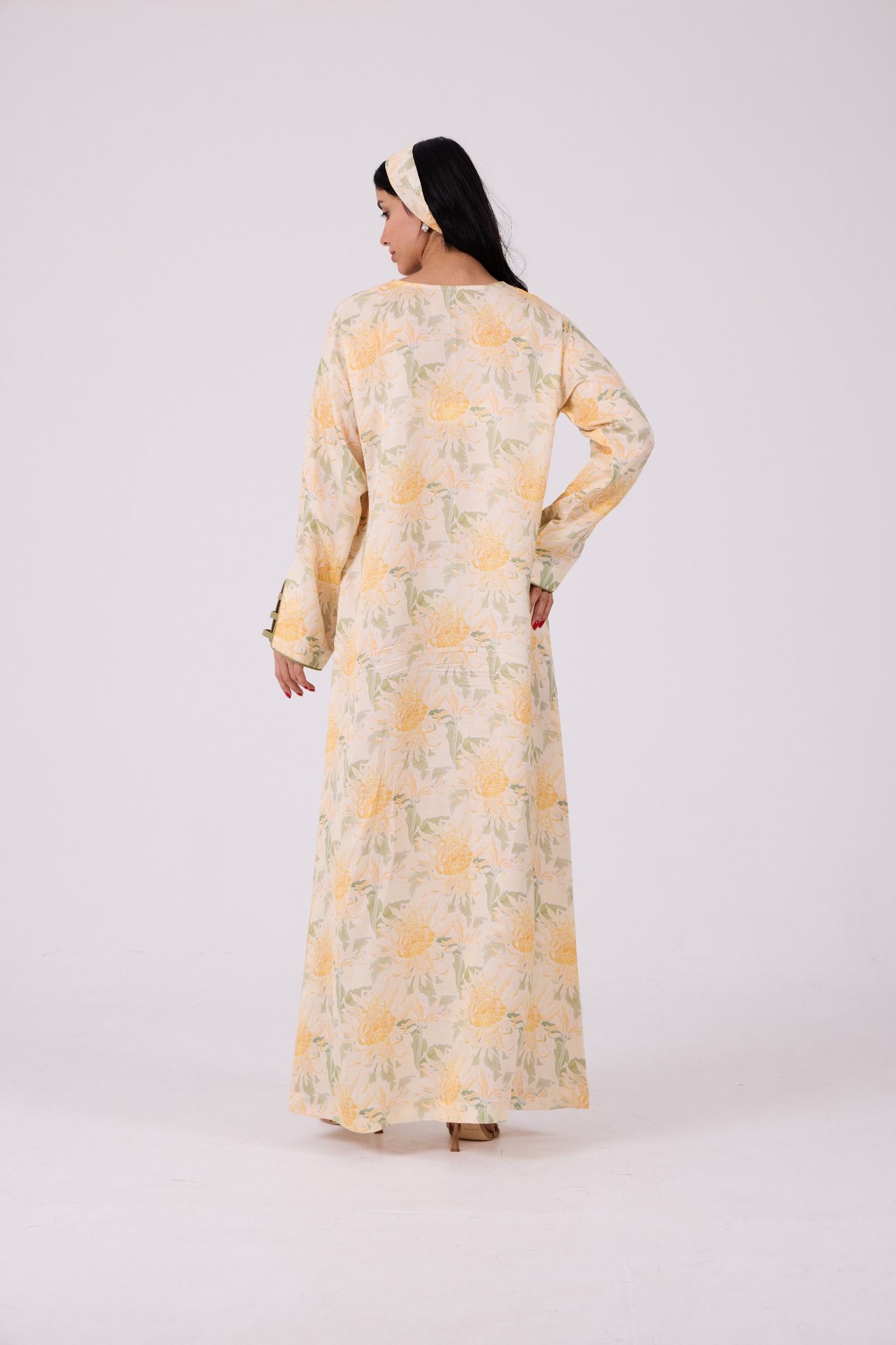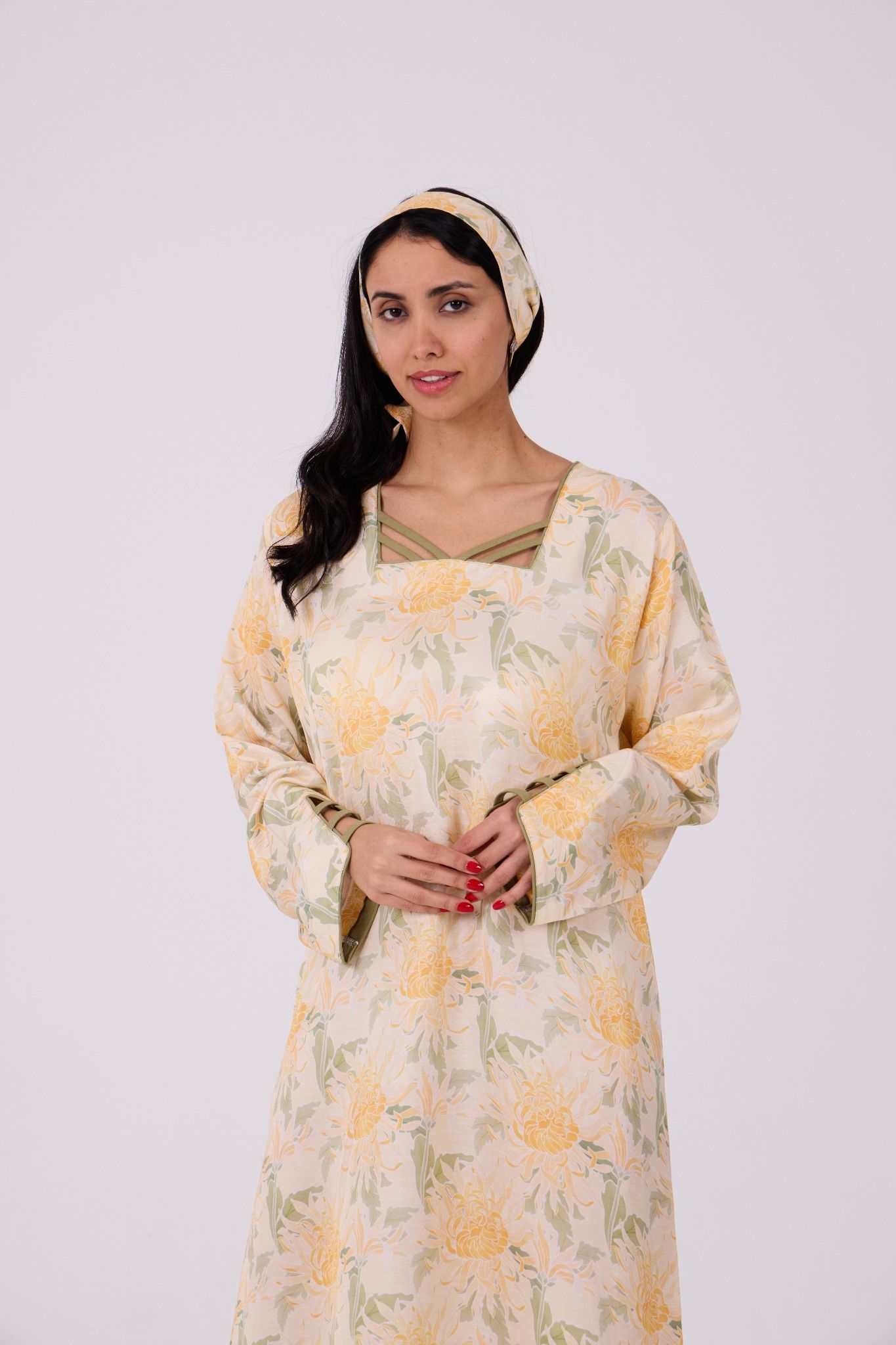 Adorned with a soft floral print in warm shades of yellow, ivory, and muted green, the jalabiya features a graceful square neckline highlighted with delicate criss-cross strap detailing for a refined touch. The relaxed straight silhouette and wide sleeves ensure effortless movement, making it ideal for everyday wear with a polished finish.