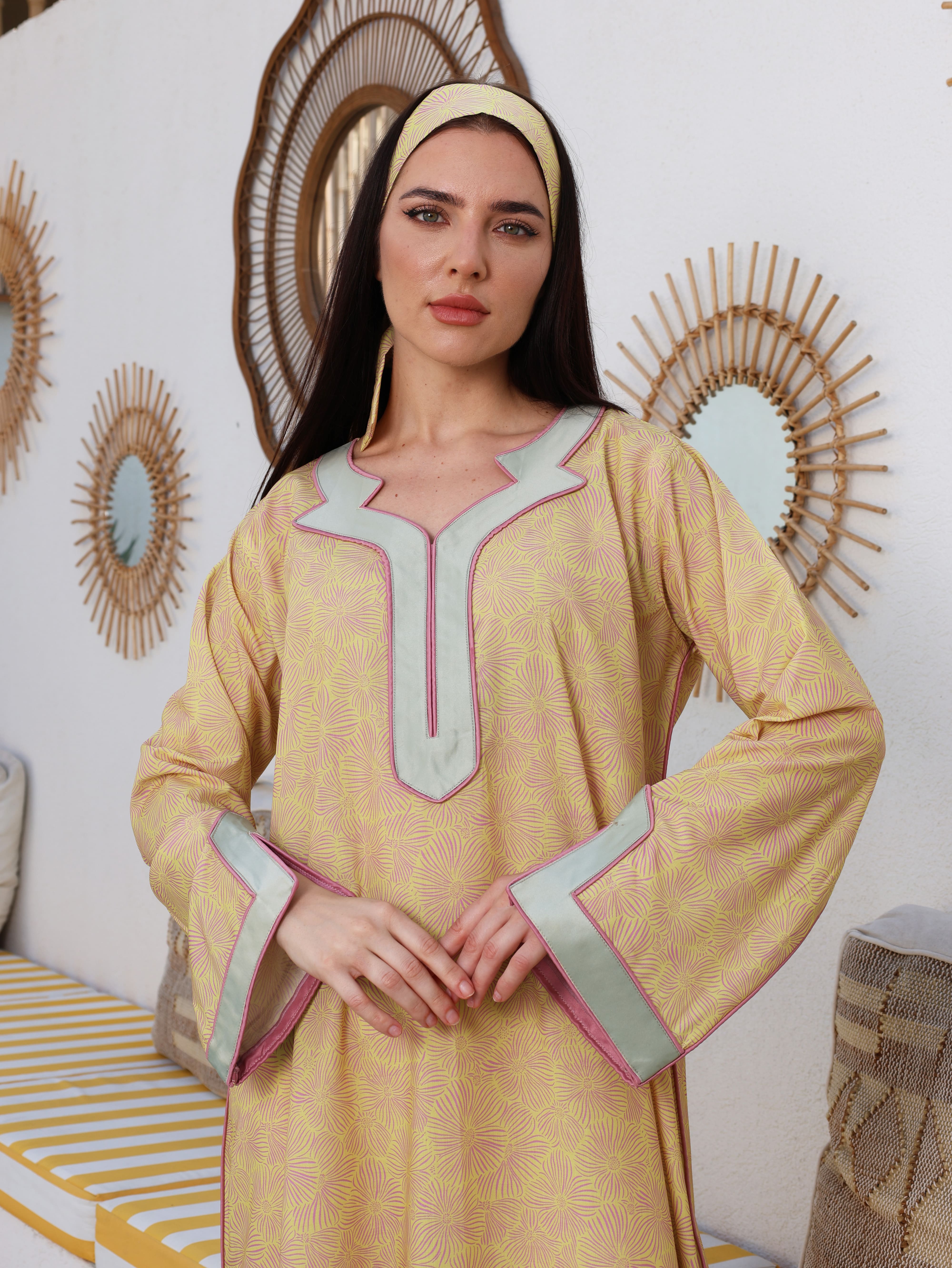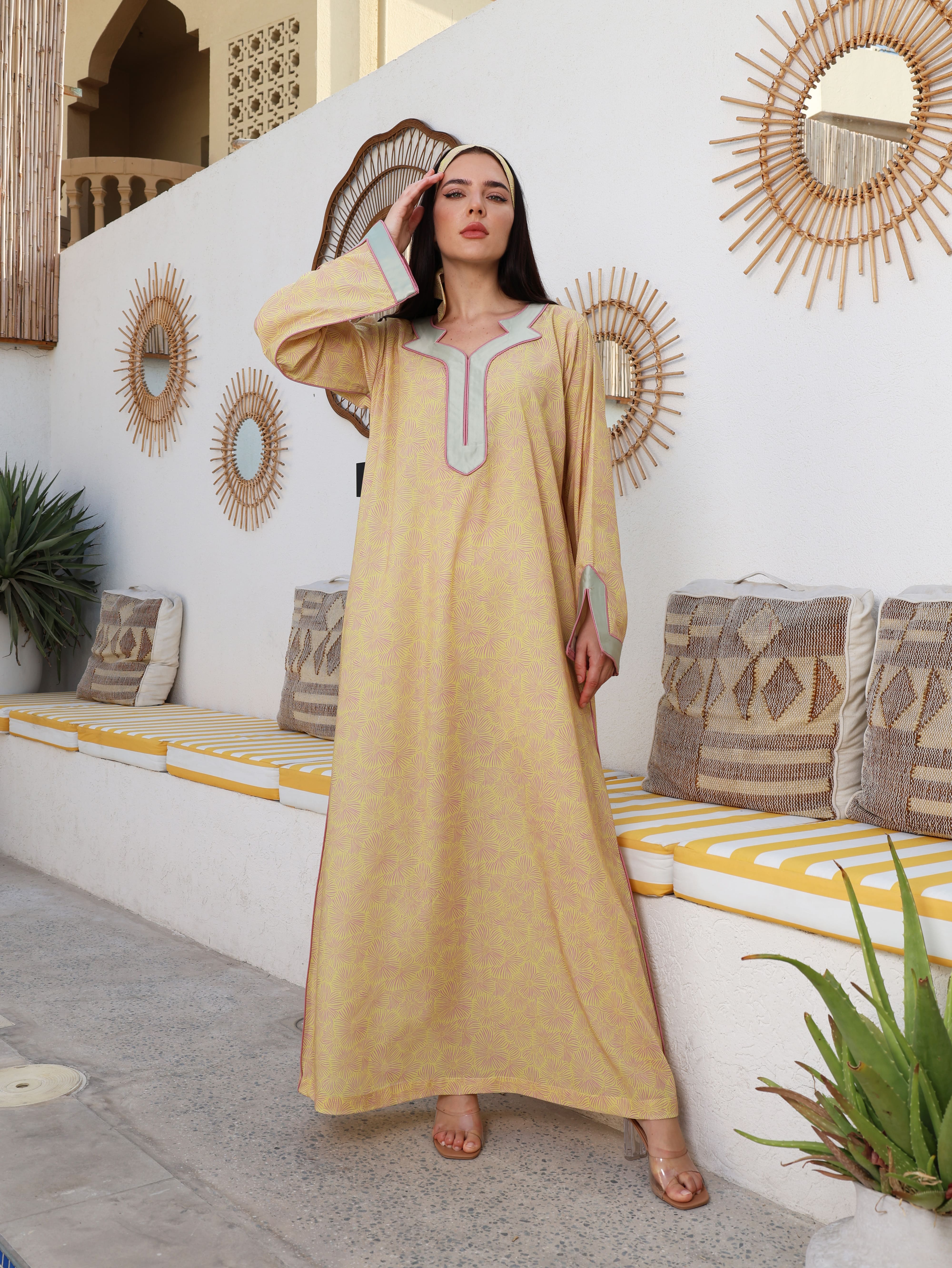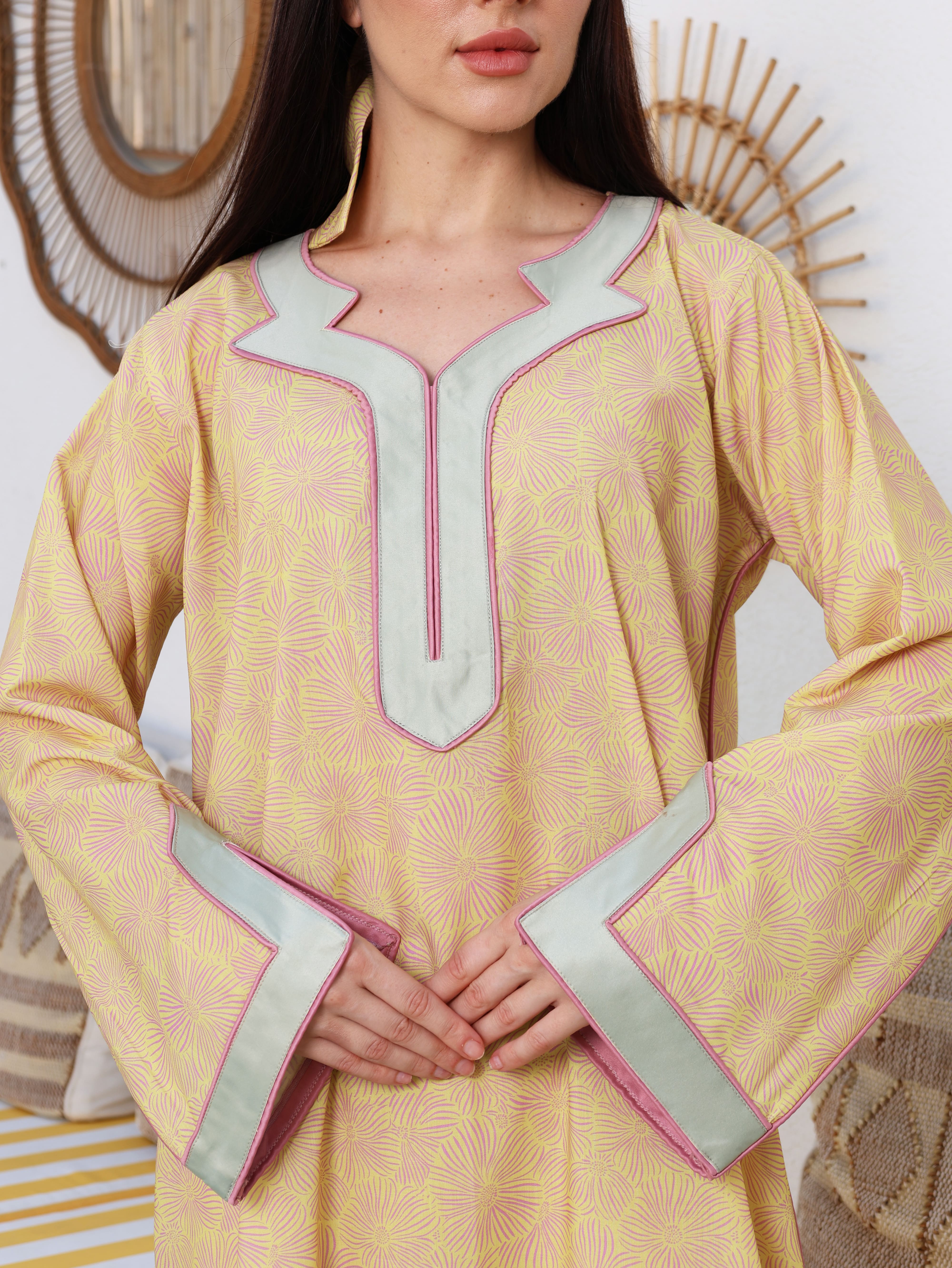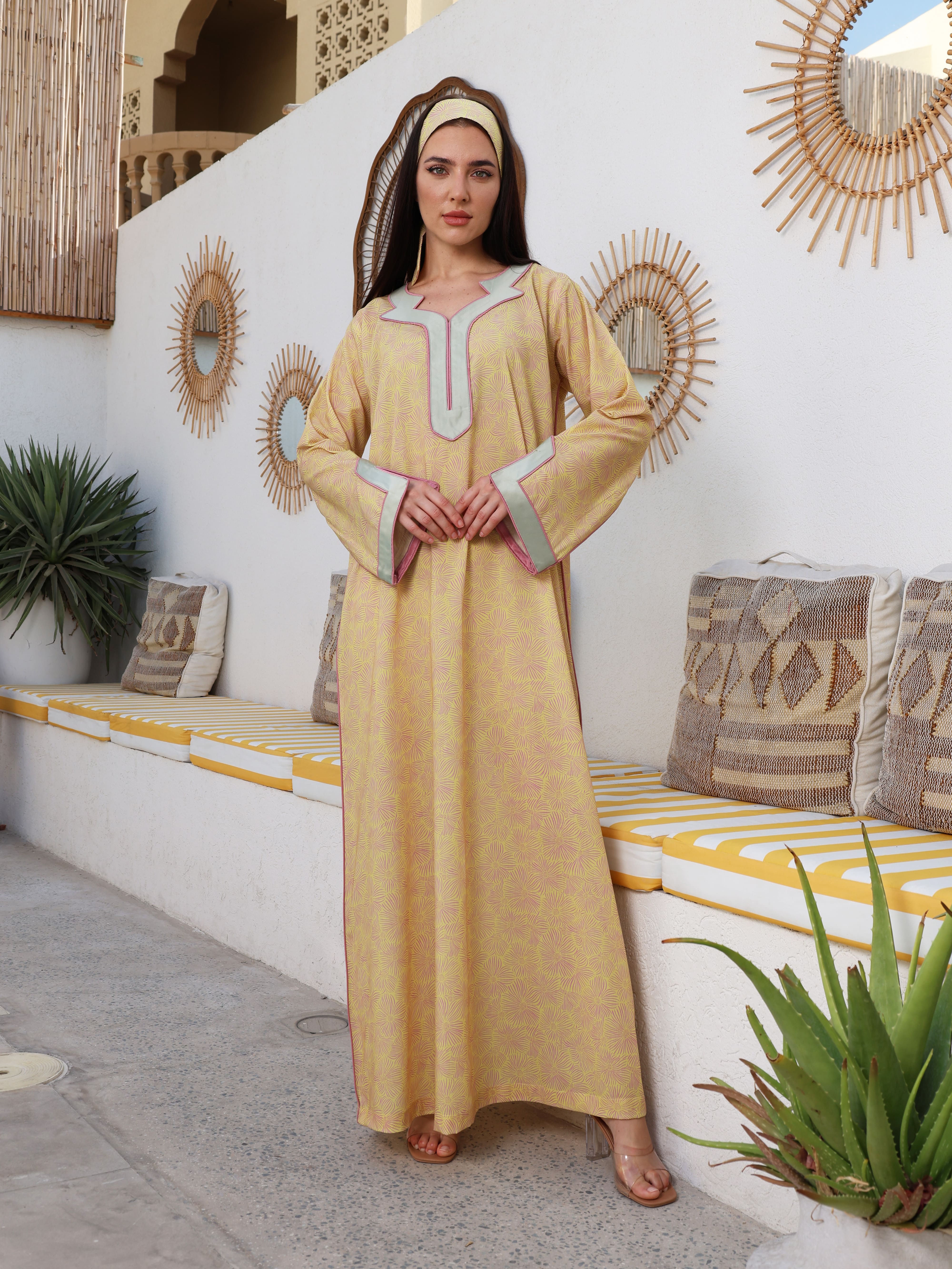 A cheerful yellow cotton jalabiya adorned with delicate floral prints, radiating warmth and elegance. The neckline and sleeves are accentuated with mint green binding and subtle pink piping, creating a harmonious blend of soft, refreshing tones.