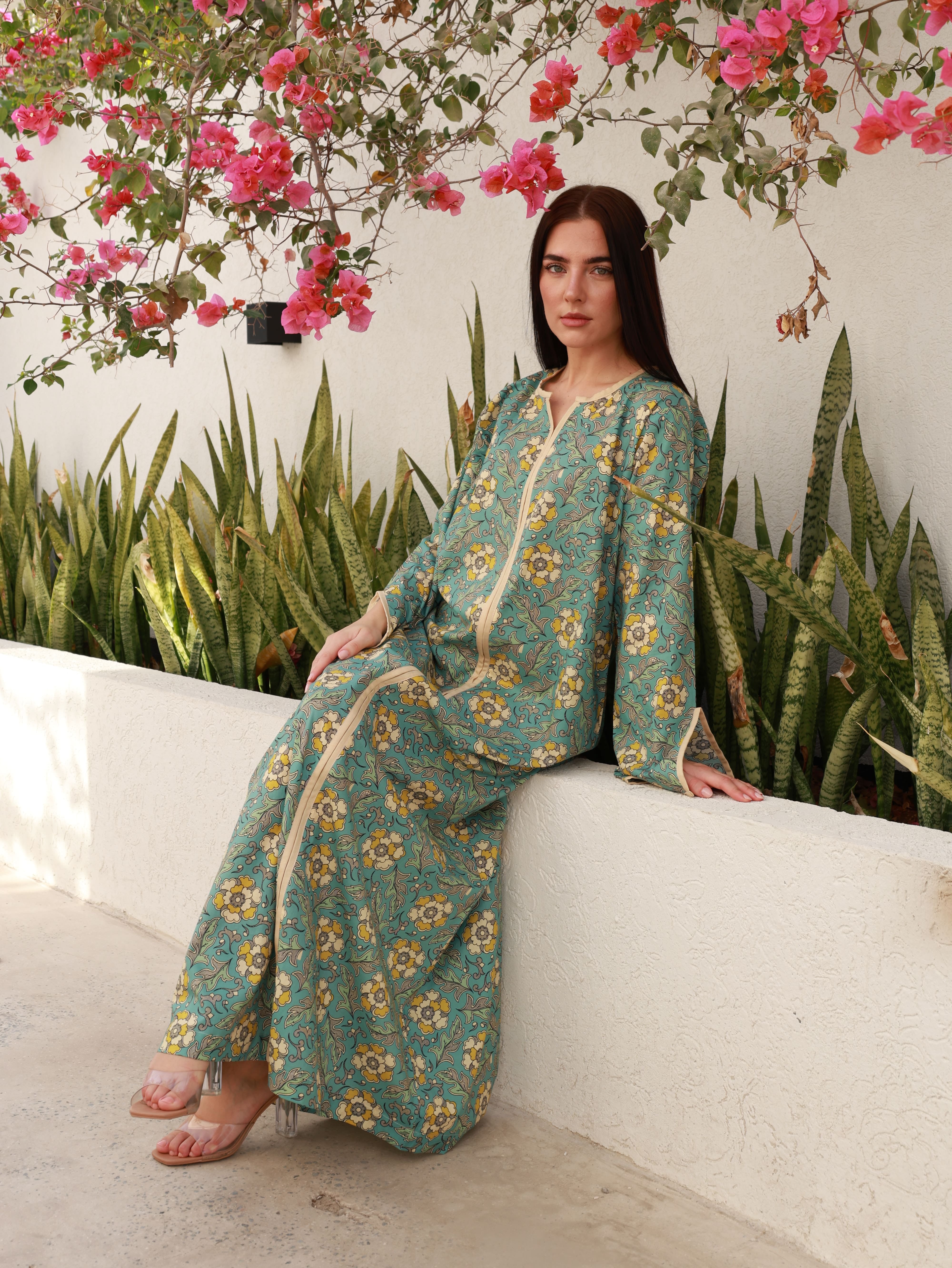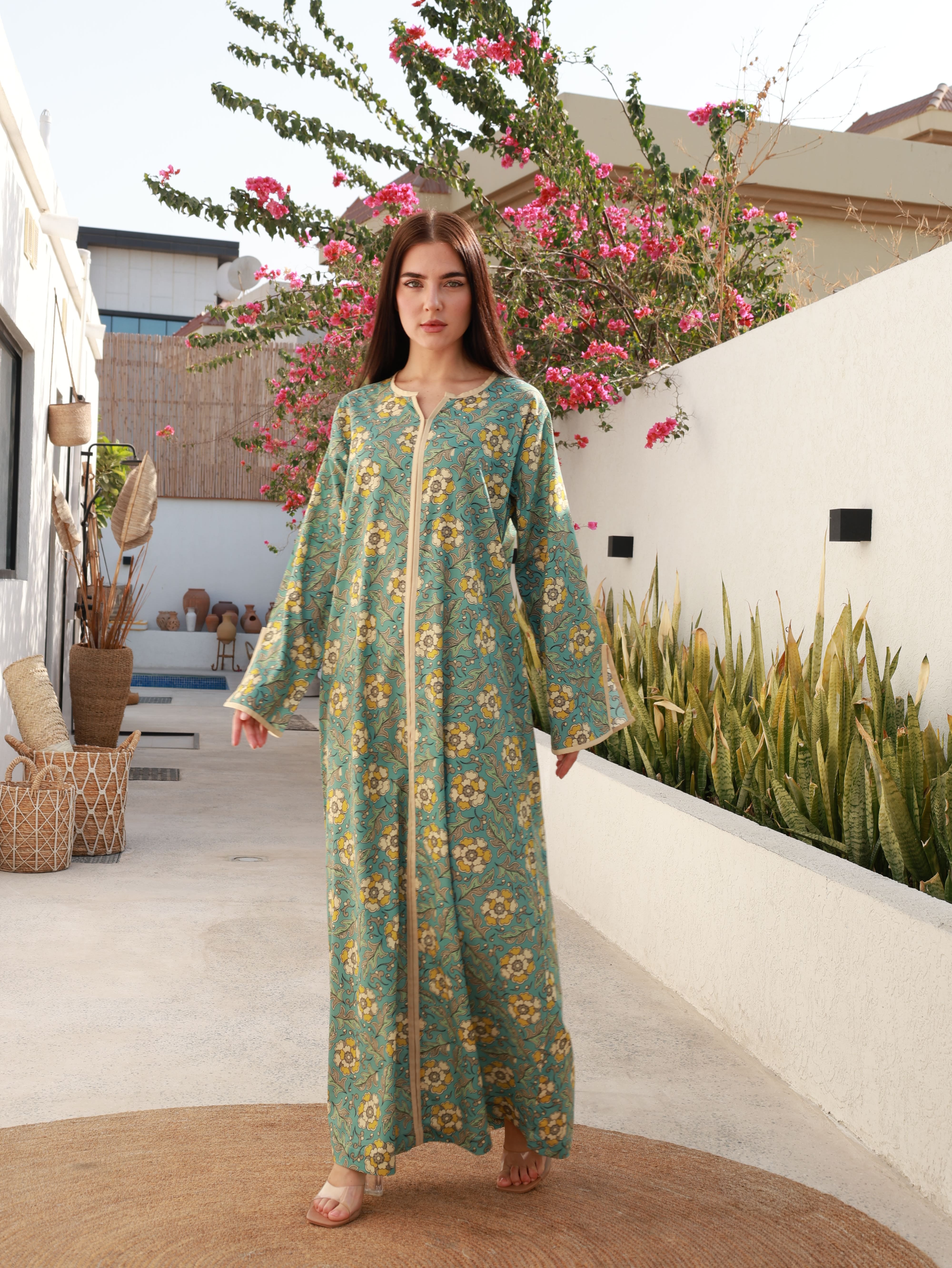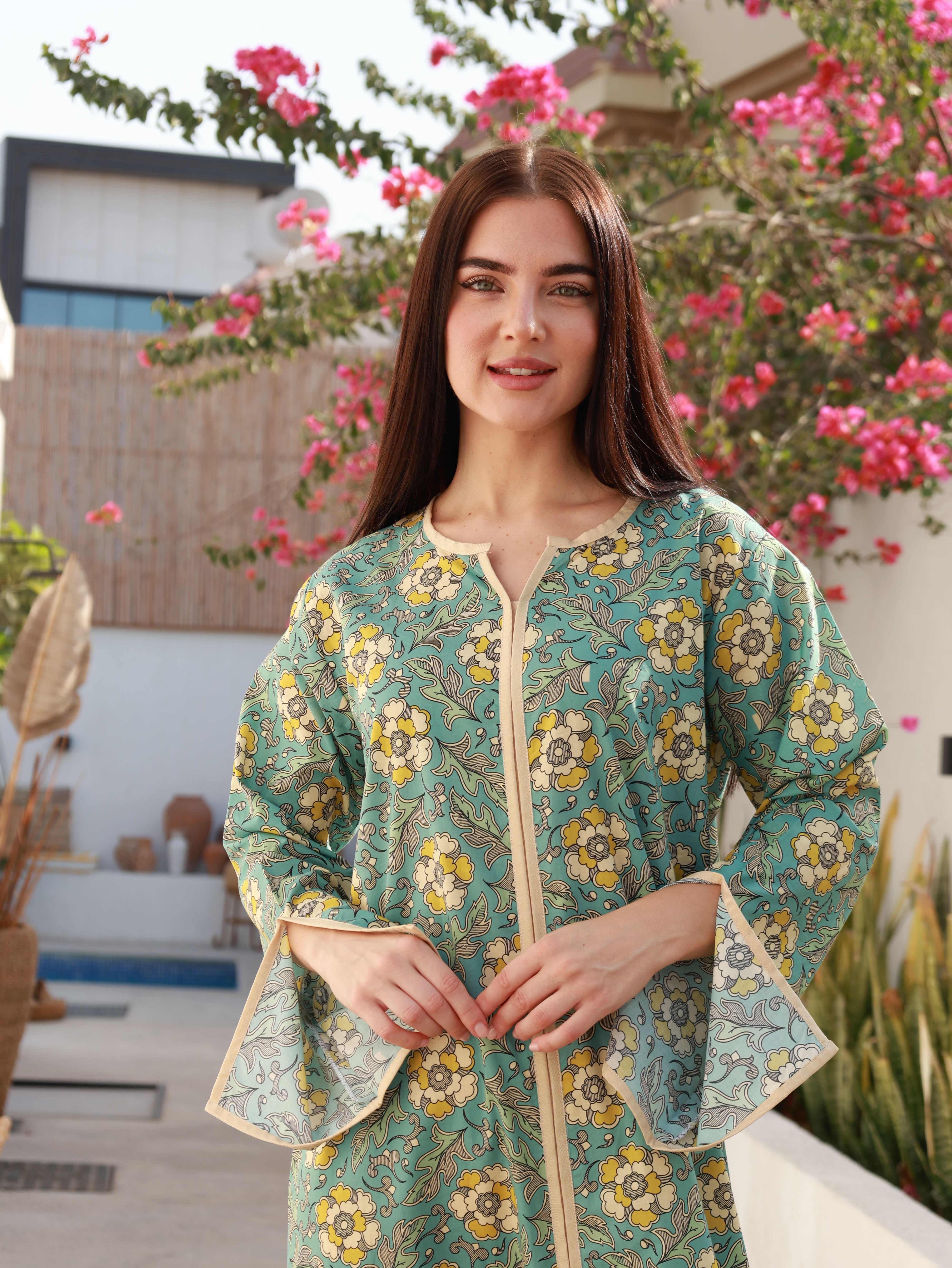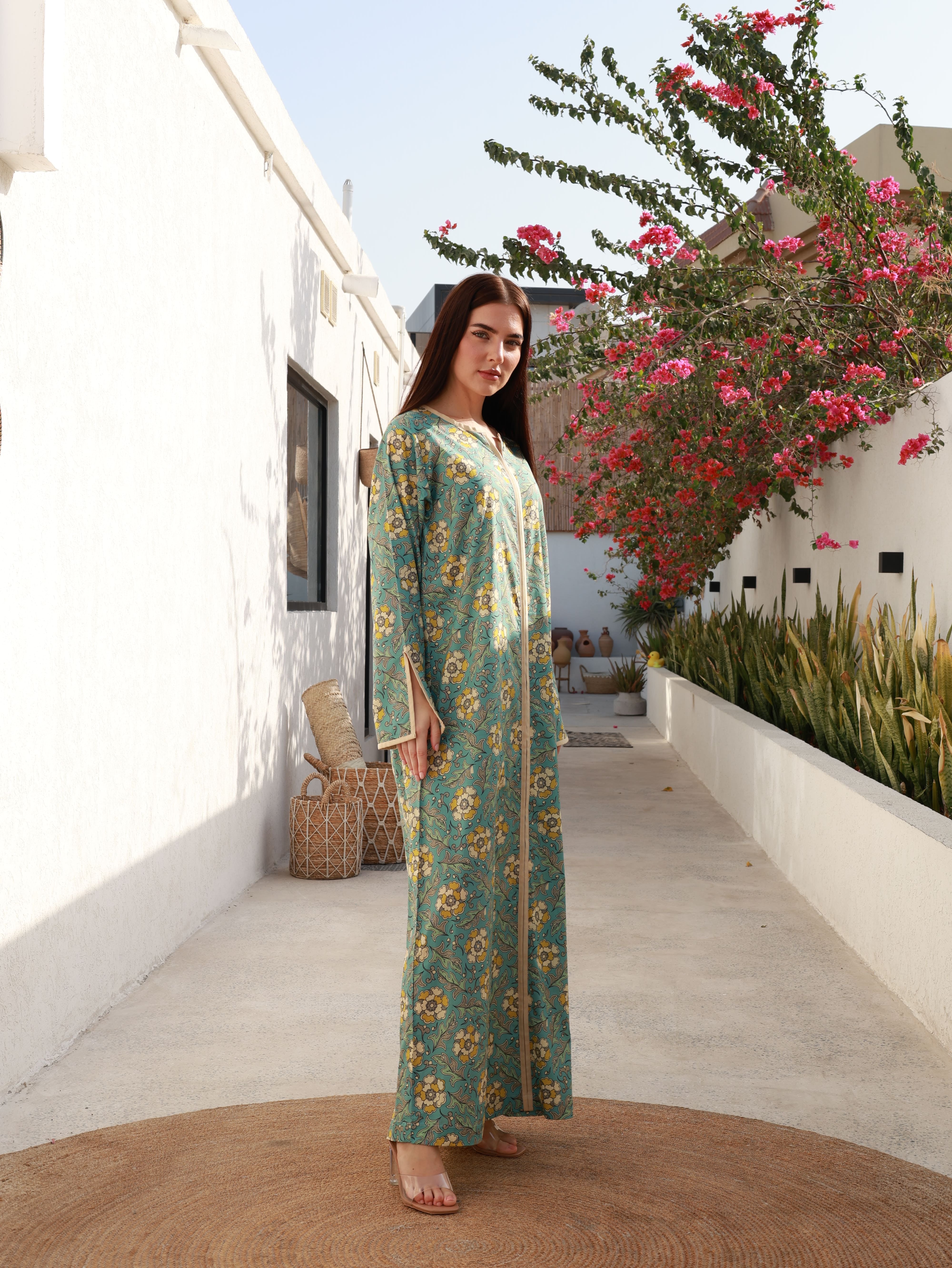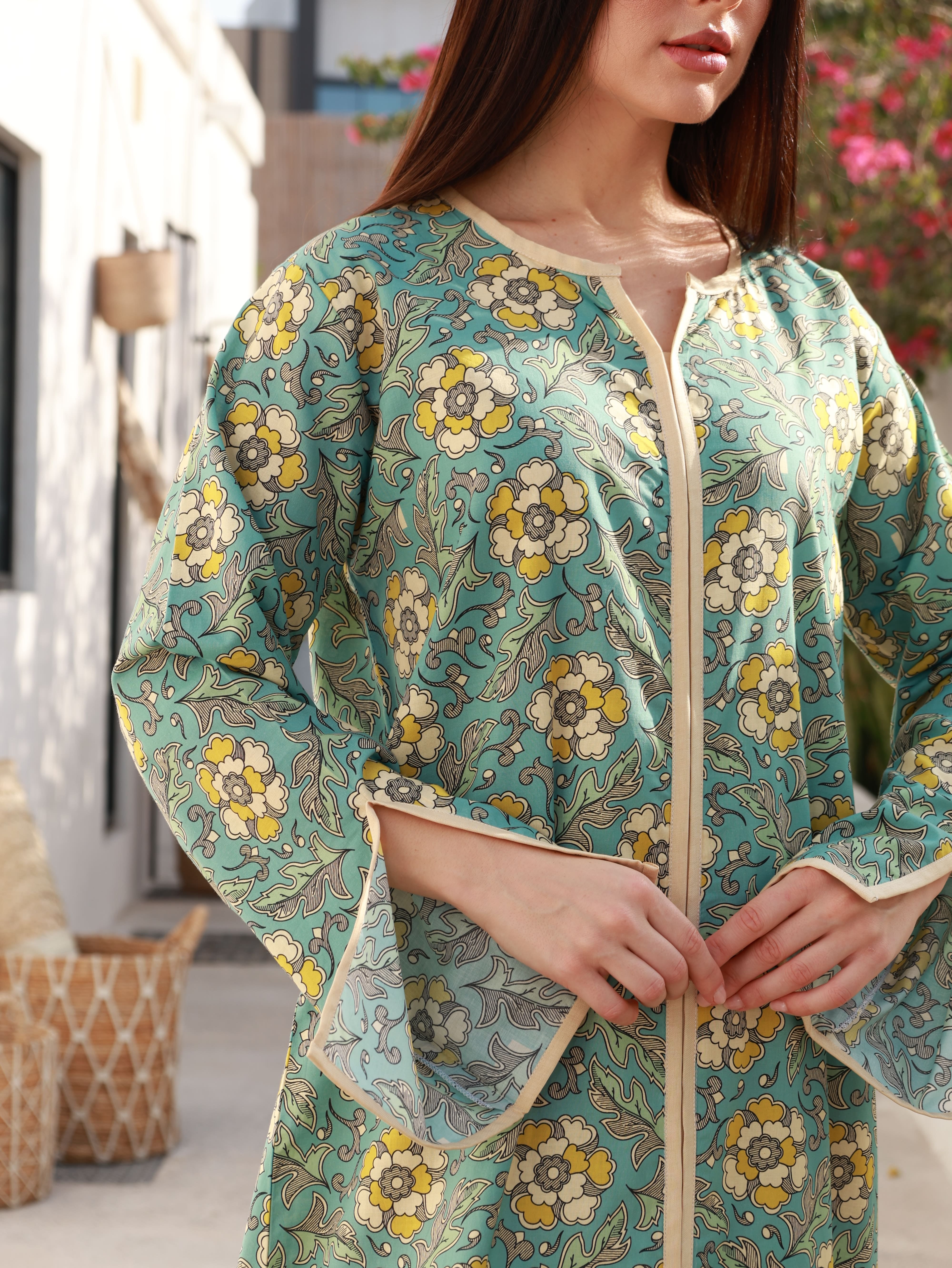 A fresh green cotton jalabiya in delicate floral print, featuring front slits on the sleeves and bold piping along the neckline, hem, and sleeves, combining casual comfort with a stylish, contemporary edge.